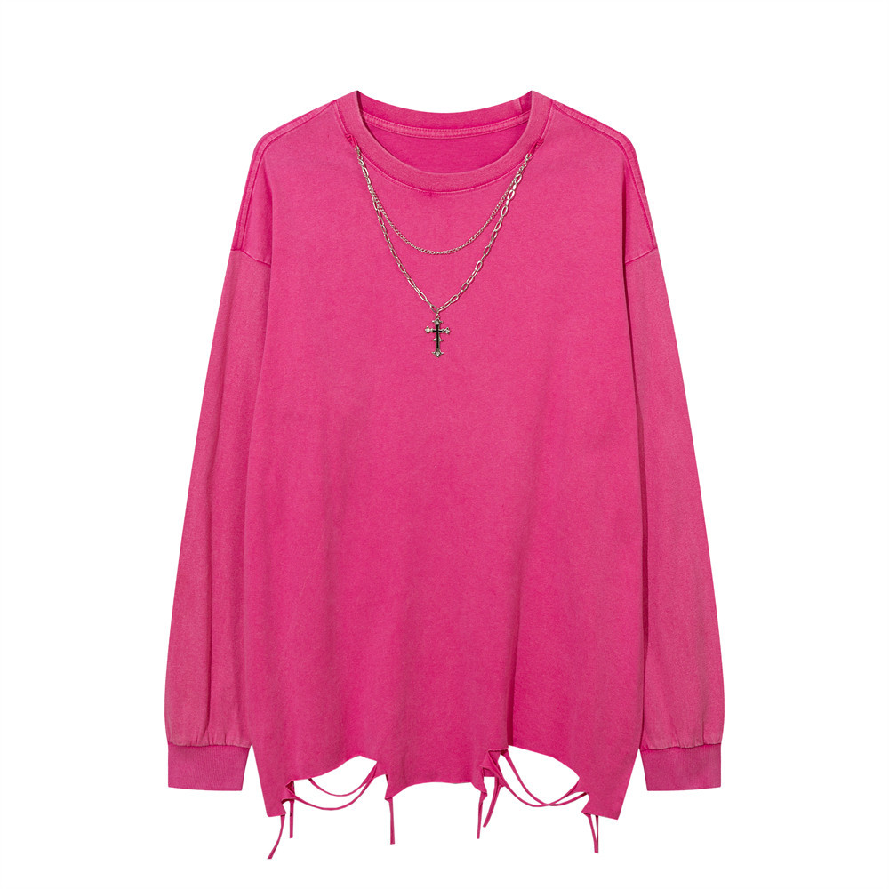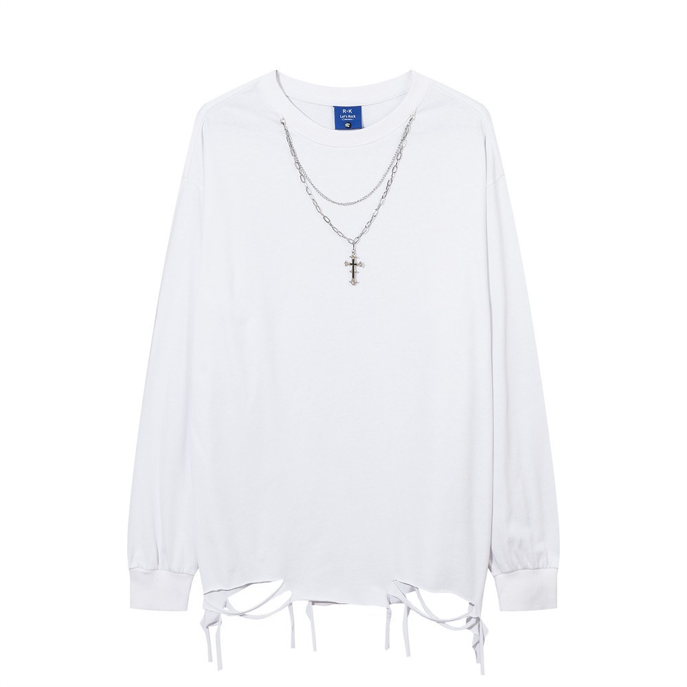고민 더러운 긴 소매 티셔츠 남자의 유행 브랜드 펑크 게으른 밑단 잘라 썩은 구멍 목걸이 장식 탑 봄과 가을