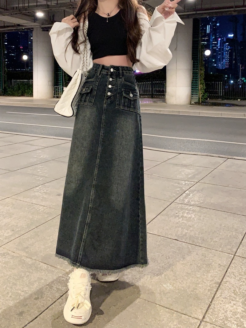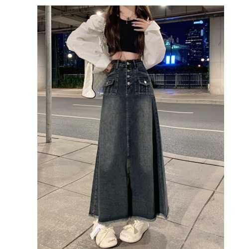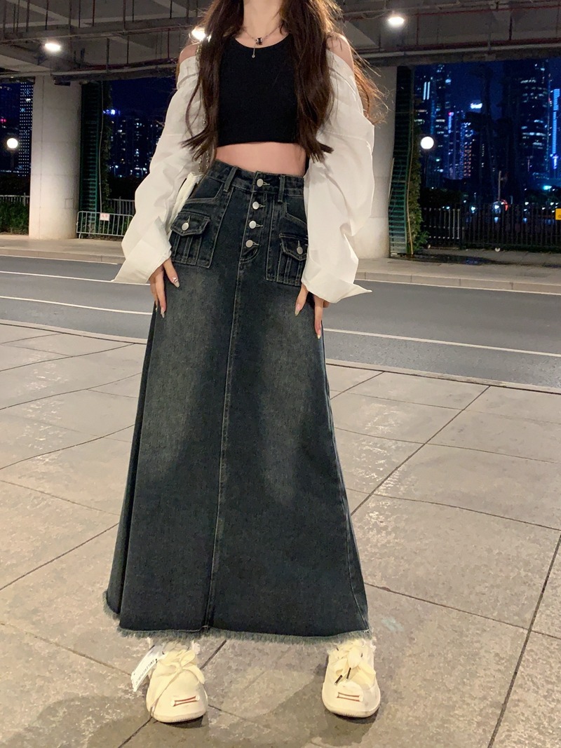 블루 홍콩 스타일 하이 웨이스트 모피 가장자리 데님 스커트 가을 여성의 복고풍 스커트 A-라인 스커트 디자인 틈새 롱 스커트스토어 가기