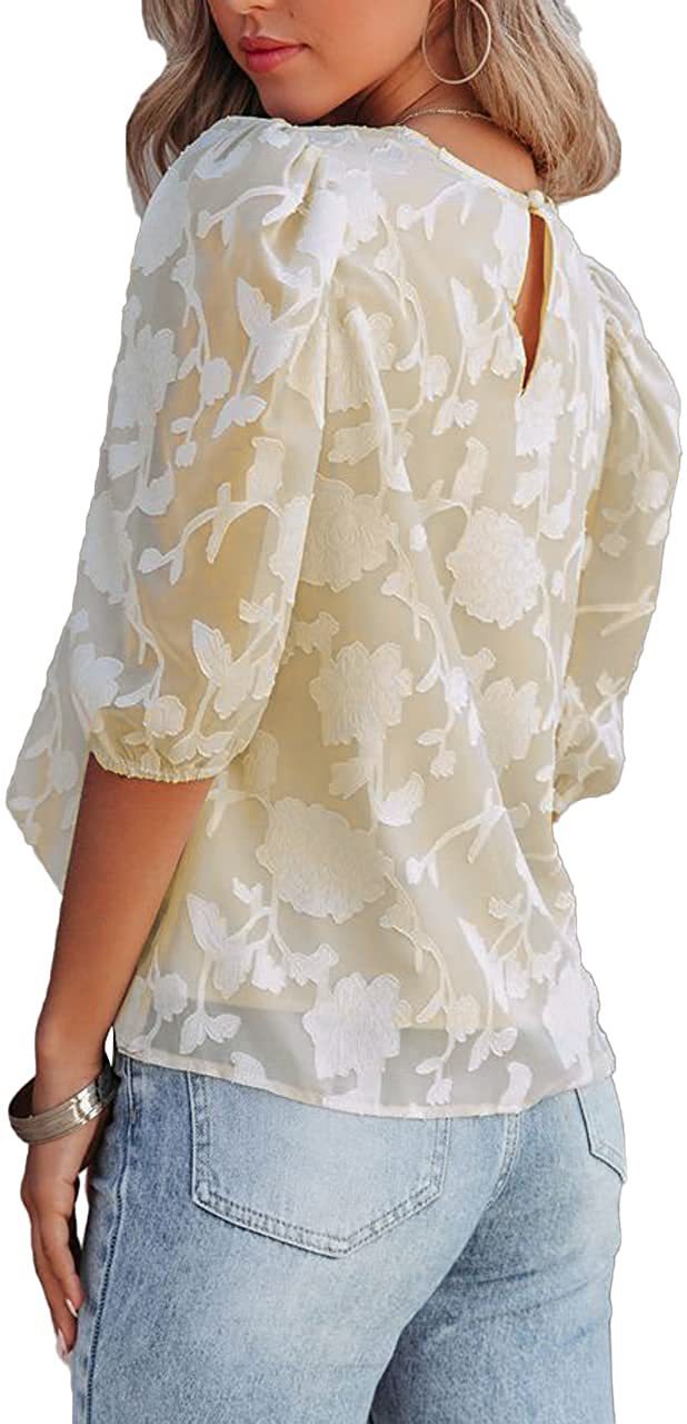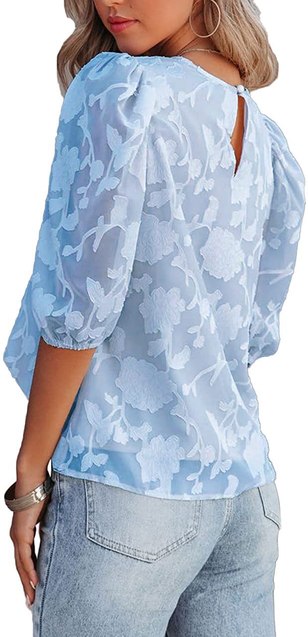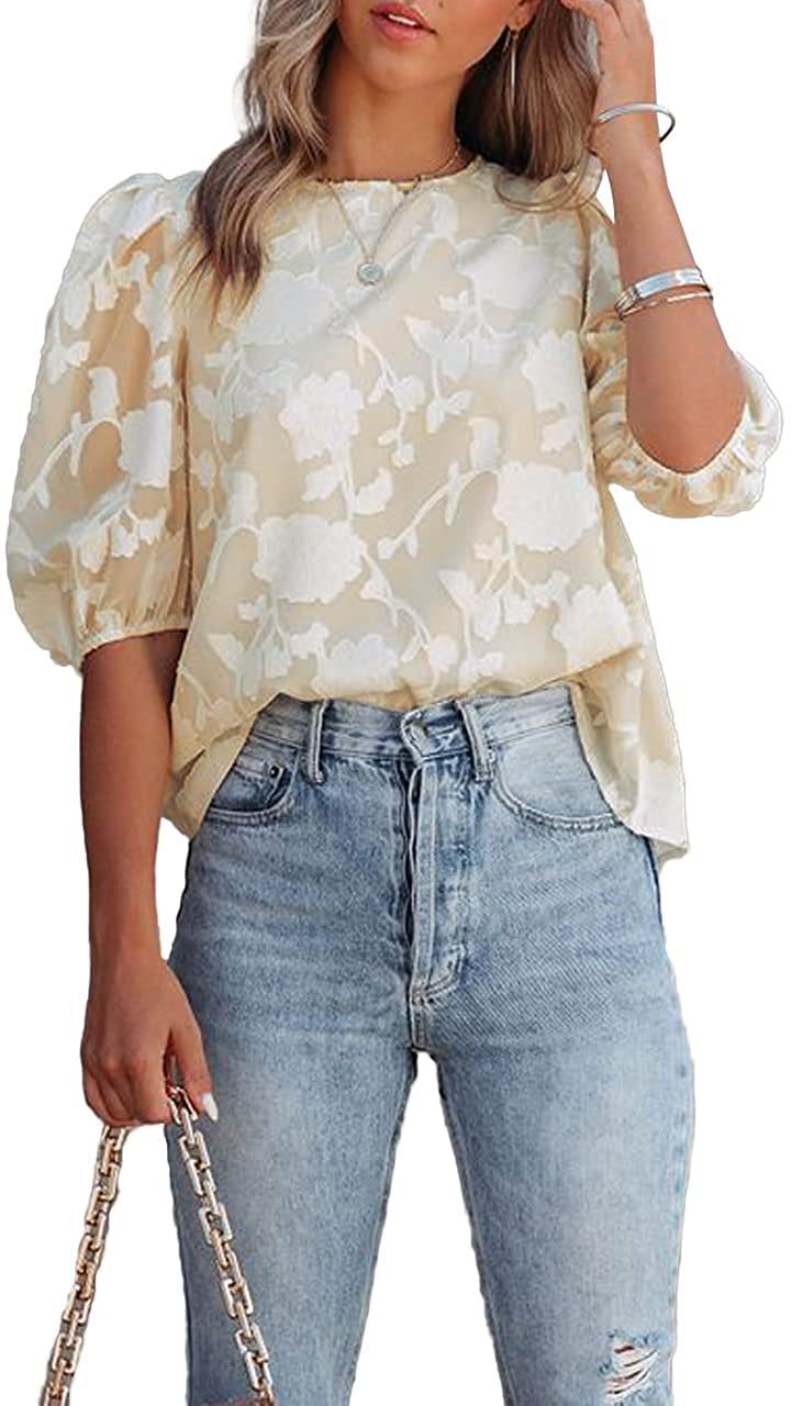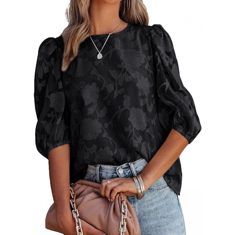 봄과 여름 2023 아마존 유럽과 미국 국경 여성 쉬폰 셔츠 꽃 버블 슬리브 유행 라운드 넥 루즈 탑