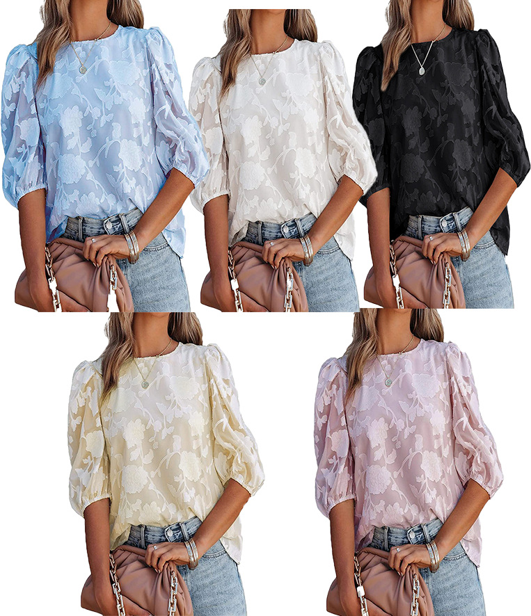 봄과 여름 2023 아마존 유럽과 미국 국경 여성 쉬폰 셔츠 꽃 버블 슬리브 유행 라운드 넥 루즈 탑스토어 가기