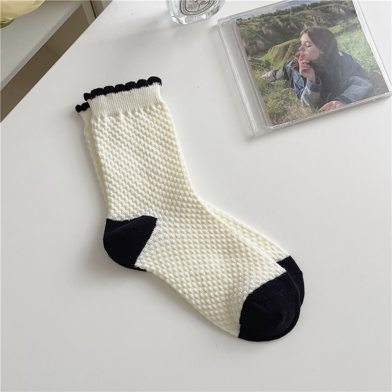 일본식 흑백 스트라이프 중간 길이 양말 복고풍 질감 감각 버블 격자 양말 여성용 로리타 여성 양말 심플 스택 양말