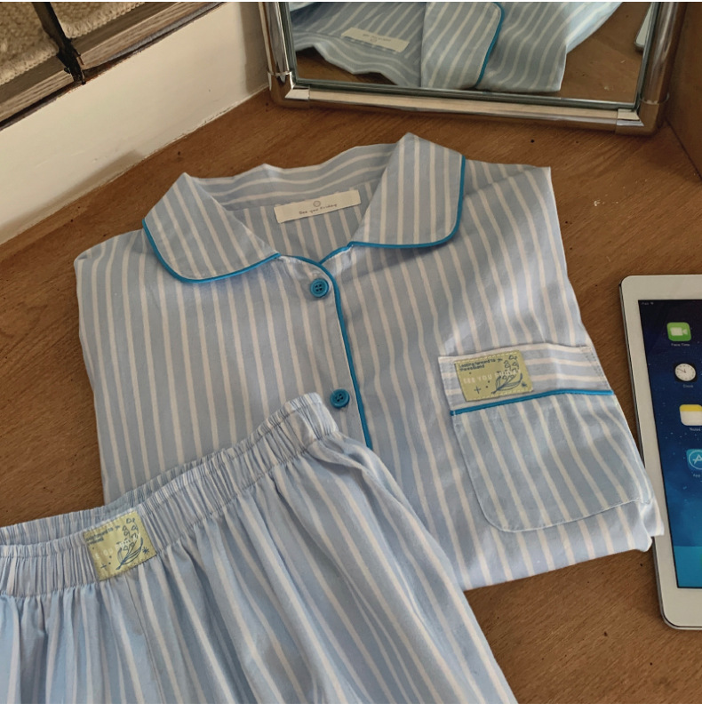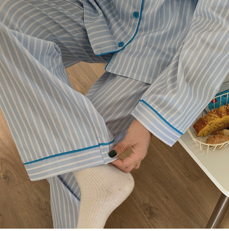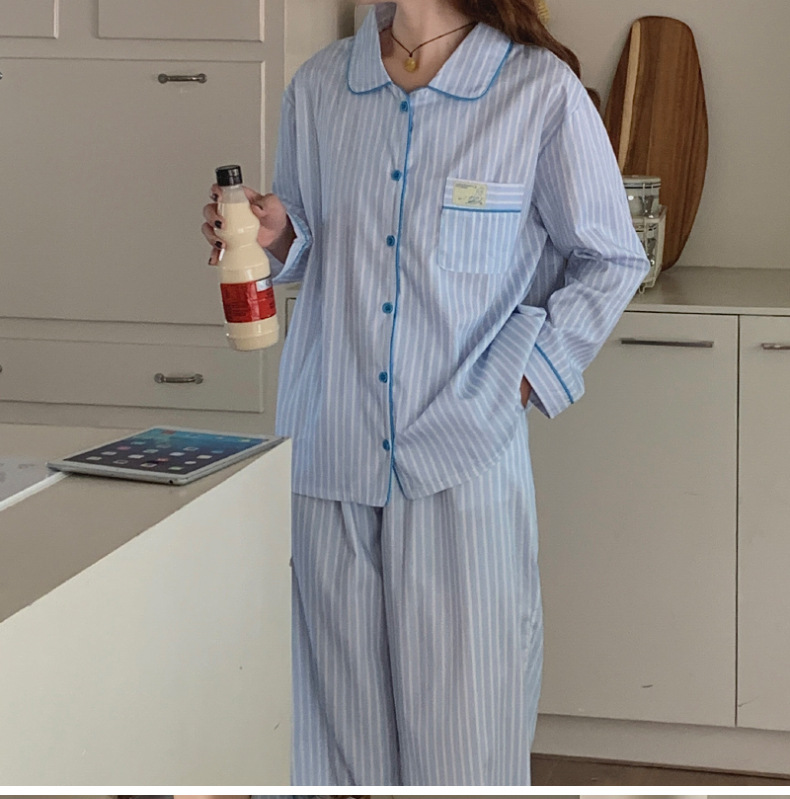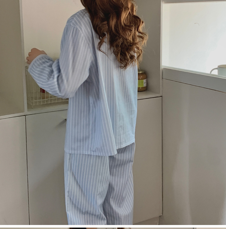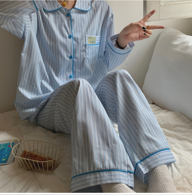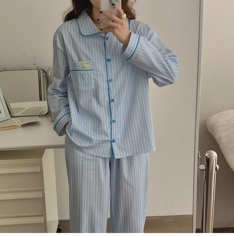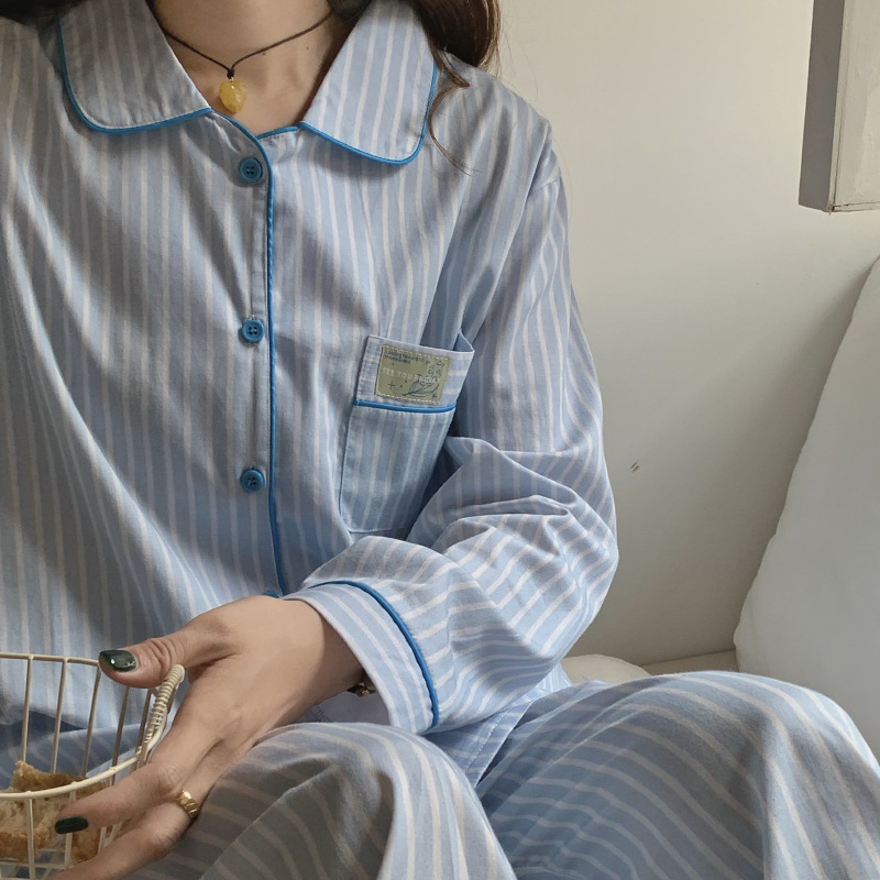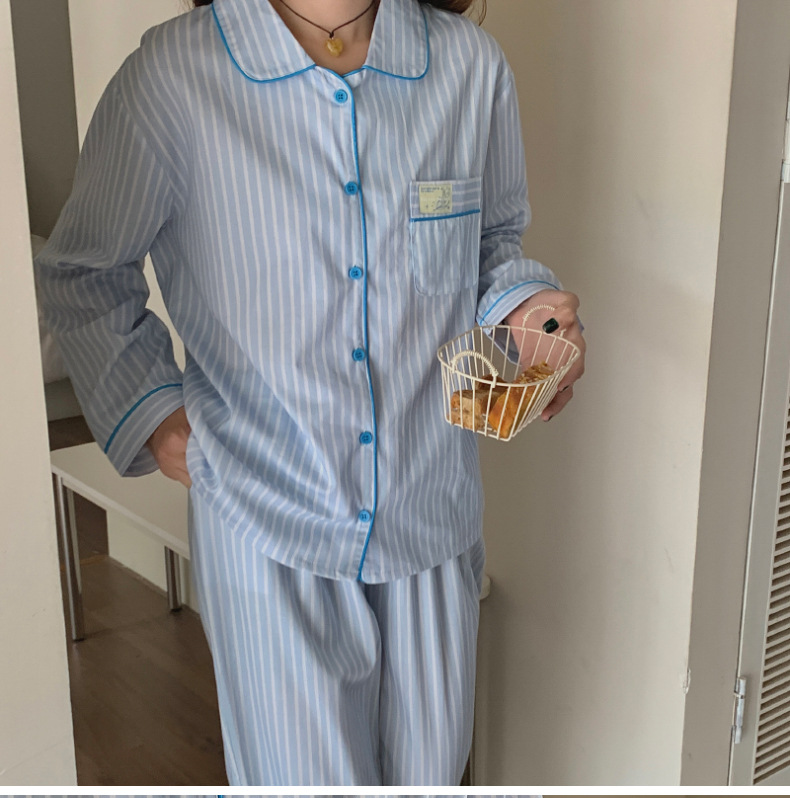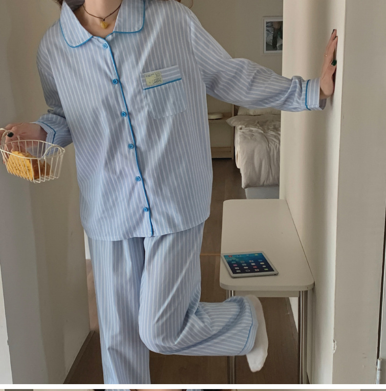 한국 리얼 샷 블루 스트라이프 잠옷 여자의 긴 소매 가을 고강도 면 능 직물 옷깃 가정 옷 인스 타 그램 스타일 새로운 도착