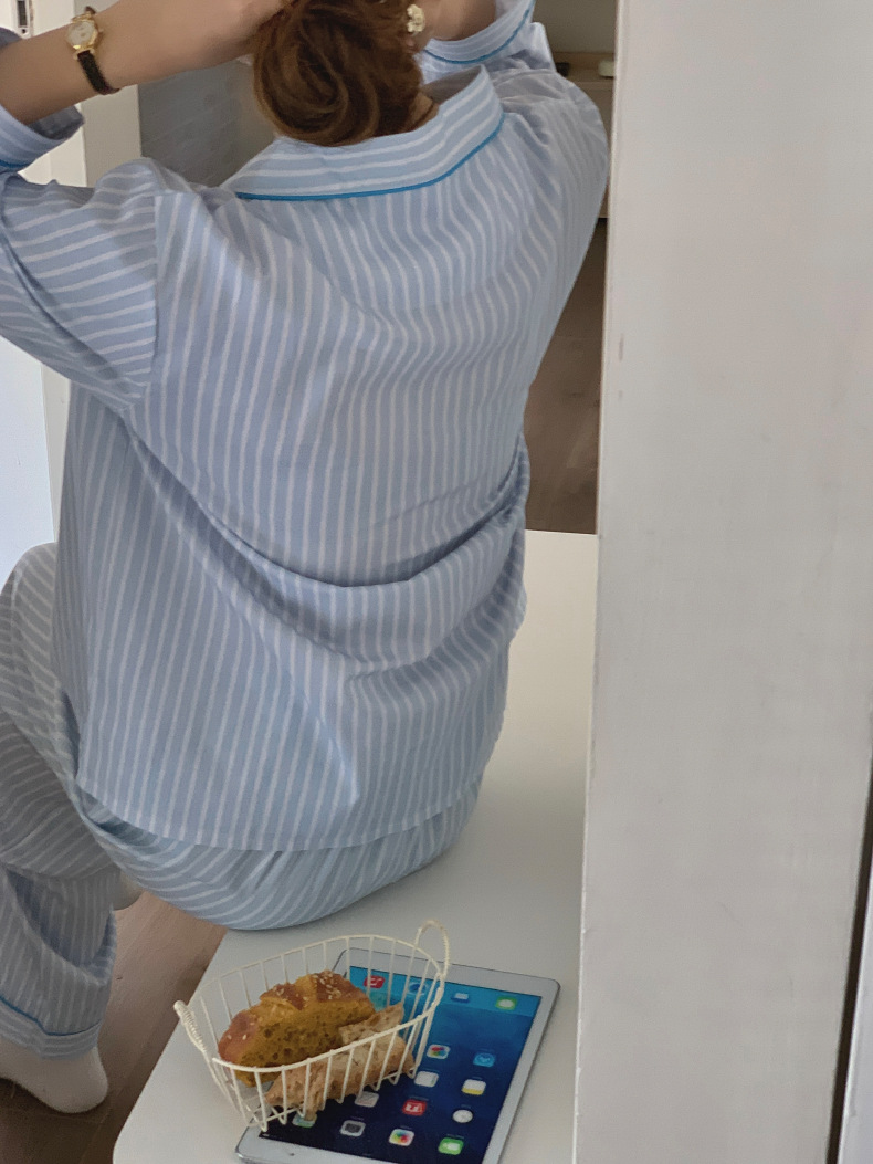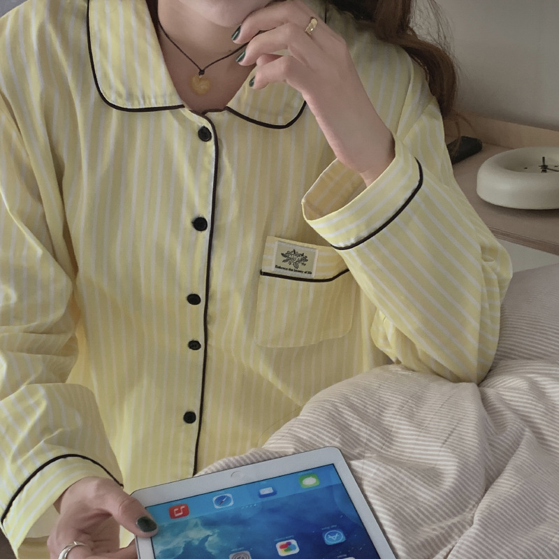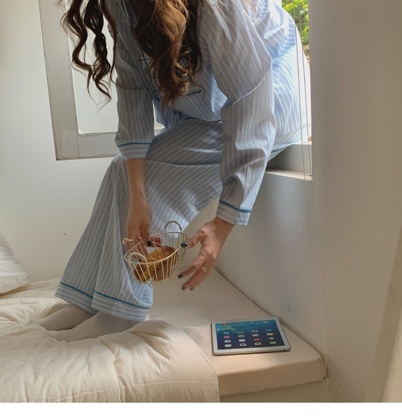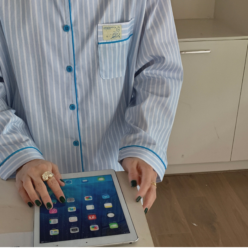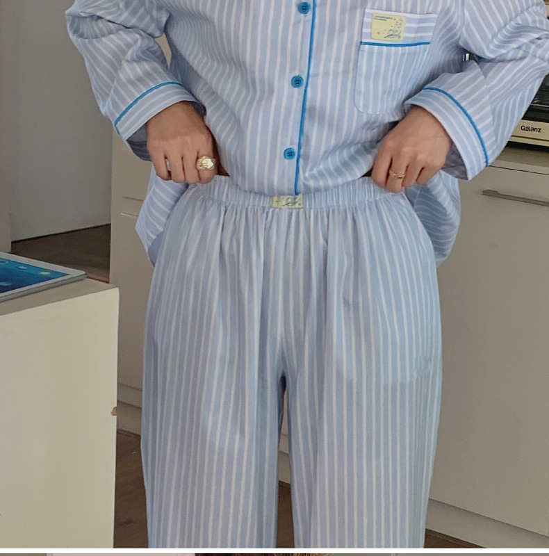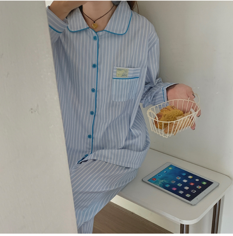 한국 리얼 샷 블루 스트라이프 잠옷 여자의 긴 소매 가을 고강도 면 능 직물 옷깃 가정 옷 인스 타 그램 스타일 새로운 도착스토어 가기