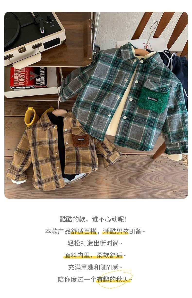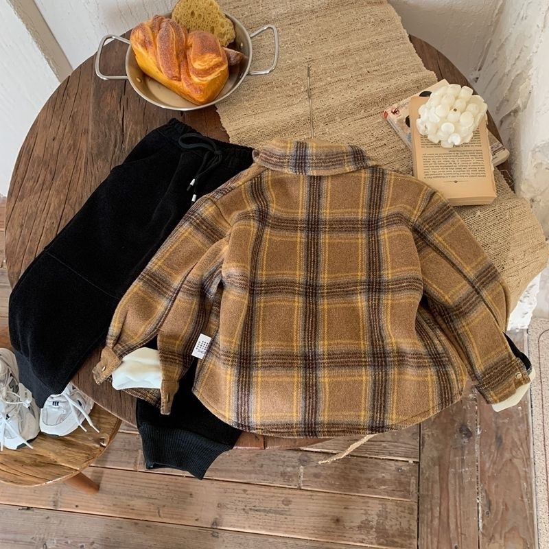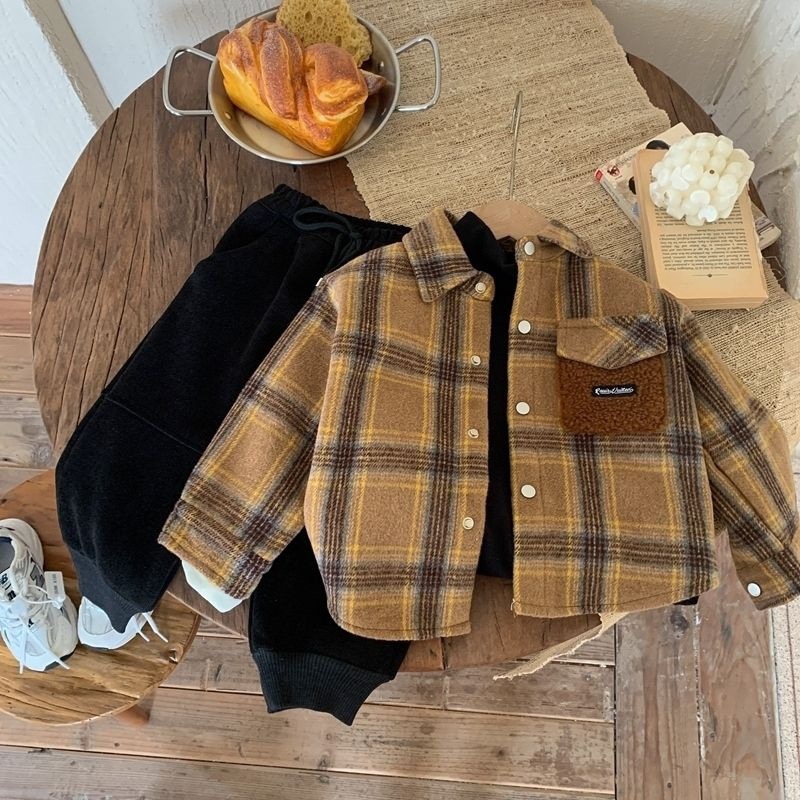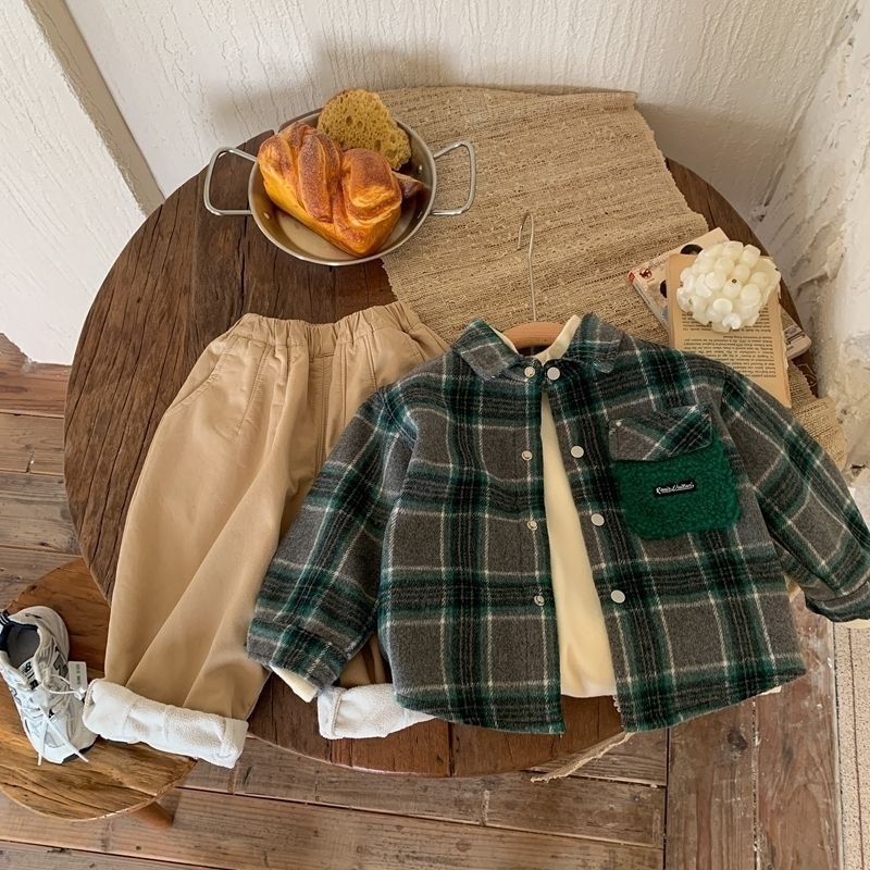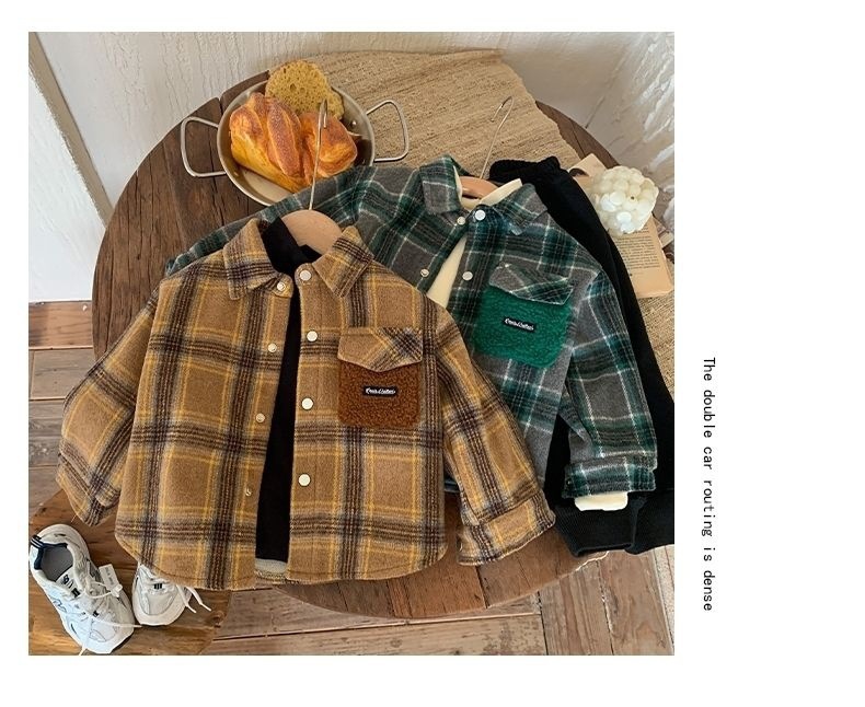 어린이 기모 셔츠 2023 가을과 겨울 새로운 남자의 중소 어린이 격자 무늬 잘 생긴 셔츠 코트 아기 두꺼운 겉옷스토어 가기