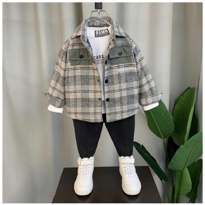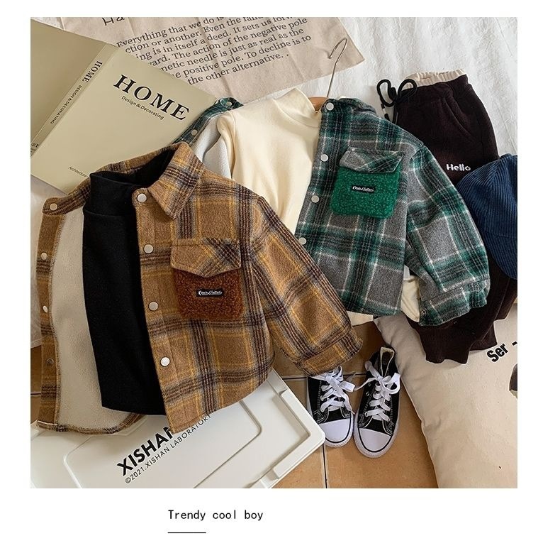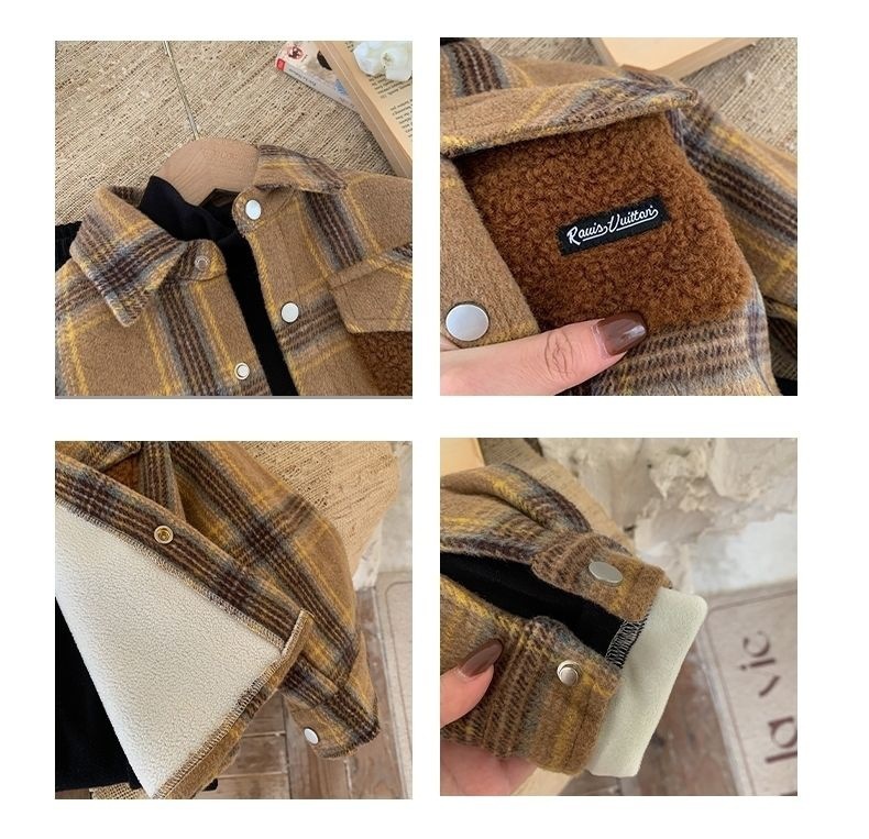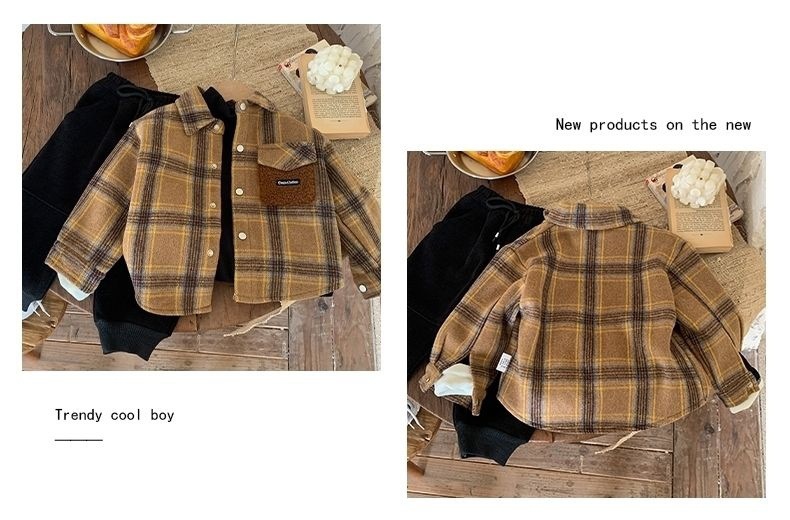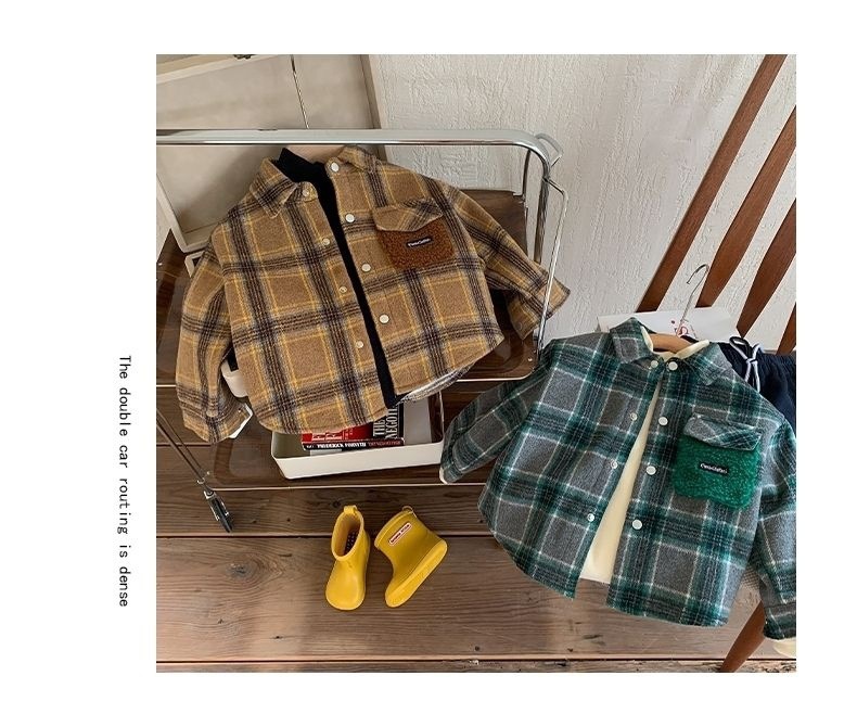어린이 기모 셔츠 2023 가을과 겨울 새로운 남자의 중소 어린이 격자 무늬 잘 생긴 셔츠 코트 아기 두꺼운 겉옷