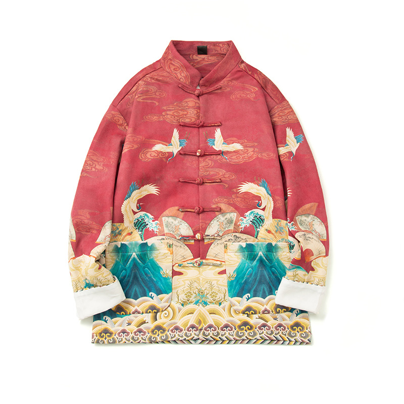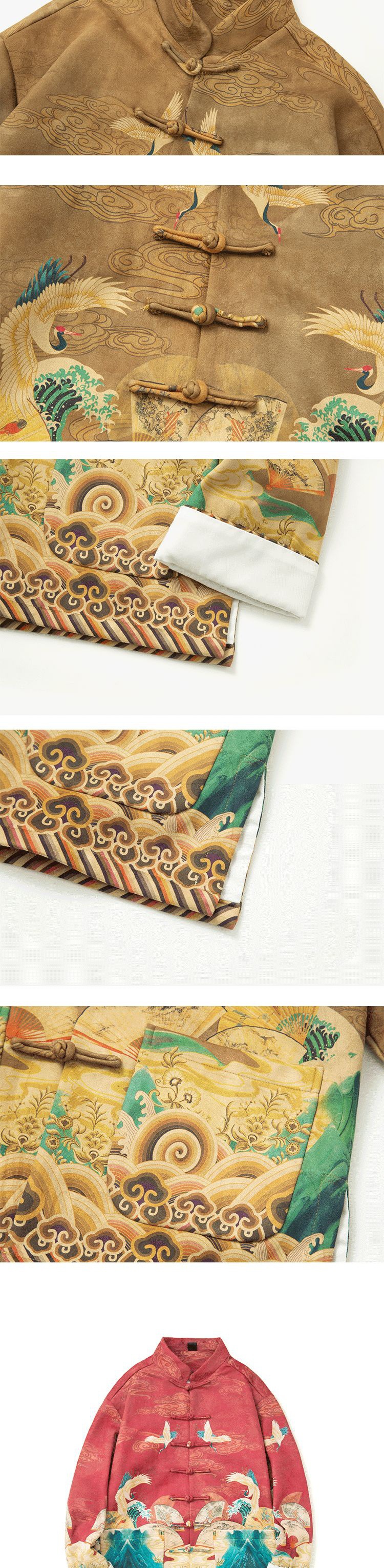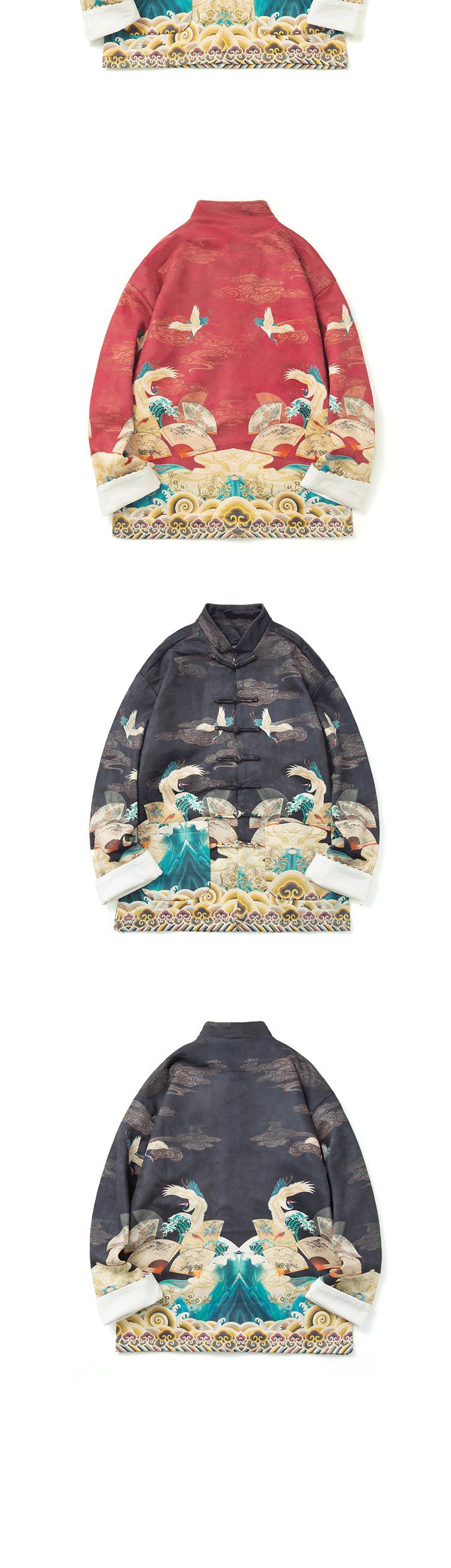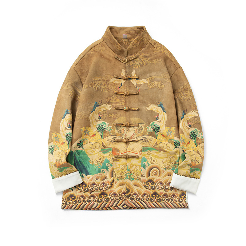 가을과 겨울 새로운 중국 스타일 수제 버클 내셔널 패션 사슴 가죽 벨벳 디지털 프린트 당나라 코트 느슨한 남성 자켓