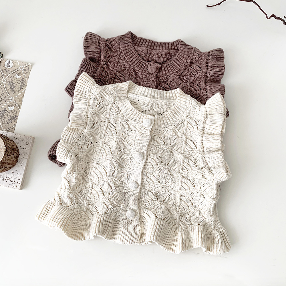 Cutemily 봄과 가을 면 아기 소녀의 중공 울 가디건 조끼 여자의 연잎 빈티지 짧은 조끼