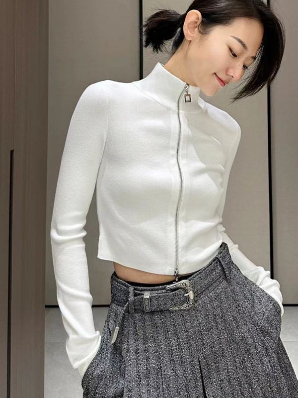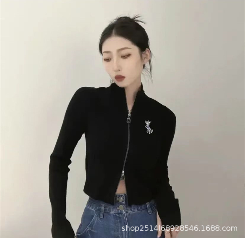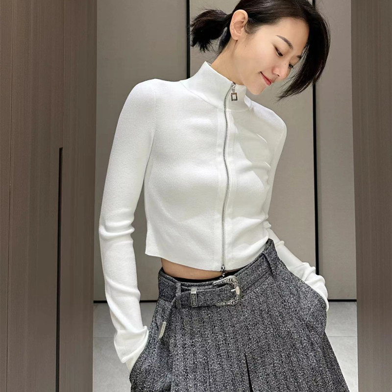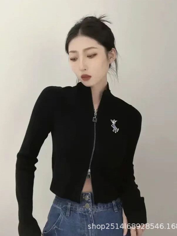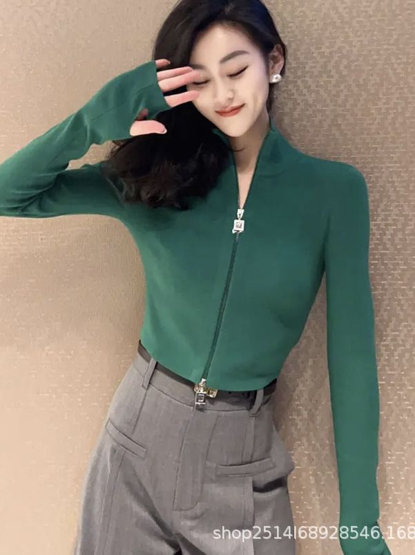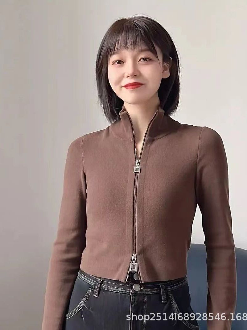 브라더스 뉴 여성 2023 가을 뉴 샤넬 스타일 슬림핏 올매치 스탠드 칼라 지퍼 니트 가디건 쇼트 코트스토어 가기