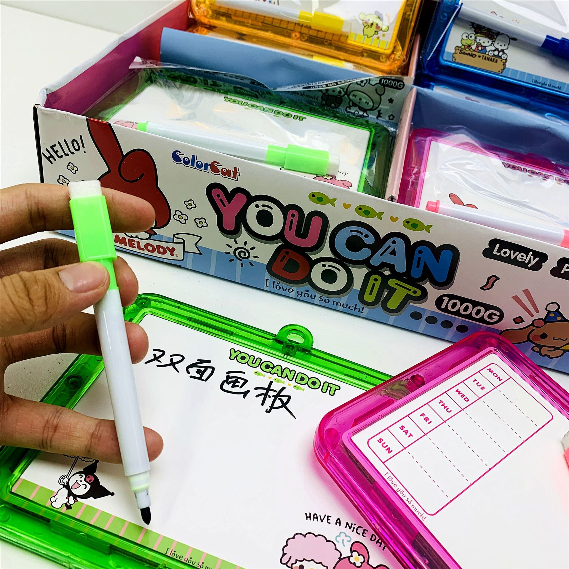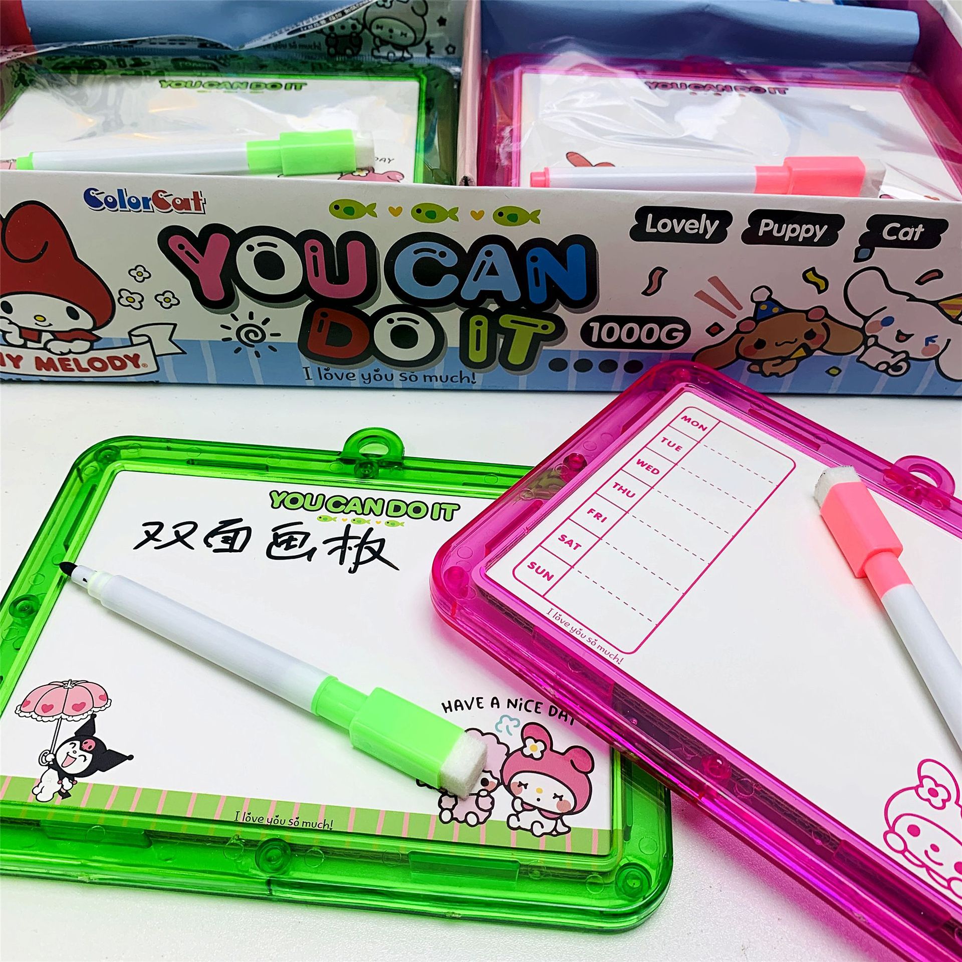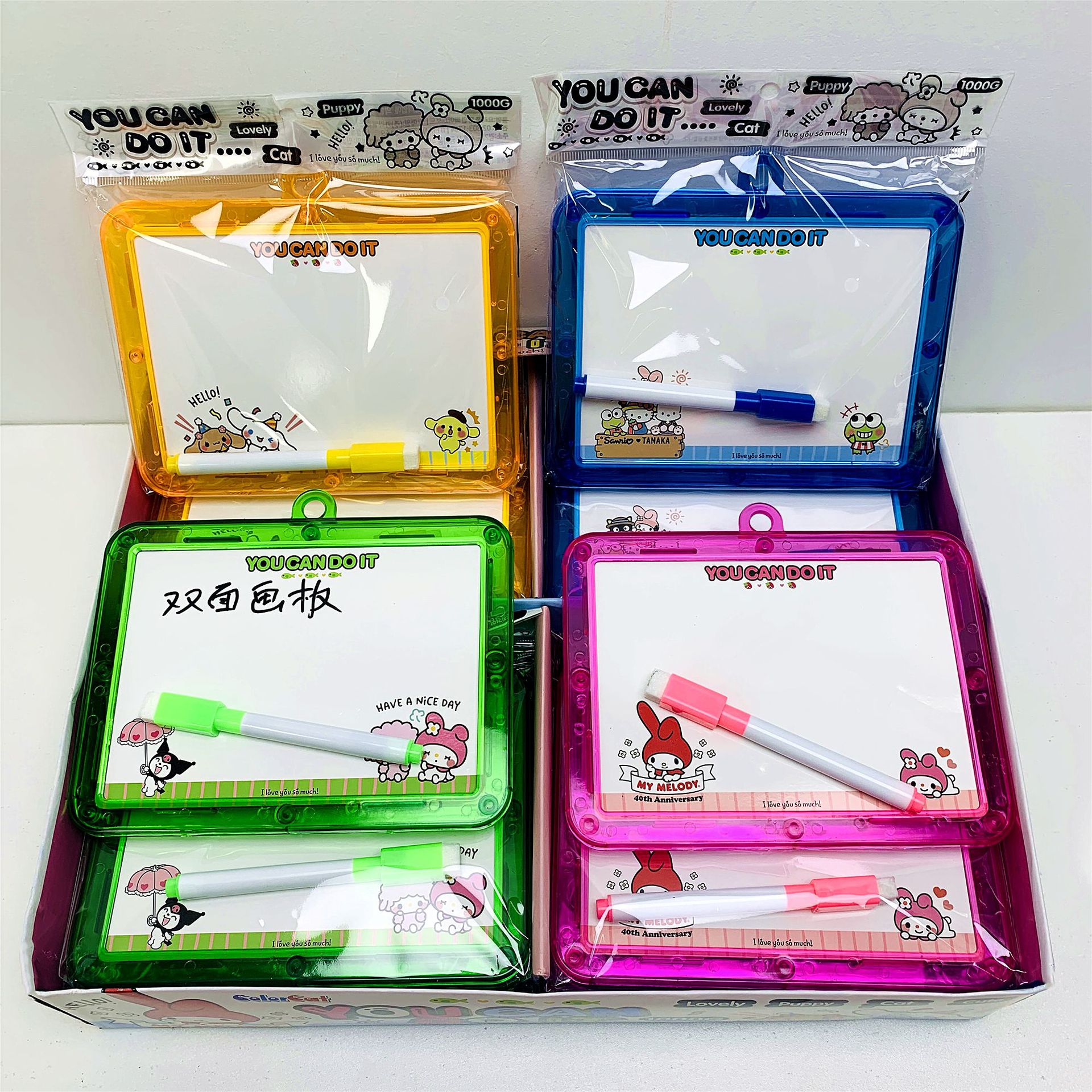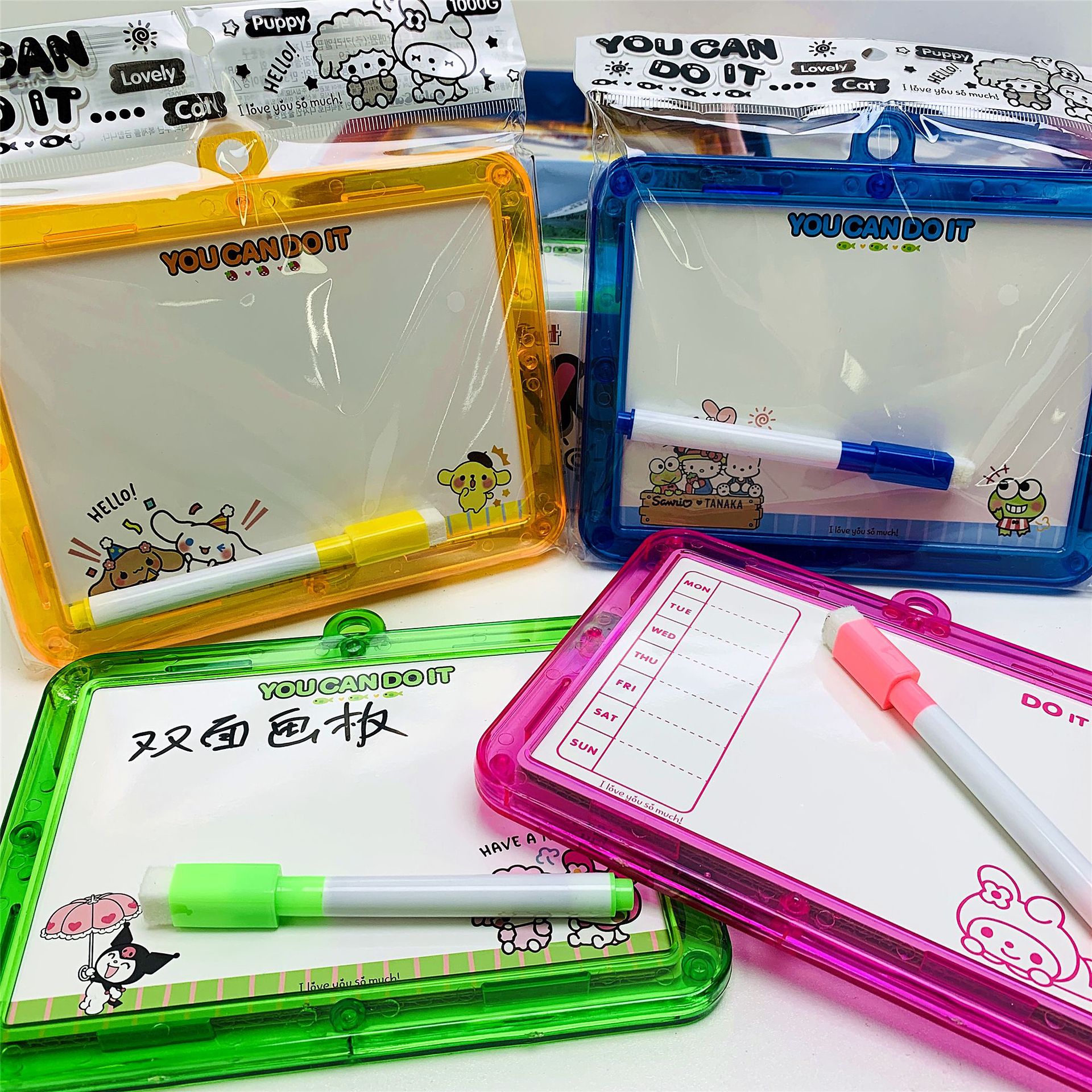새로운 만화 Sanrio 크리스탈 양면 드로잉 보드 어린이 교육 조기 교육 지울 수있는 쓰기 보드에는 화이트 보드 펜이 포함되어 있습니다.