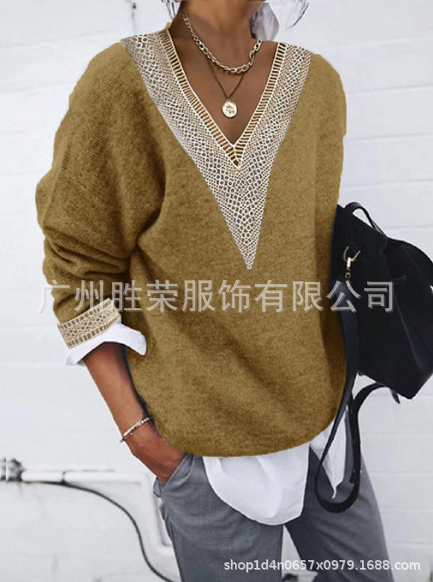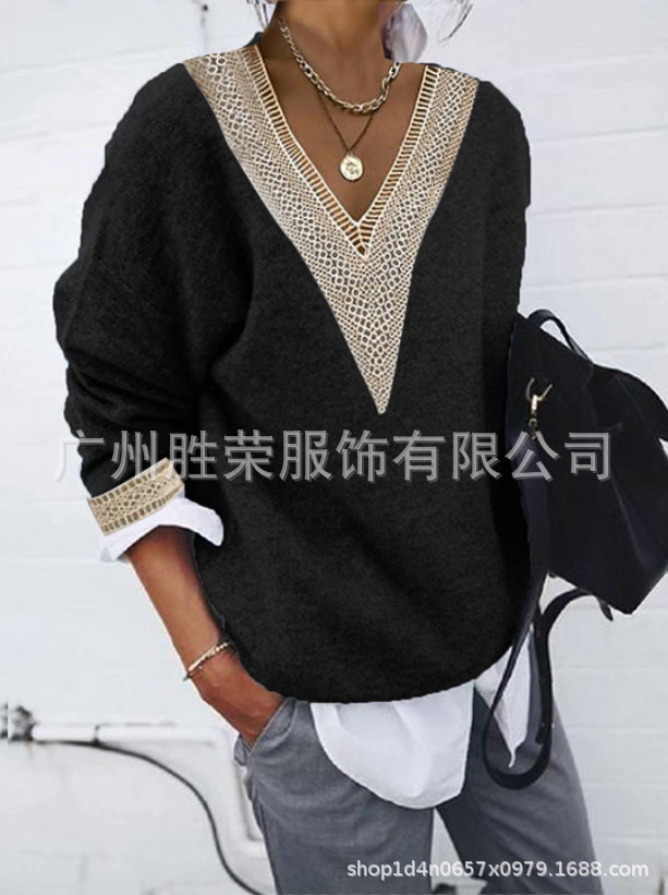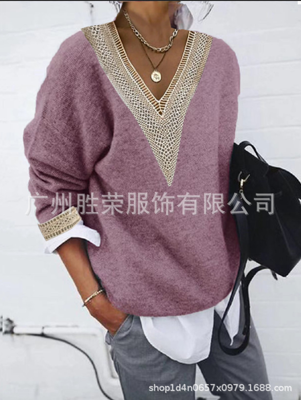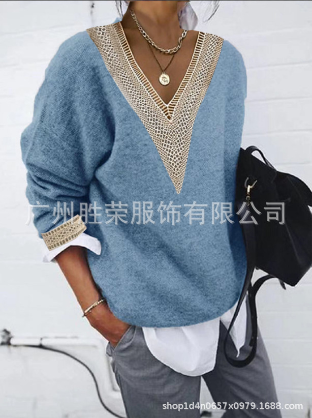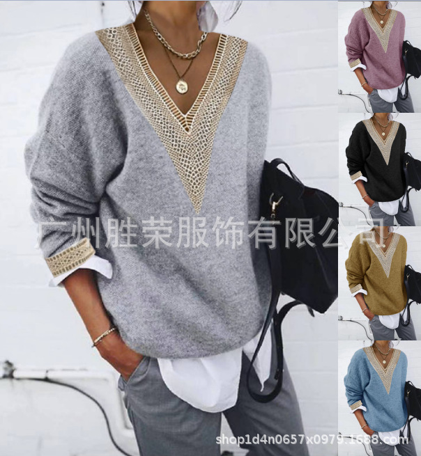 2023 새로운 국경 간 대외 무역 유럽과 미국 여성의 재고 가을과 겨울 긴 소매 레이스 칼라 단색 니트 스웨터