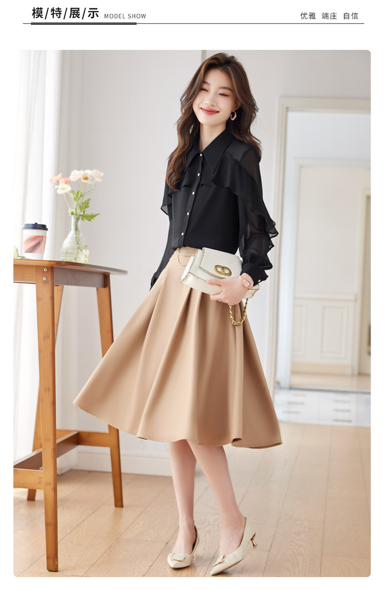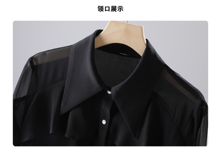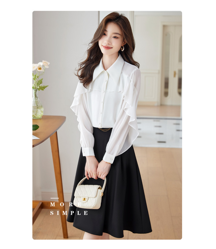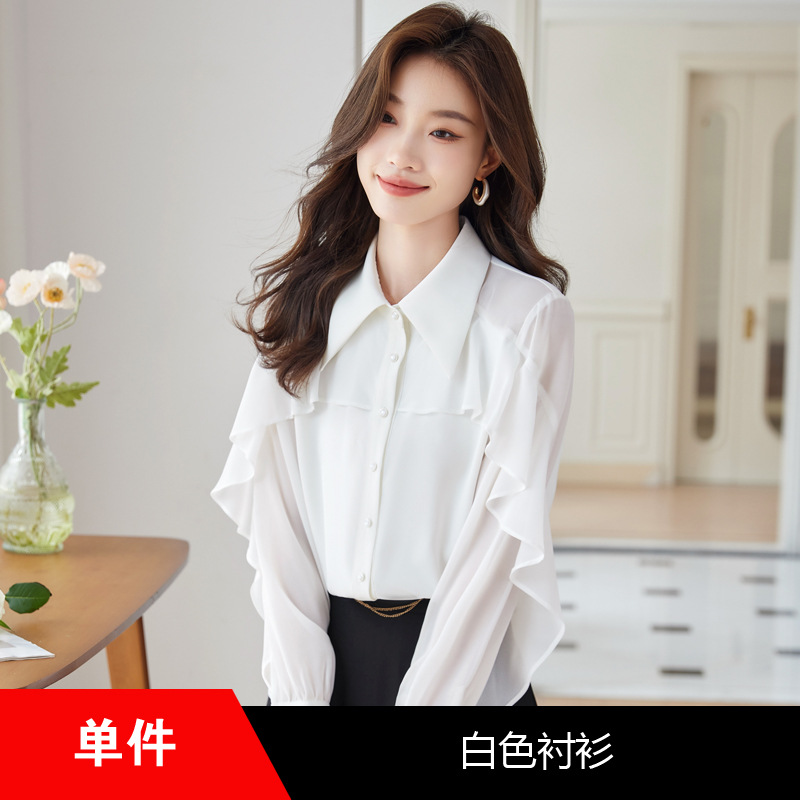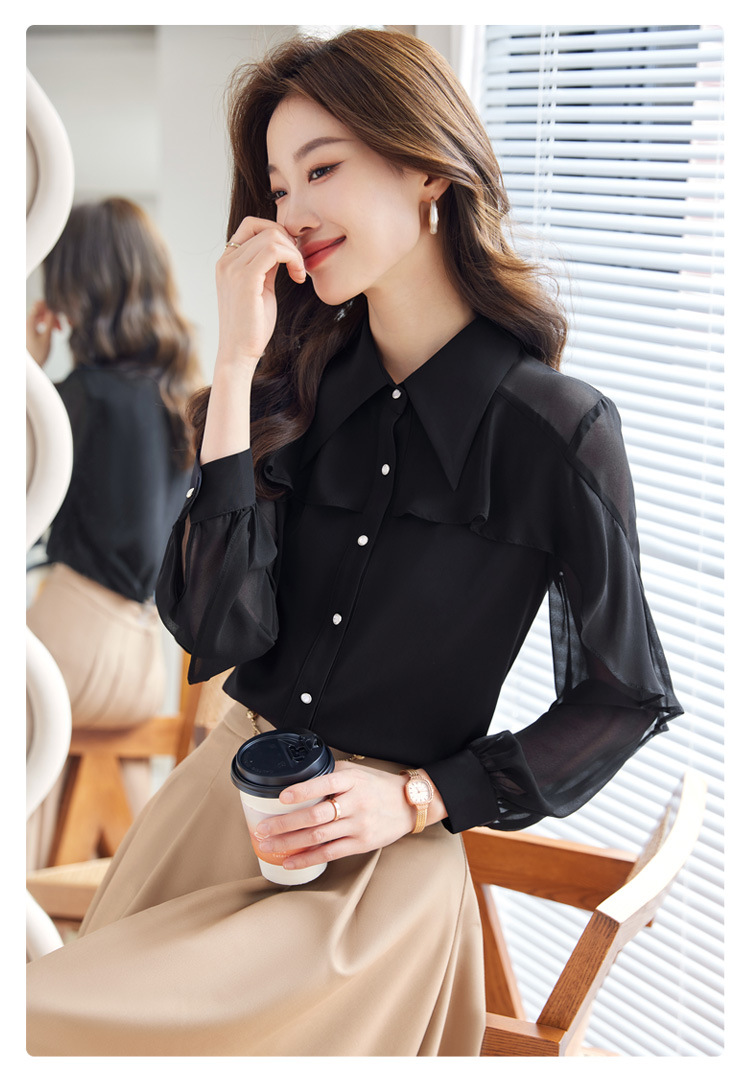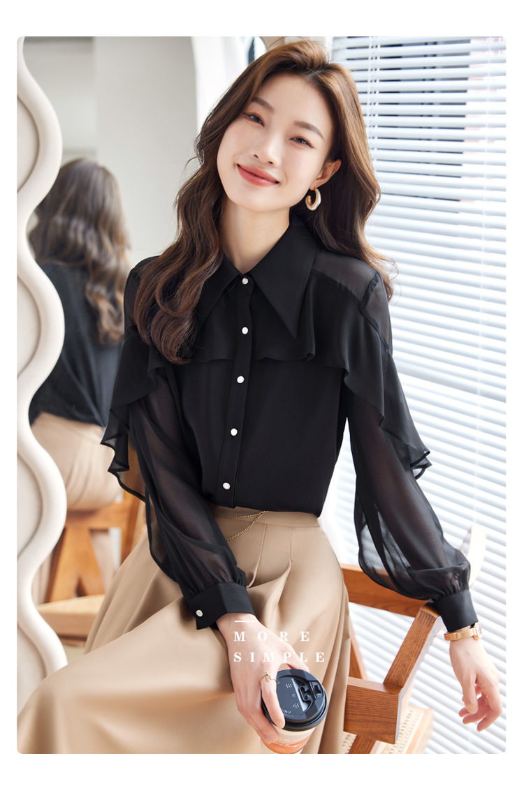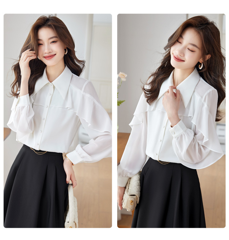 세븐 밸리 니앙 디자인 센스 프릴 스티치 폴로 칼라 긴 소매 셔츠 여성의 가을 달콤한 우아한 패션 쉬폰 탑
