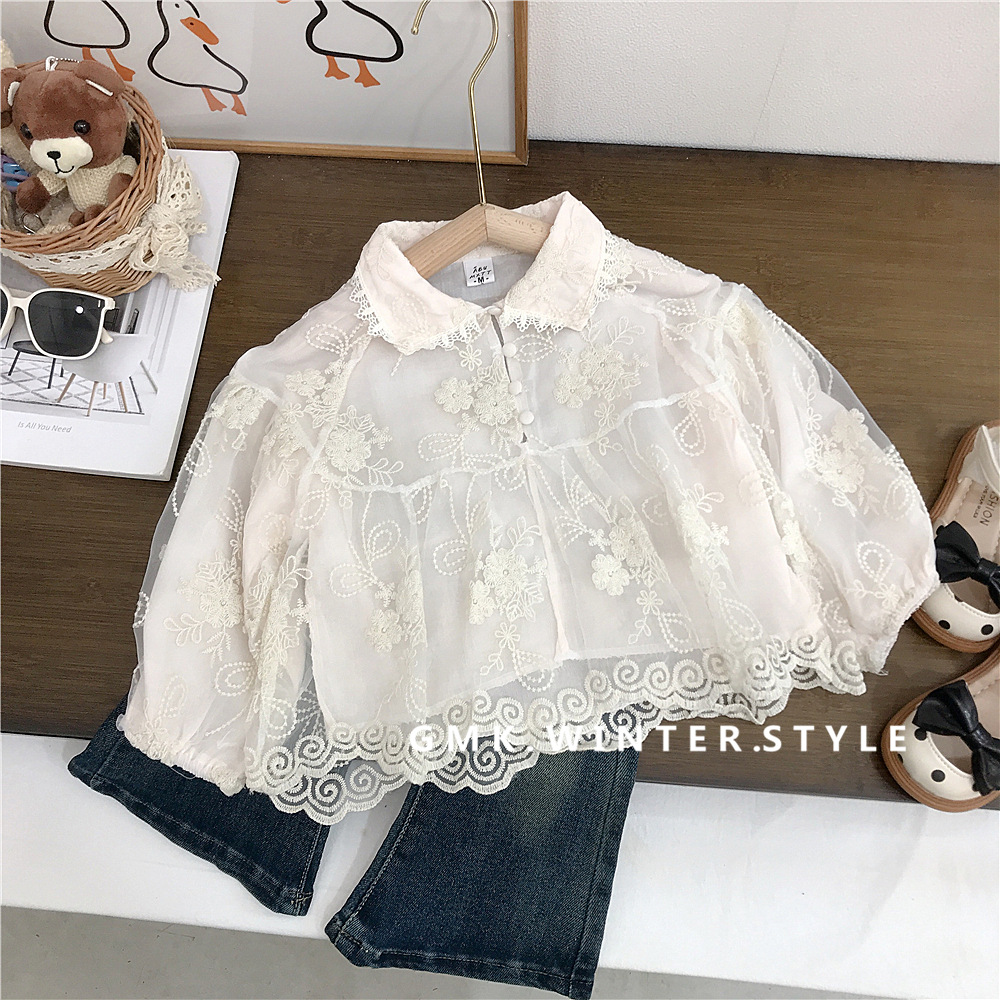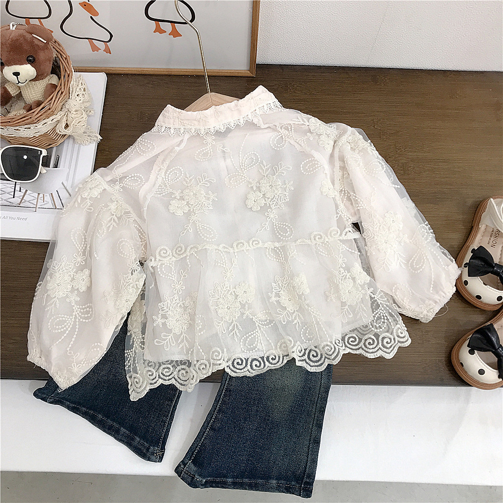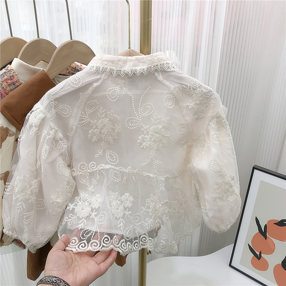 소녀의 가을 레이스 긴팔 셔츠 2023 새로운 어린이 셔츠 인형 셔츠 탑 소녀의 세련된 작은 셔츠