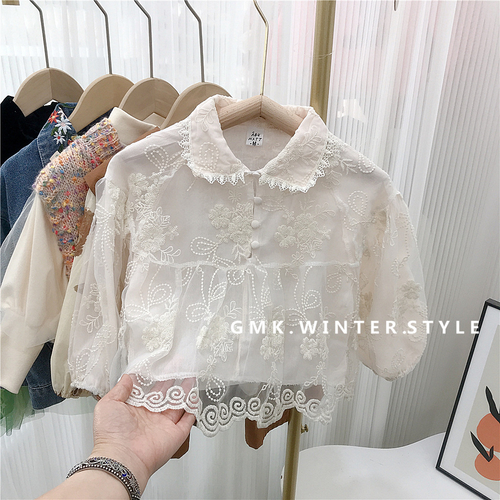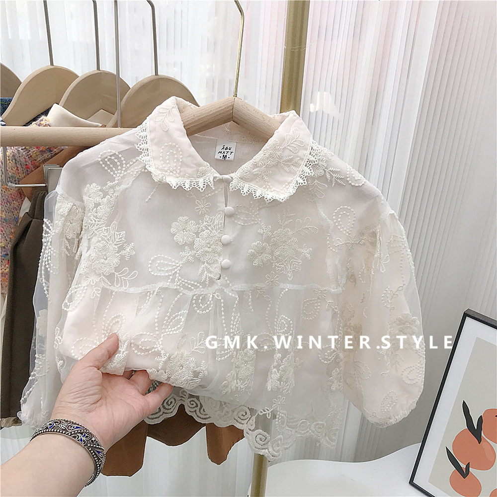 소녀의 가을 레이스 긴팔 셔츠 2023 새로운 어린이 셔츠 인형 셔츠 탑 소녀의 세련된 작은 셔츠스토어 가기