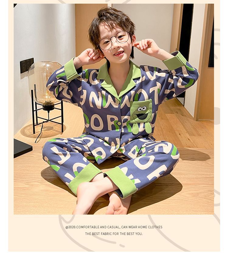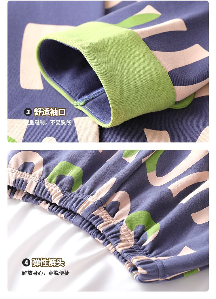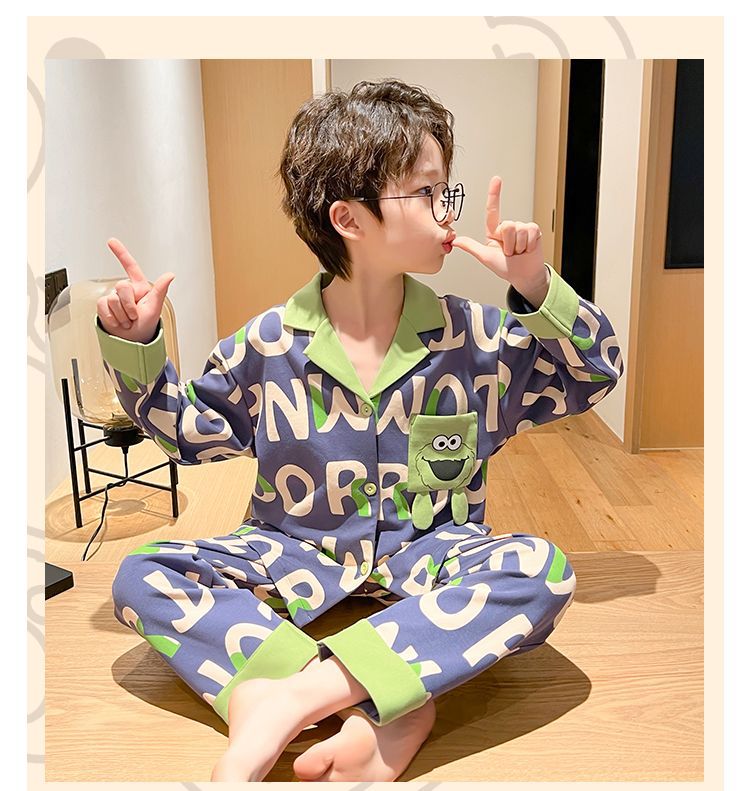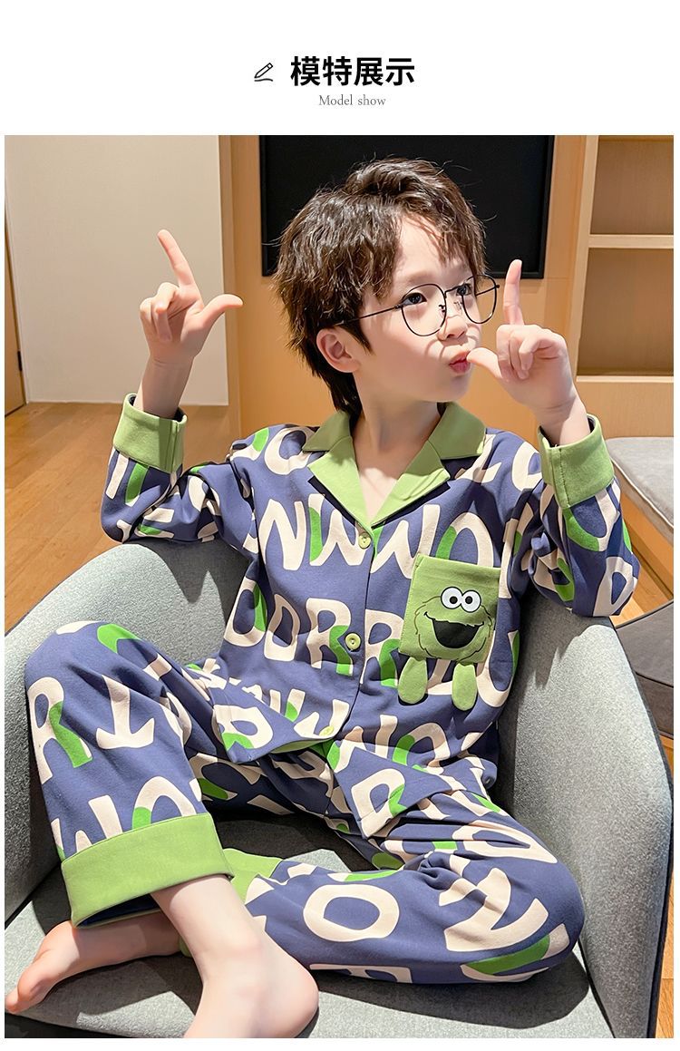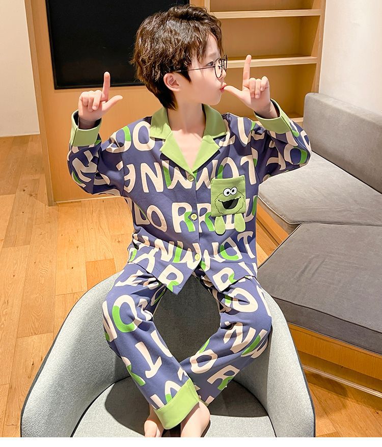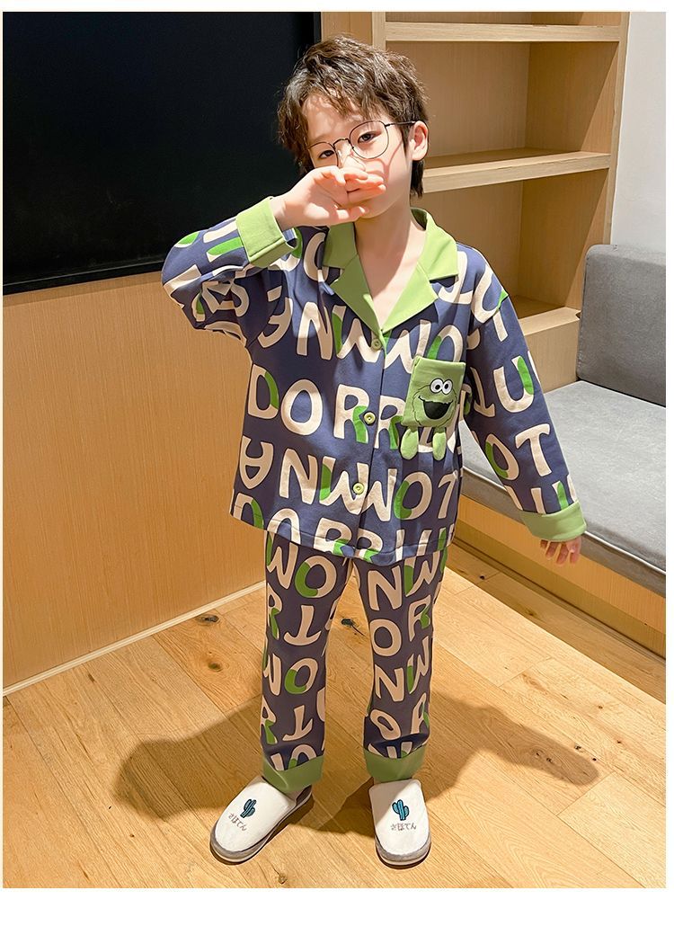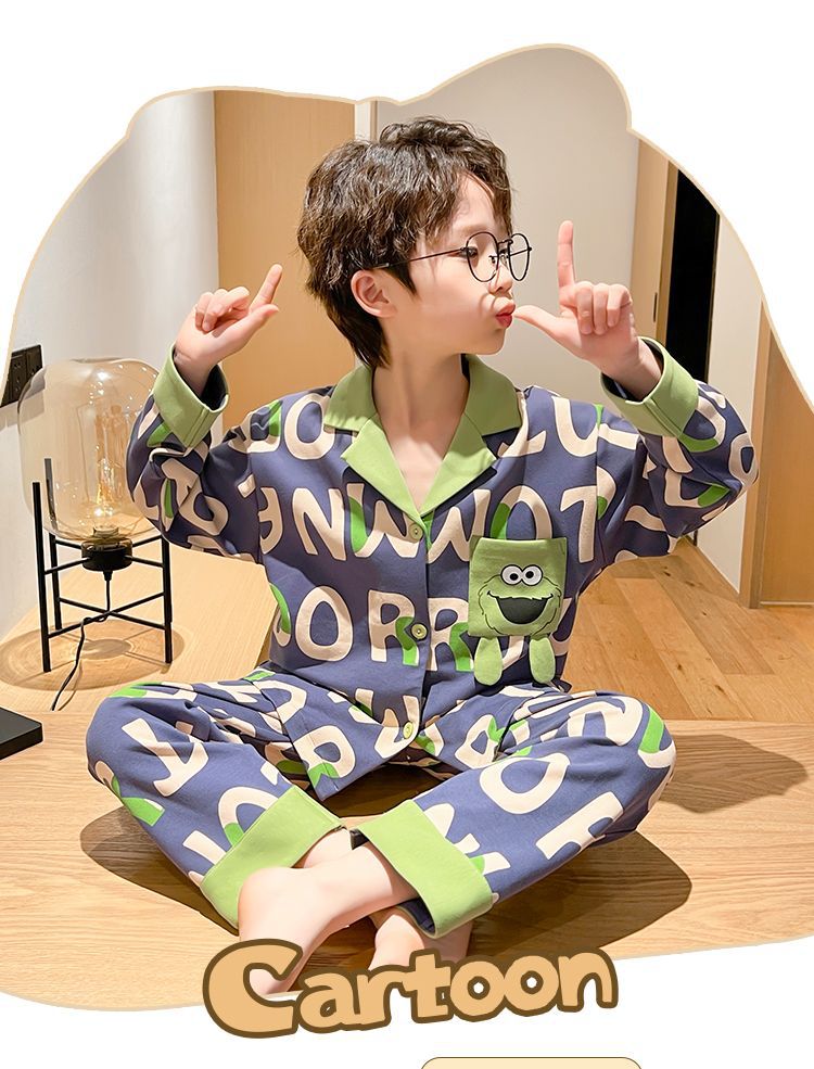소년을위한 어린이 잠옷 어린 소년을위한 봄과 가을 순면 얇은 긴 소매 세트 중간 및 큰 어린이 만화 부모-자식 가정 옷스토어 가기
