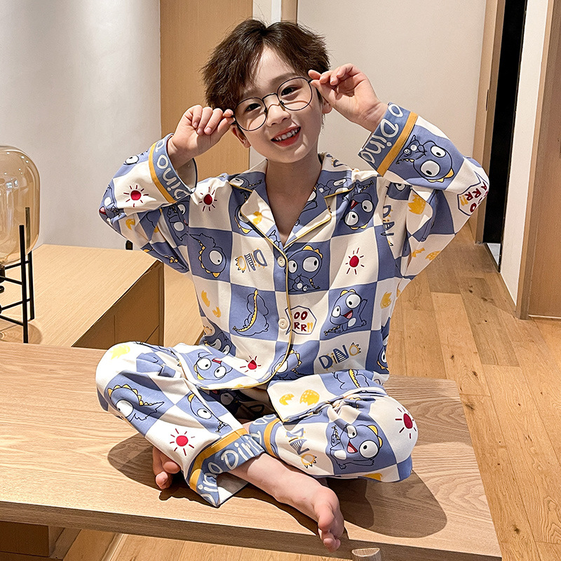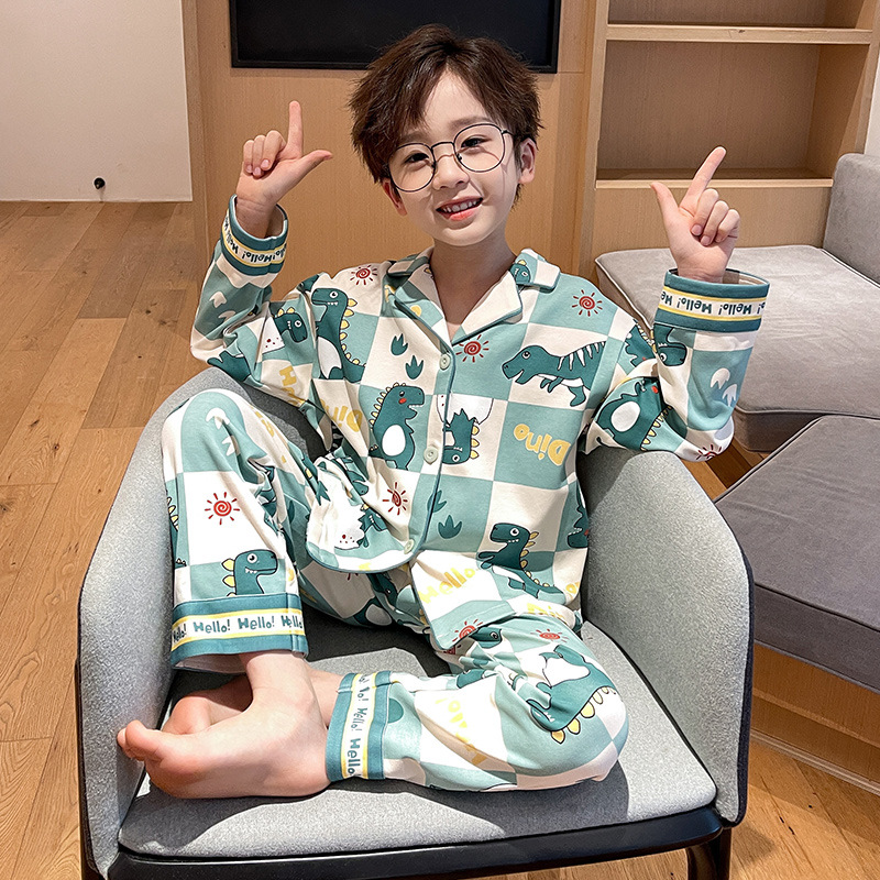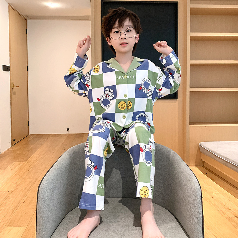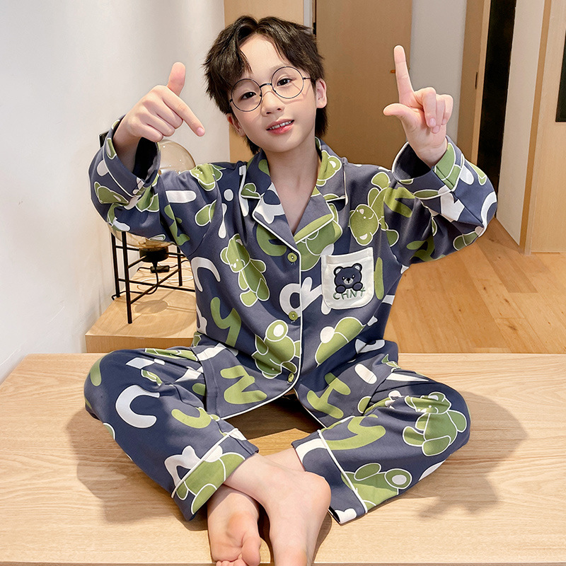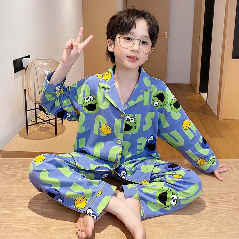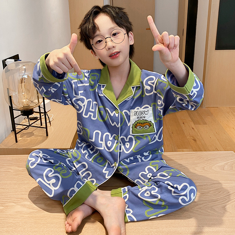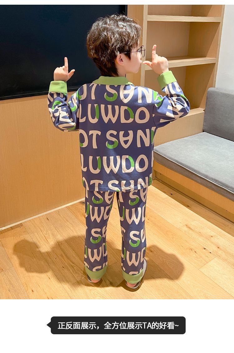 소년을위한 어린이 잠옷 어린 소년을위한 봄과 가을 순면 얇은 긴 소매 세트 중간 및 큰 어린이 만화 부모-자식 가정 옷스토어 가기