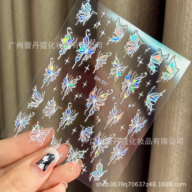 폭발 3D 네일 아트 스티커 얇은 투명 액체 나비 날개 다채로운 레이저 다채로운 깨진 유리 실버 네일 데칼