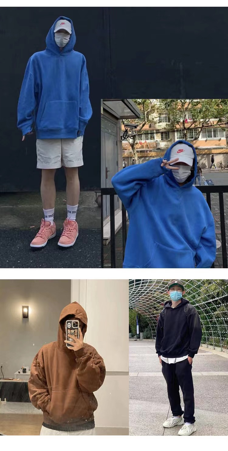 남성과 여성을위한 코튼 및 벨벳 버전 짧은 와이드 실루엣 더블 레이어 후드 스웨터 Kanye 스트리트 패션 INS스토어 가기
