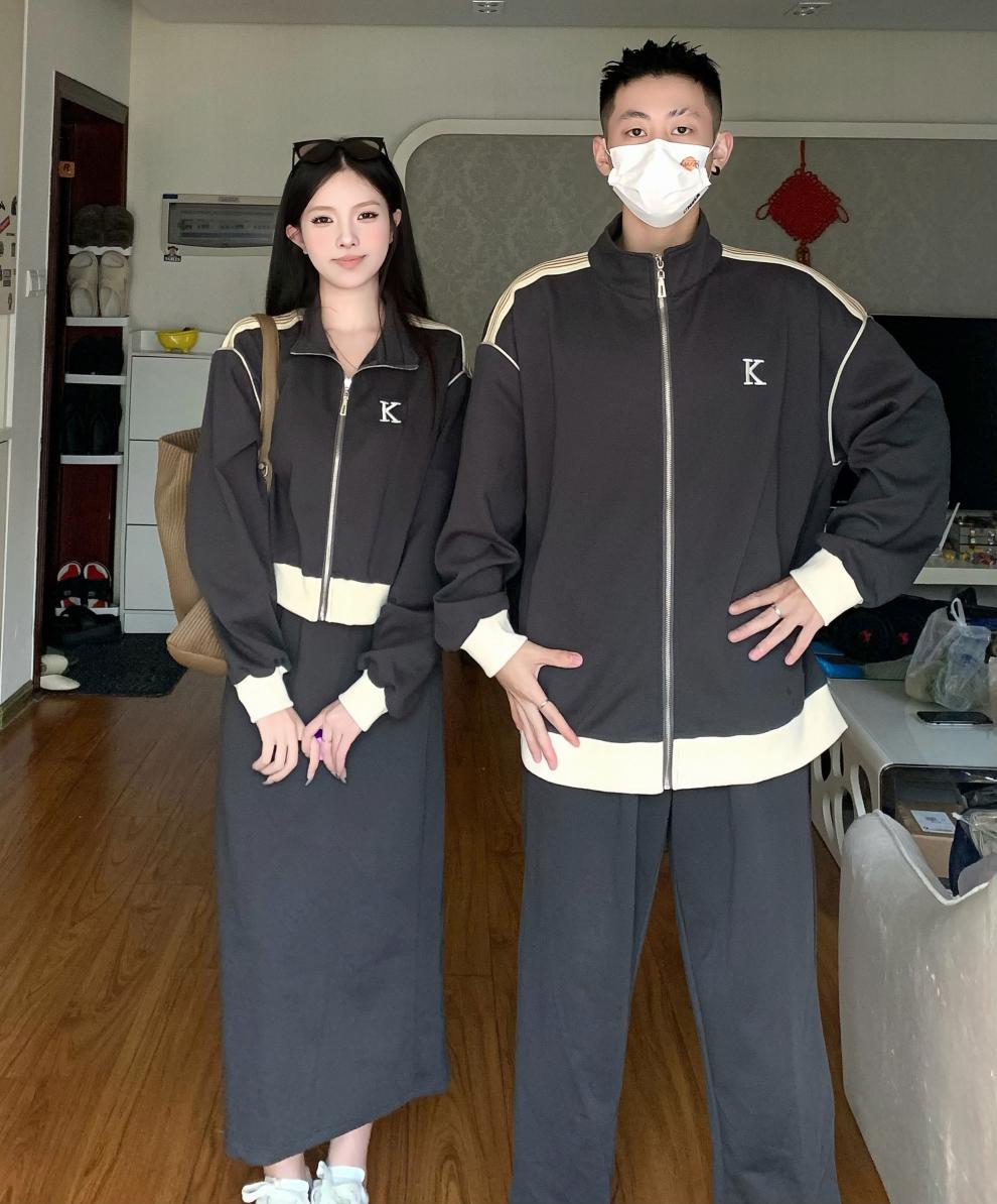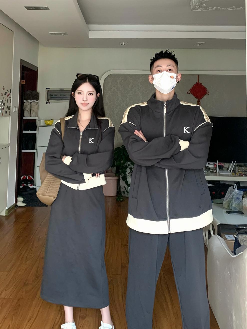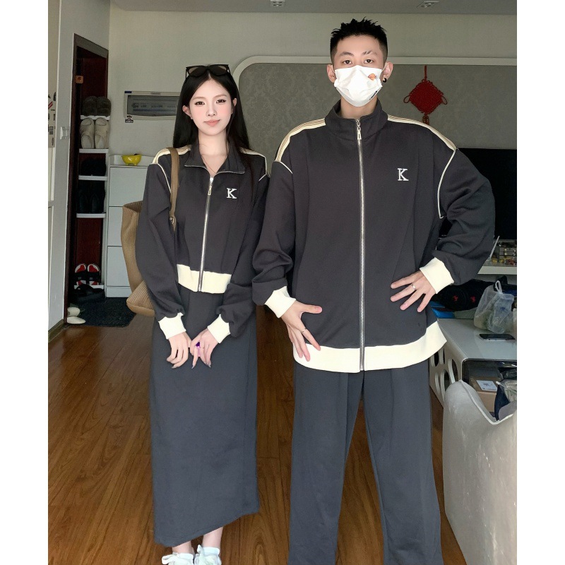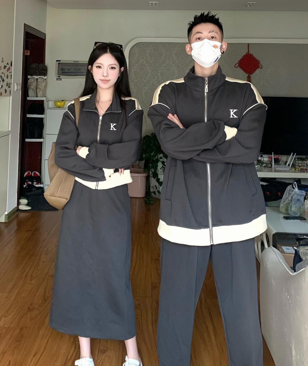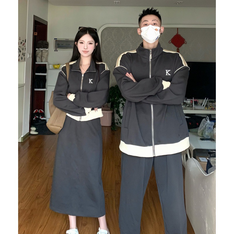 2023 가을 연인 지퍼 짧은 스웨터 코트 다시 슬릿 오버 스커트 투피스 세트 대학 스타일 커플