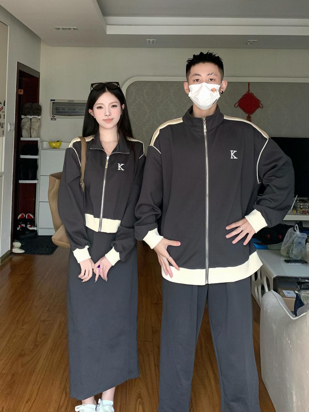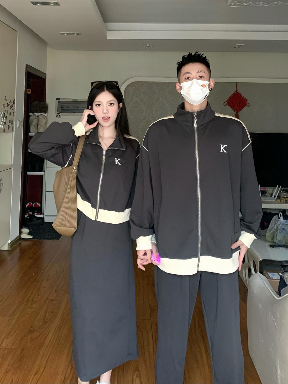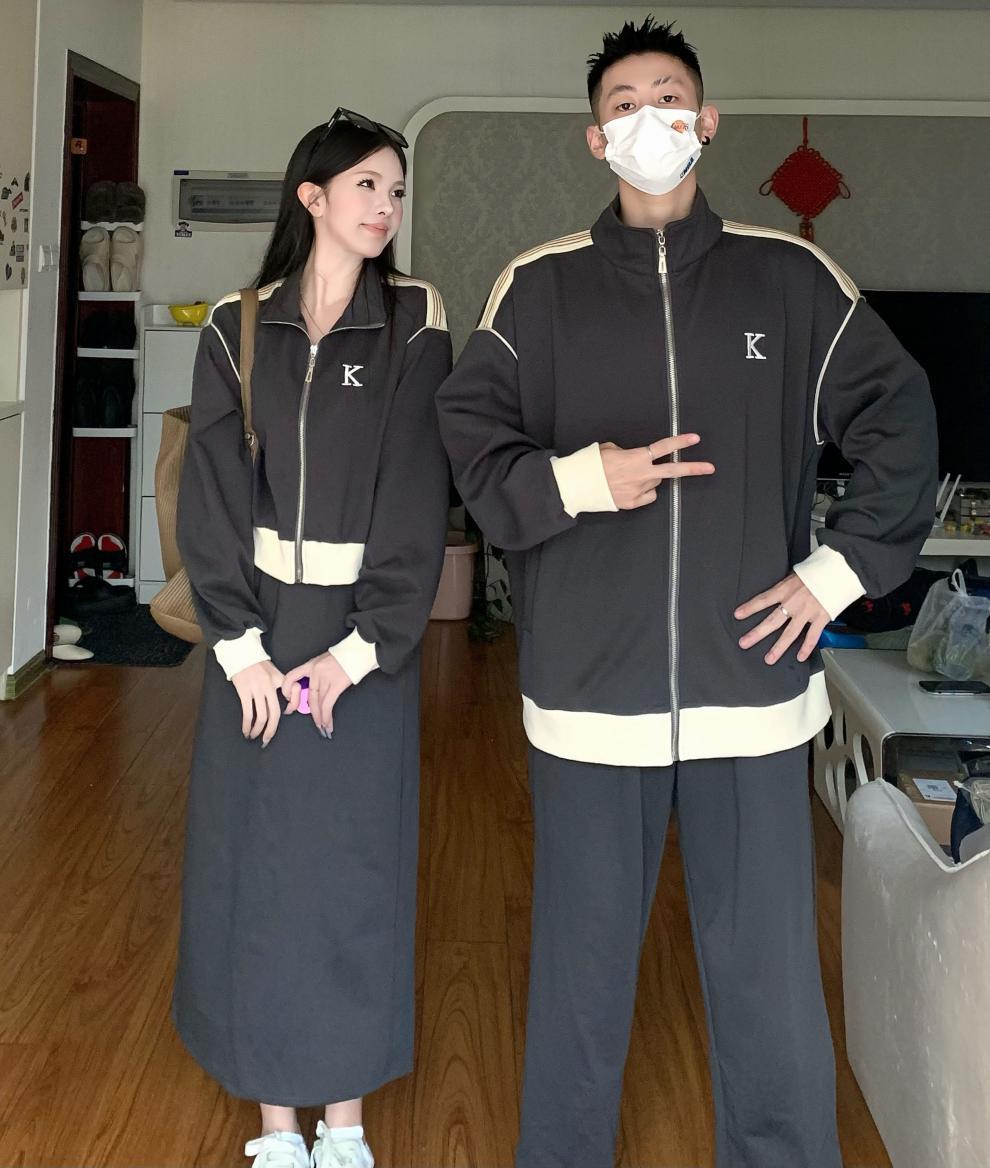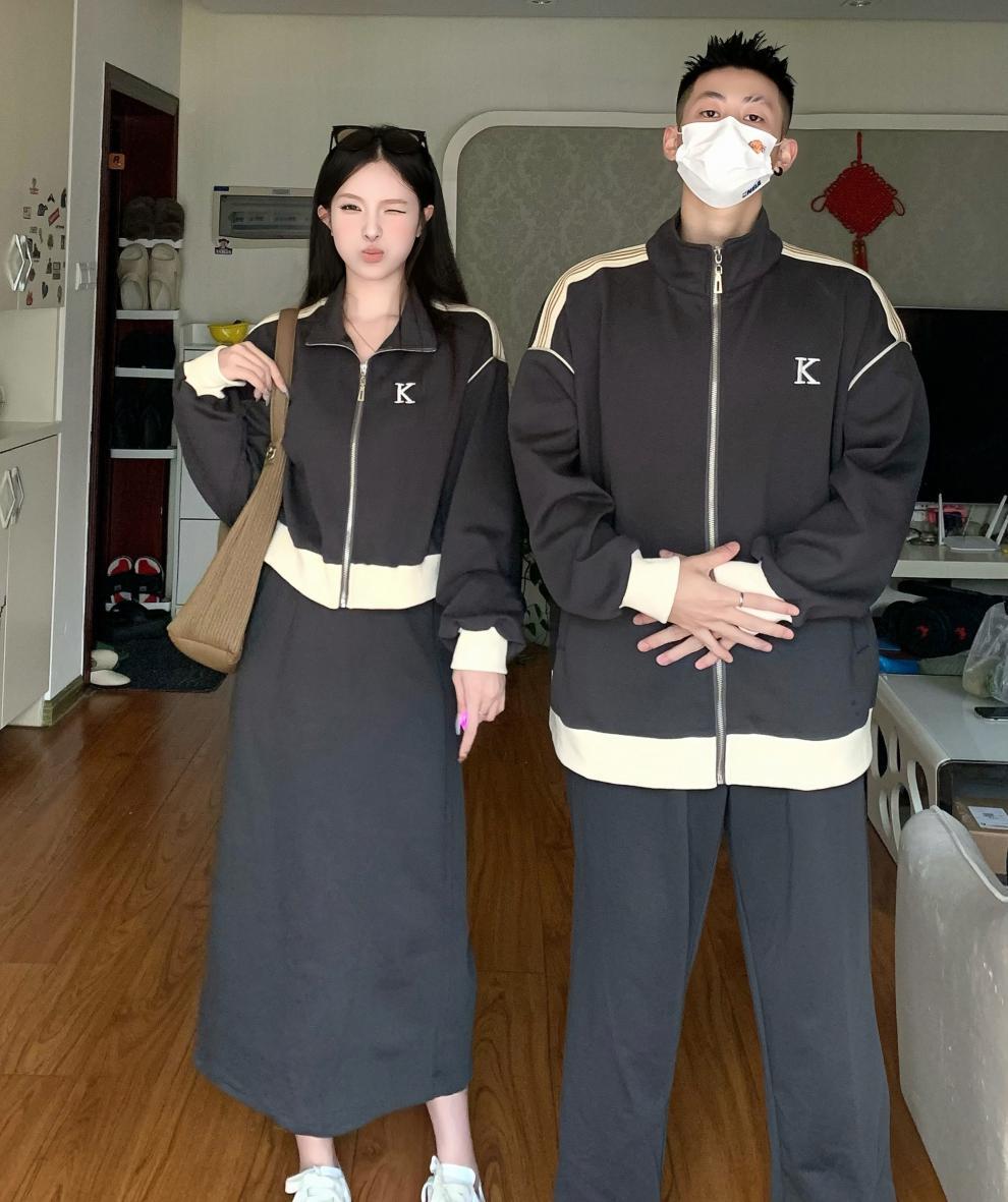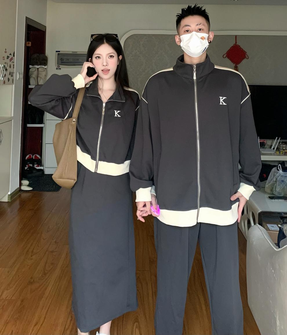 2023 가을 연인 지퍼 짧은 스웨터 코트 다시 슬릿 오버 스커트 투피스 세트 대학 스타일 커플