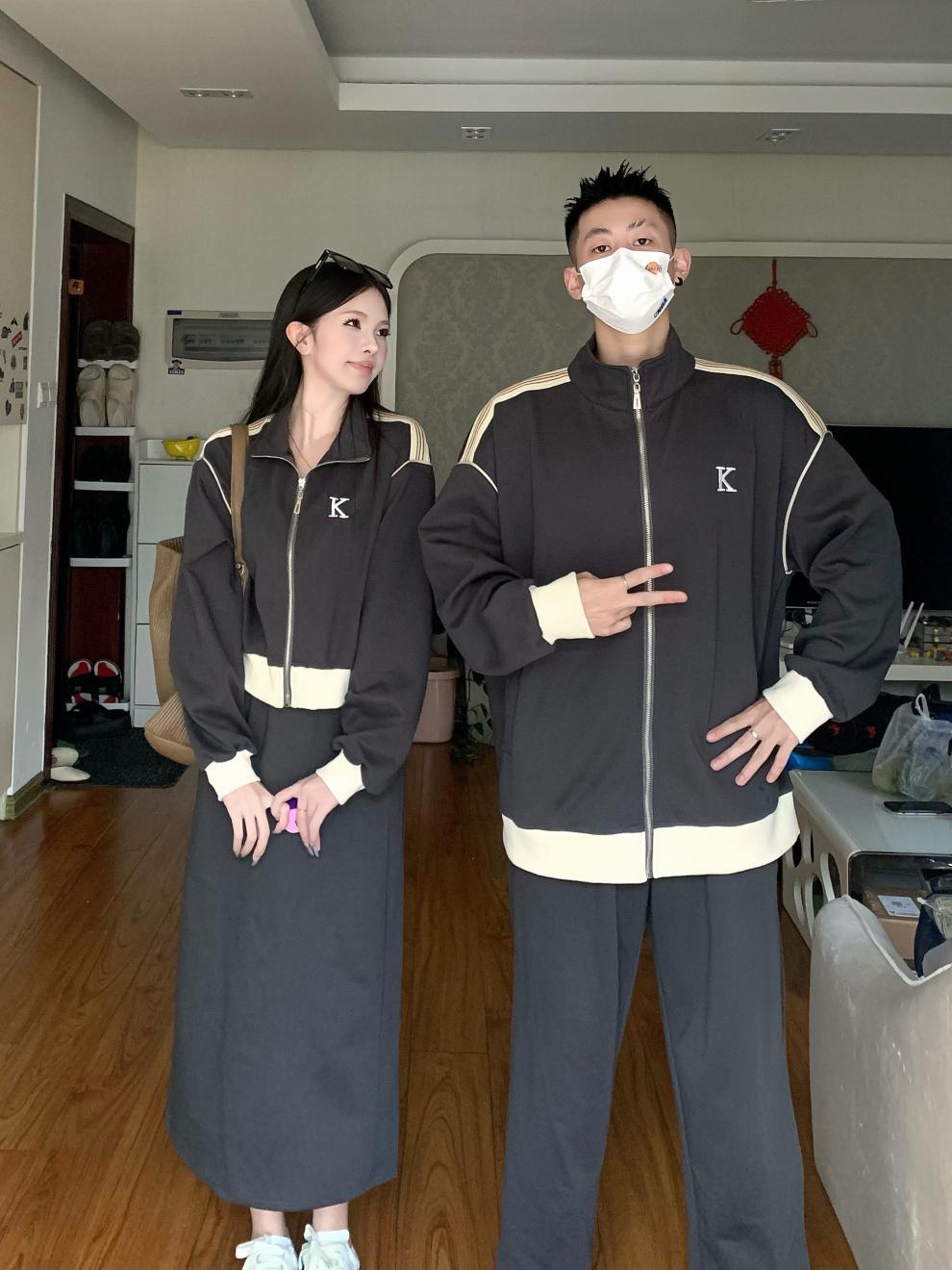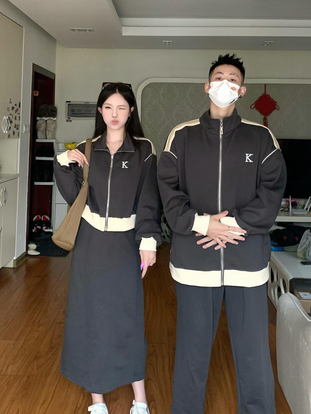 2023 가을 연인 지퍼 짧은 스웨터 코트 다시 슬릿 오버 스커트 투피스 세트 대학 스타일 커플스토어 가기