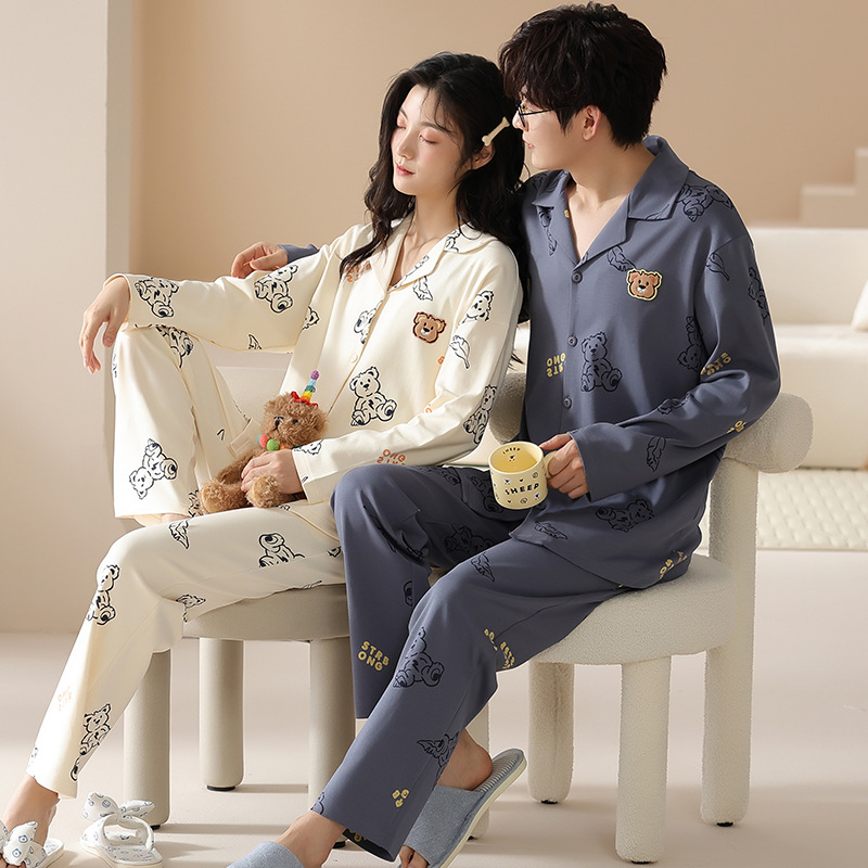 새로운 봄과 가을 커플 긴팔 귀여운 만화 인쇄 연령 감소 옷깃 캐주얼 홈 아웃웨어 면 잠옷스토어 가기