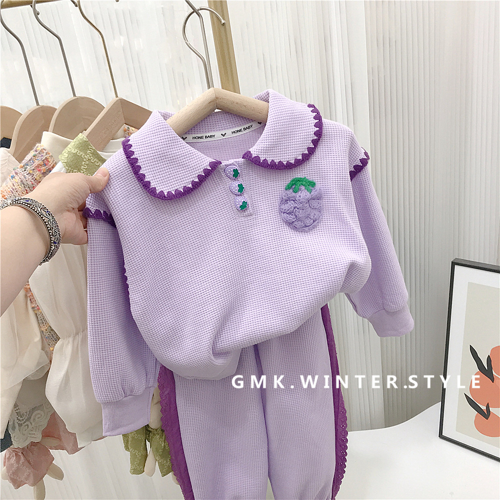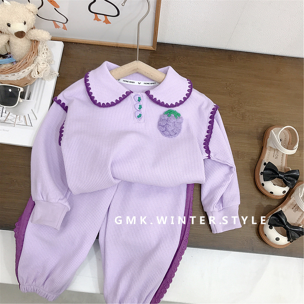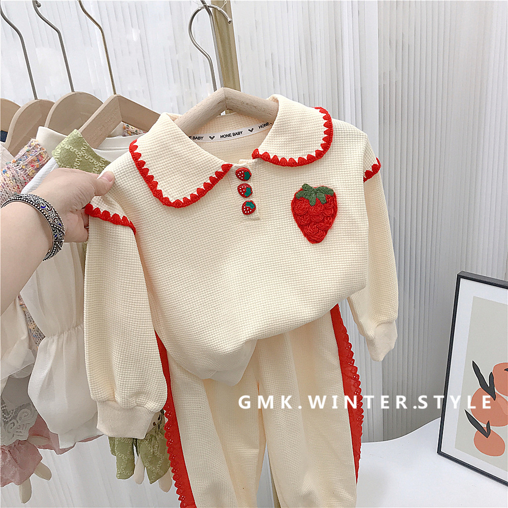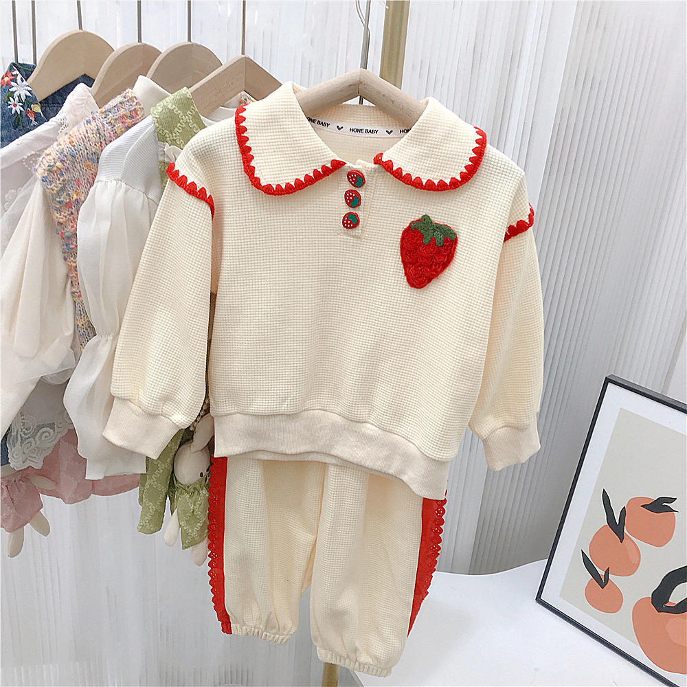 소녀의 세트 가을 2023 새로운 봄과 가을 원피스 서양 스타일 아기 소녀의 와플 스포츠 스웨터 딸기 투피스 세트스토어 가기