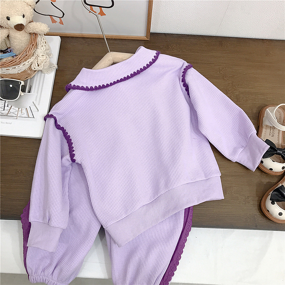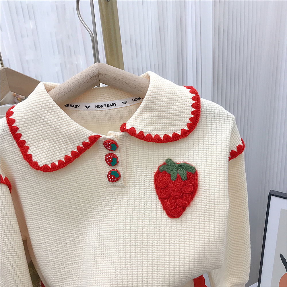 소녀의 세트 가을 2023 새로운 봄과 가을 원피스 서양 스타일 아기 소녀의 와플 스포츠 스웨터 딸기 투피스 세트