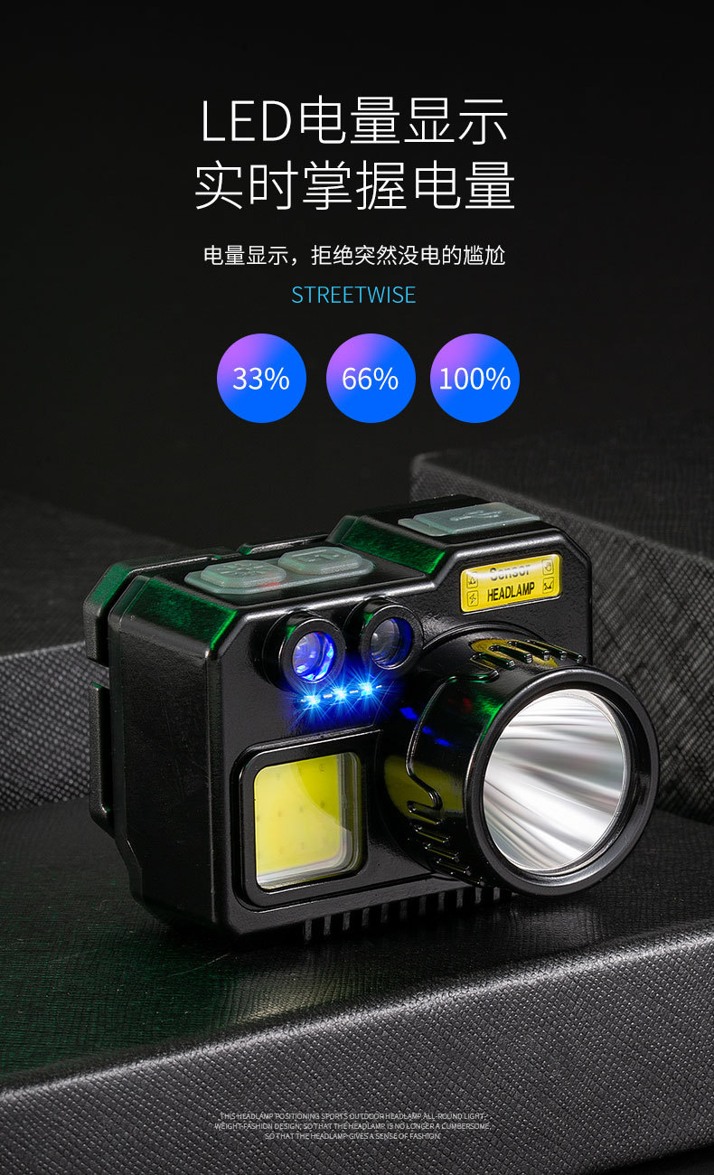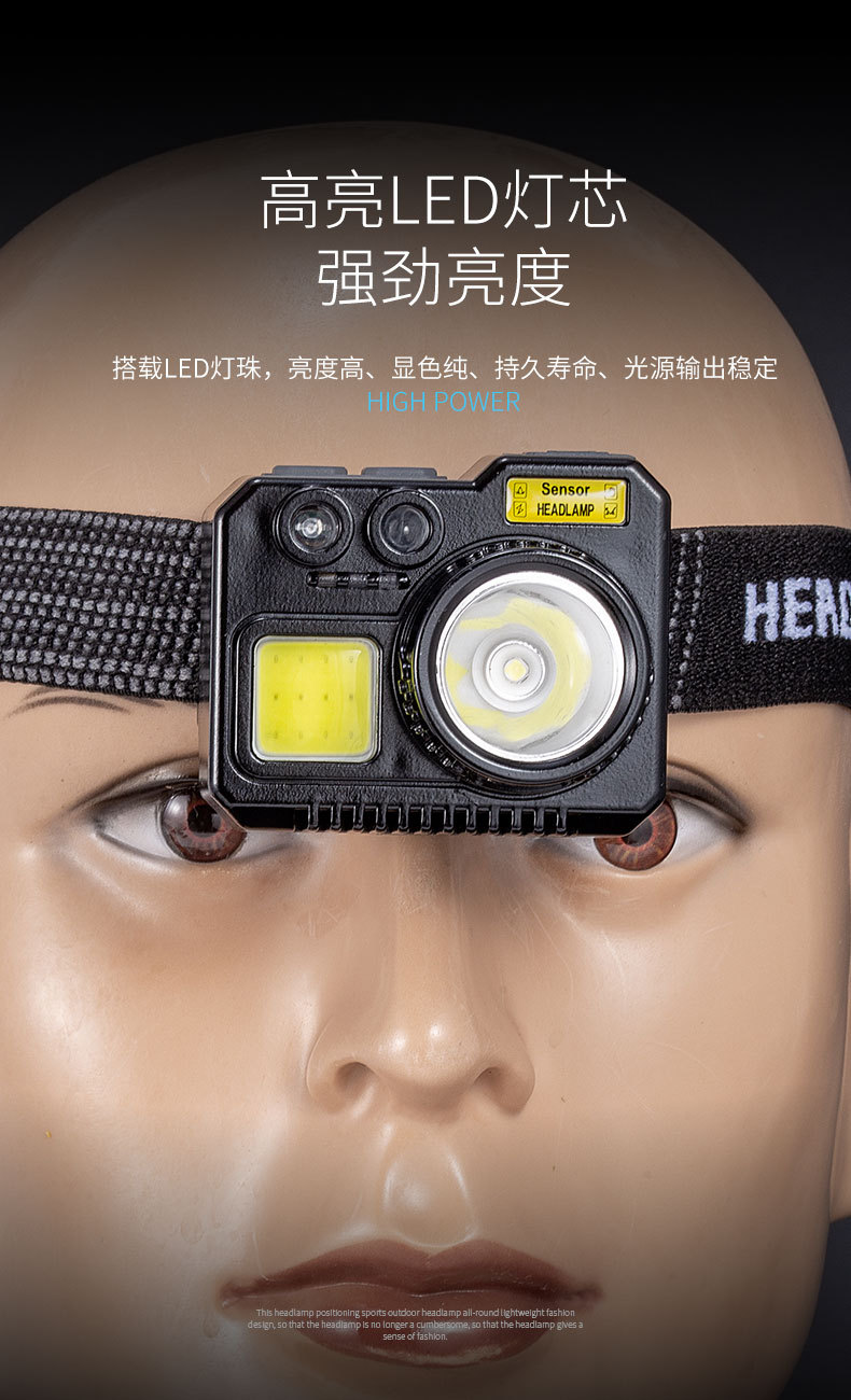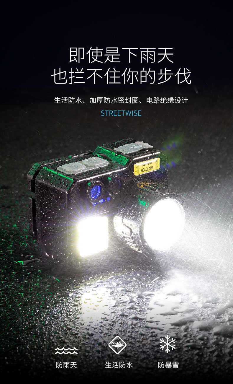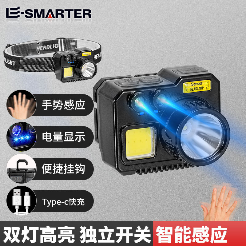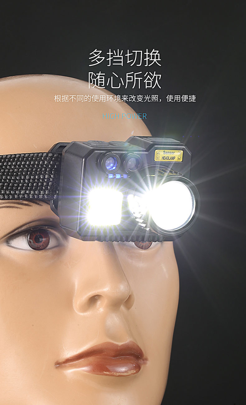 크로스 보더 아웃도어 슈퍼 브라이트 다기능 야간 낚시 지능형 유도 헤드 라이트 충전 긴 내구성 작업 등 유지 보수 등