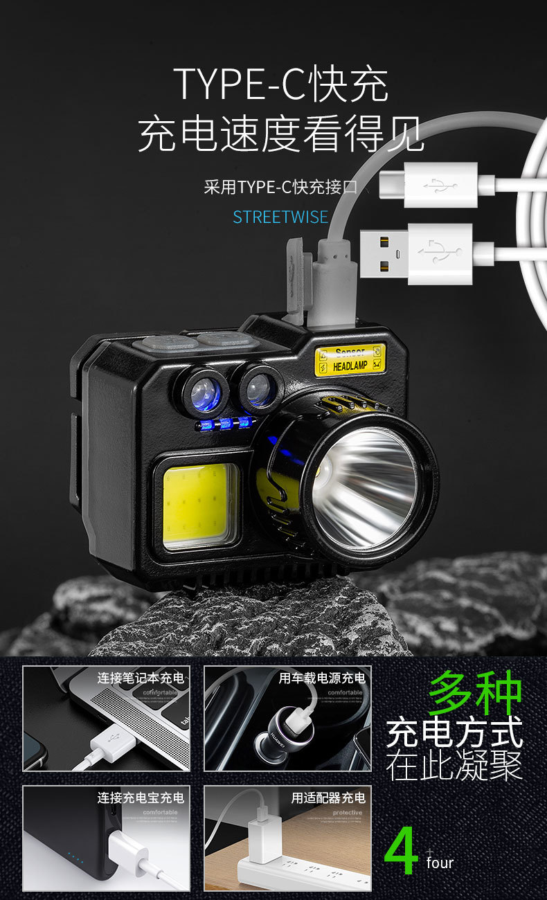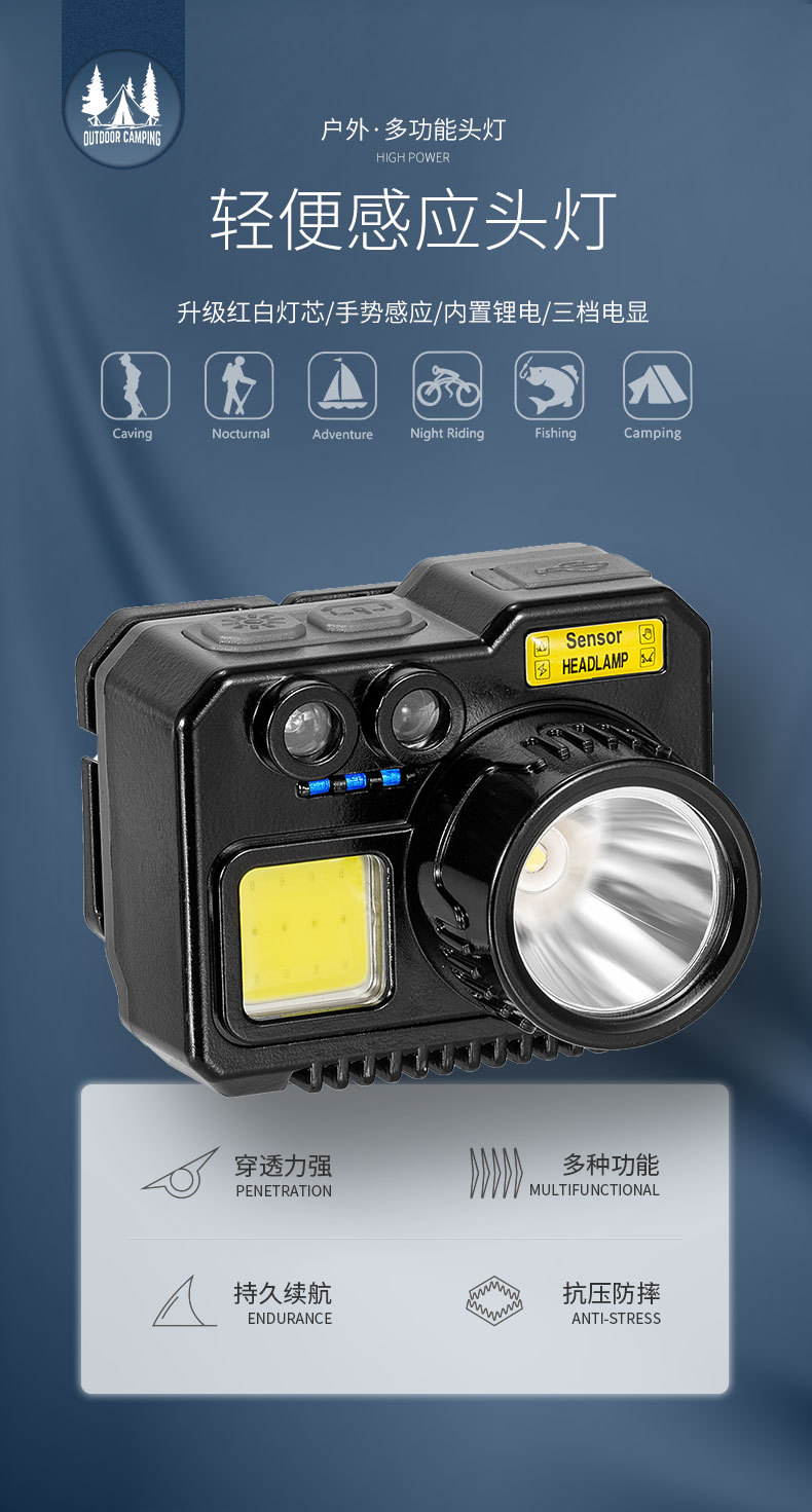 크로스 보더 아웃도어 슈퍼 브라이트 다기능 야간 낚시 지능형 유도 헤드 라이트 충전 긴 내구성 작업 등 유지 보수 등스토어 가기