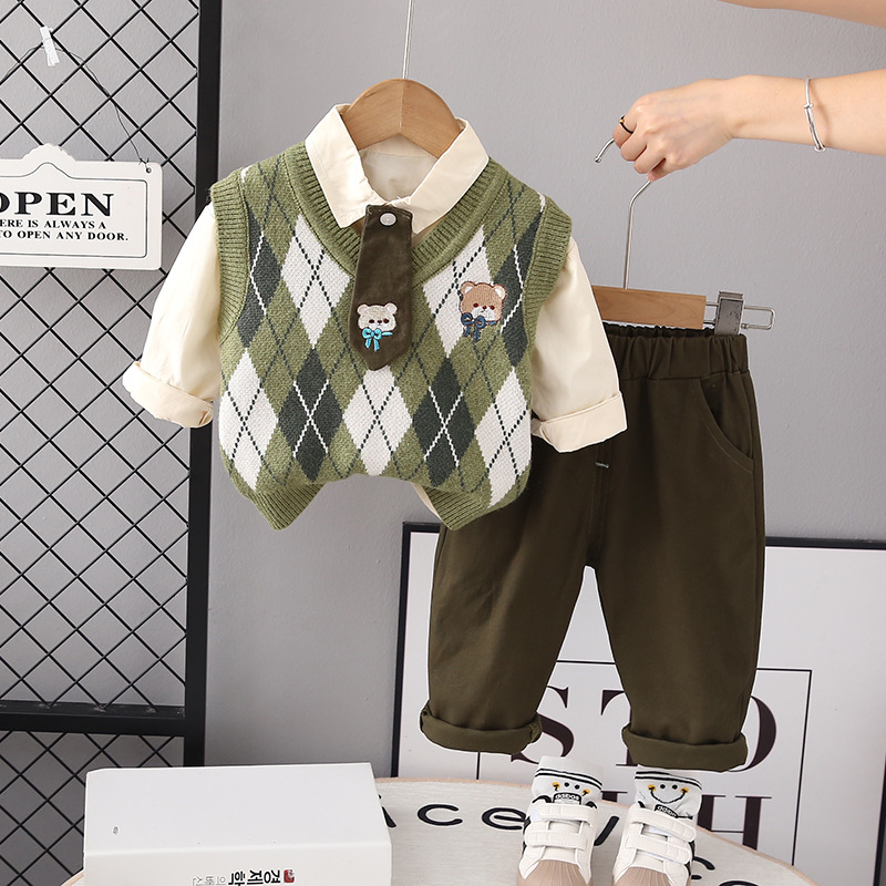 2023 새로운 대학 스타일 만화 넥타이 스웨터 3 피스 가을 긴 소매 캐주얼 남성 아동복 아기 세트스토어 가기