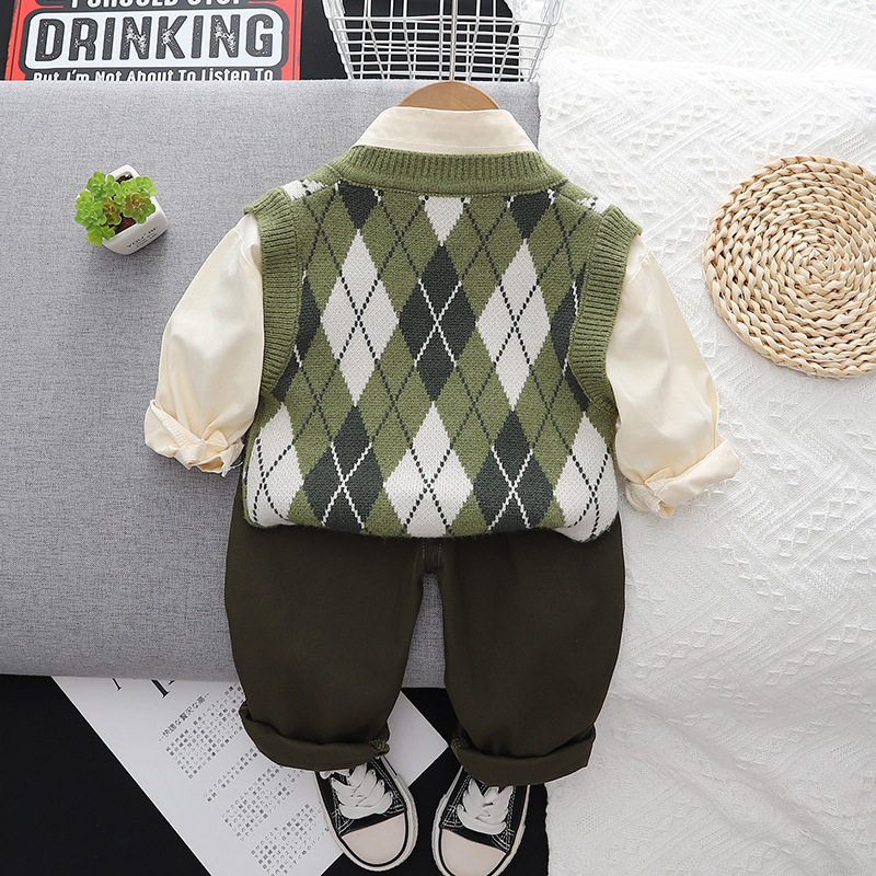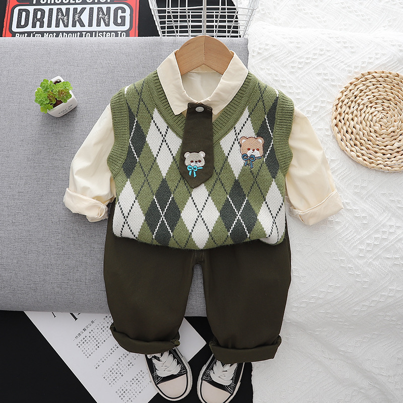 2023 새로운 대학 스타일 만화 넥타이 스웨터 3 피스 가을 긴 소매 캐주얼 남성 아동복 아기 세트