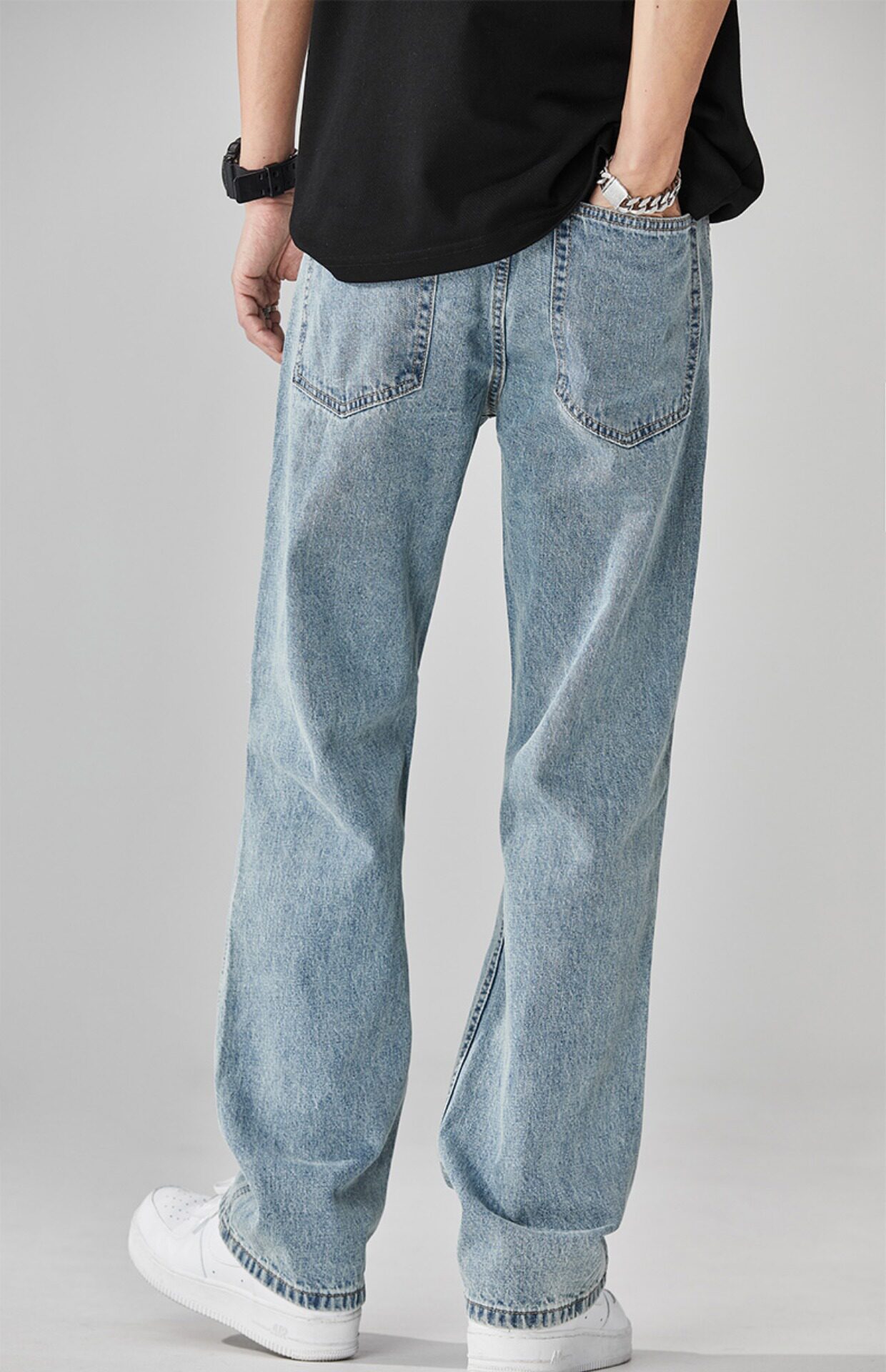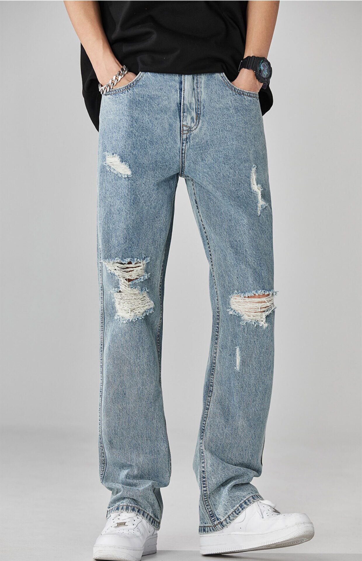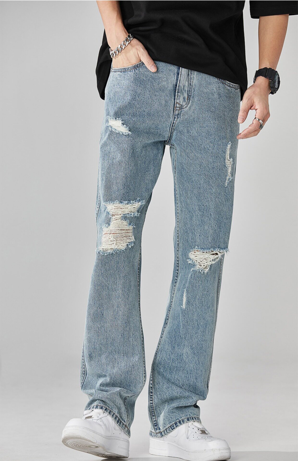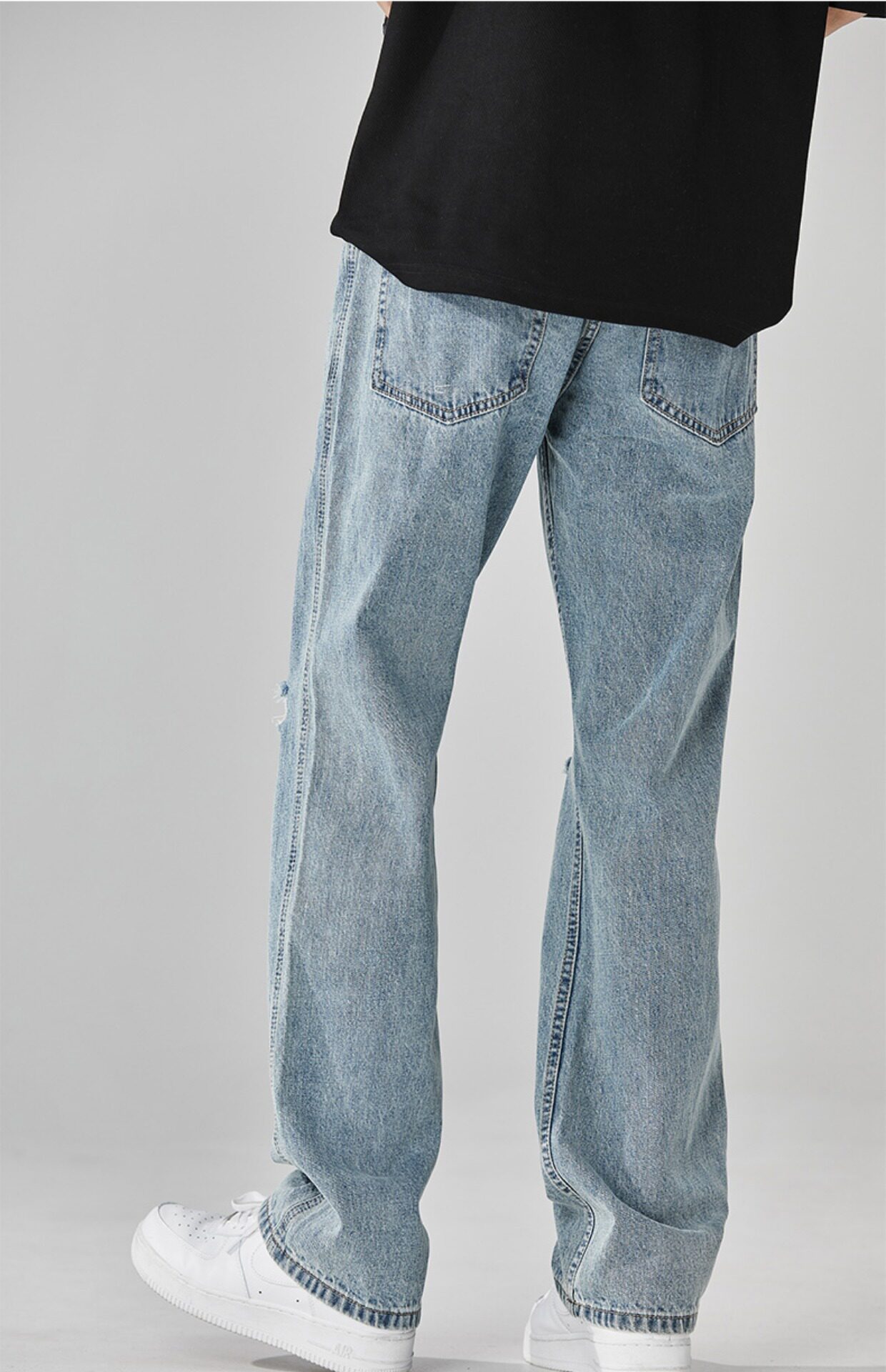 찢어진 청바지 남자의 트렌디 브랜드 느슨한 스트레이트 여름 미국 스타일 씻어 복고풍 덤피 슈아이 하이 스트리트 디자인 센스 바지스토어 가기