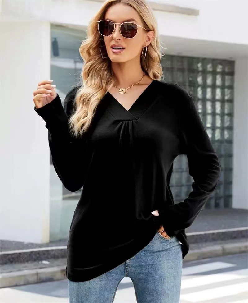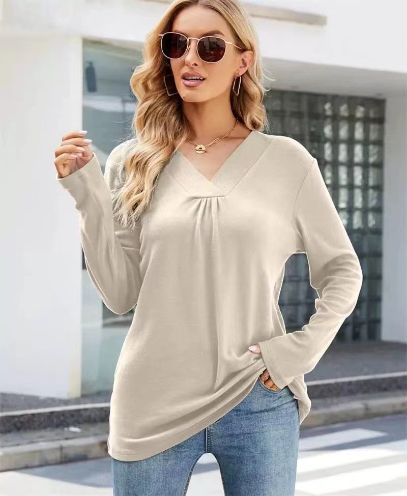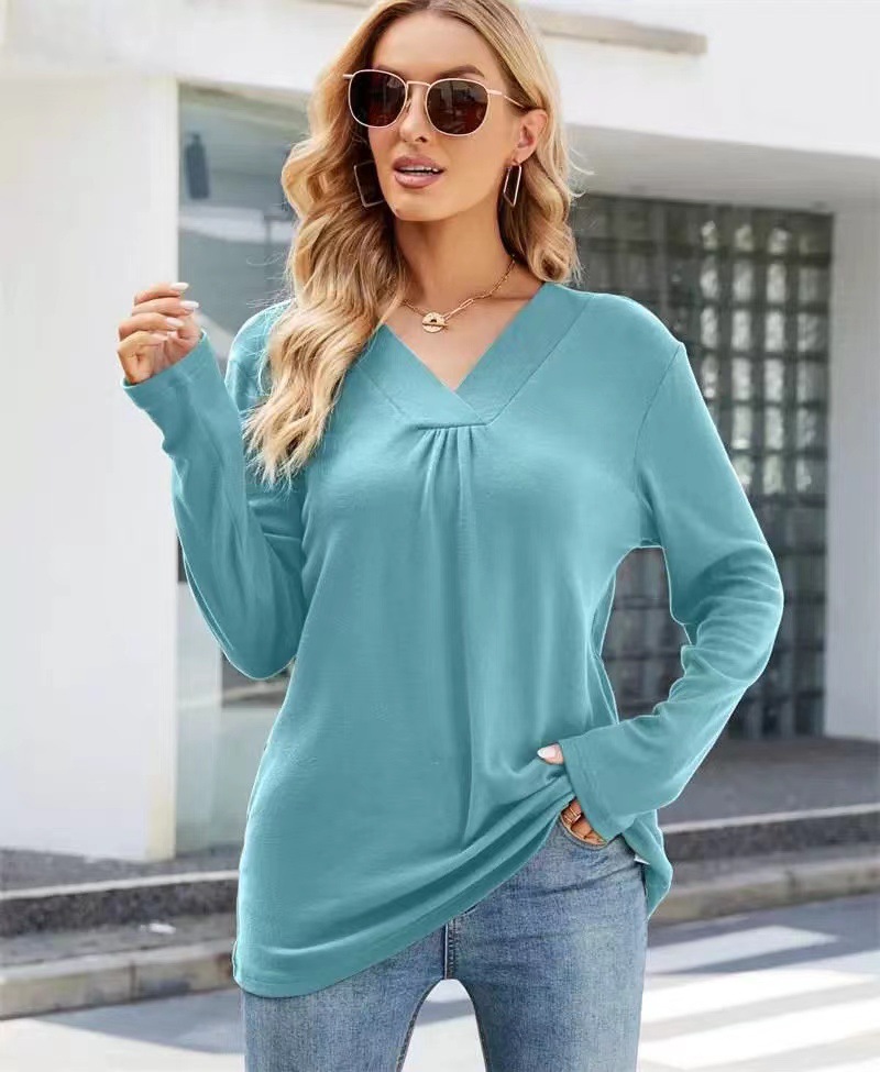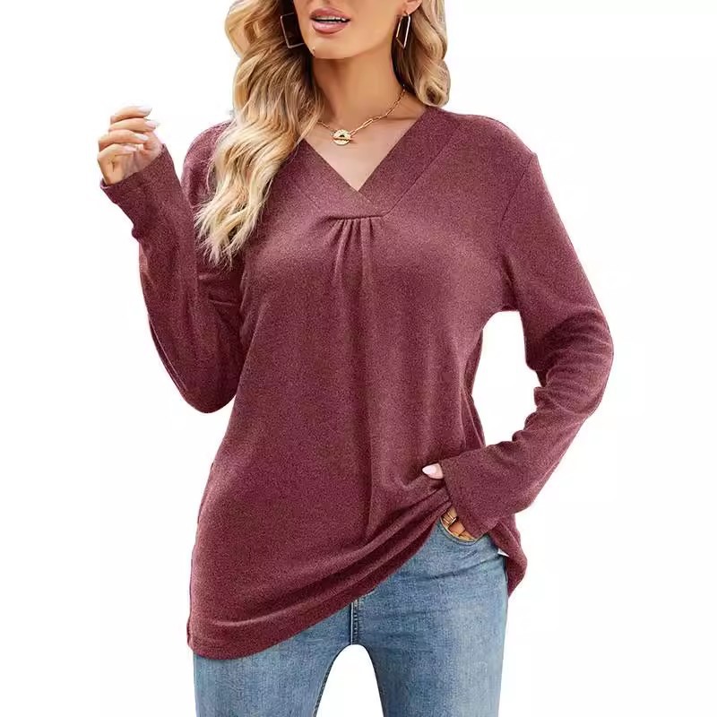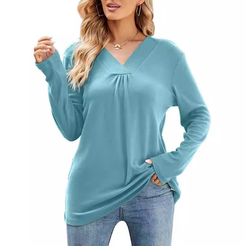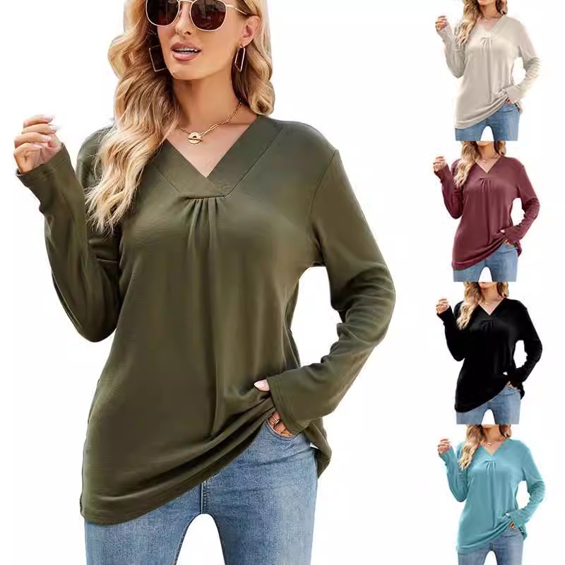 유럽과 미국의 국경 아마존 여성 2023 봄과 가을 새로운 패션 V-Neck Pleated 느슨한 긴팔 캐주얼 여성 티셔츠