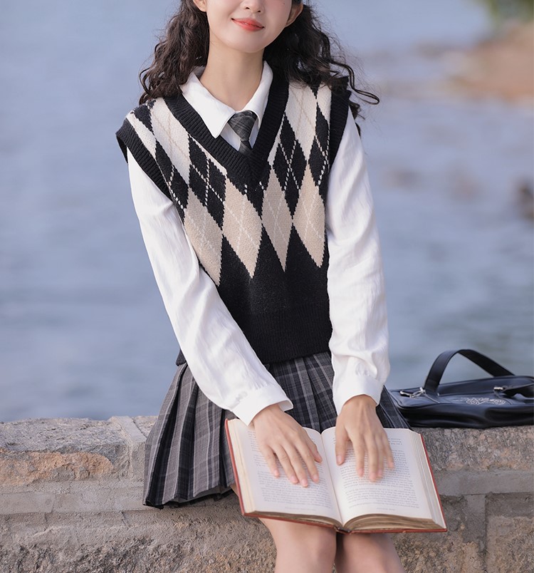 영국 아카데미 스타일 스웨터 조끼 여성의 가을과 겨울 겹치는 마름모꼴 대비 색상 니트 조끼 조랑말 클립 레트로 탑 여성