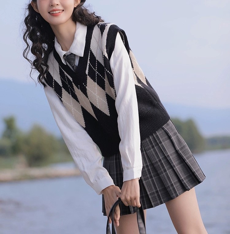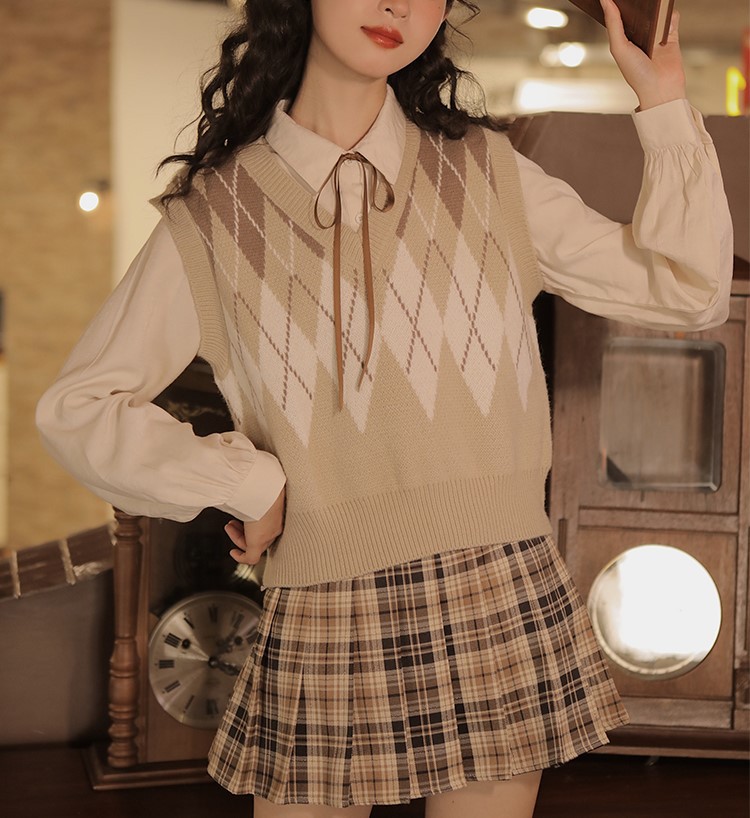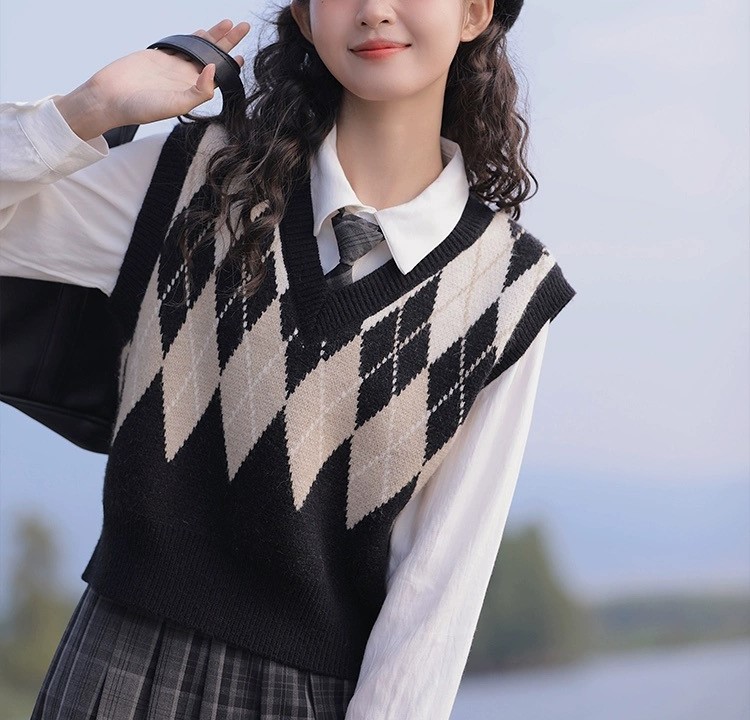 영국 아카데미 스타일 스웨터 조끼 여성의 가을과 겨울 겹치는 마름모꼴 대비 색상 니트 조끼 조랑말 클립 레트로 탑 여성스토어 가기