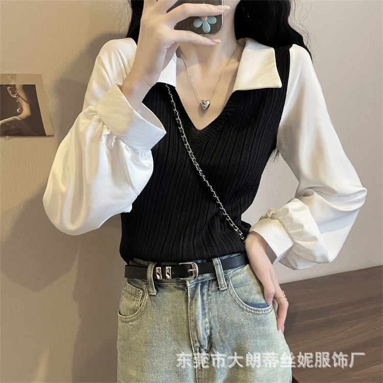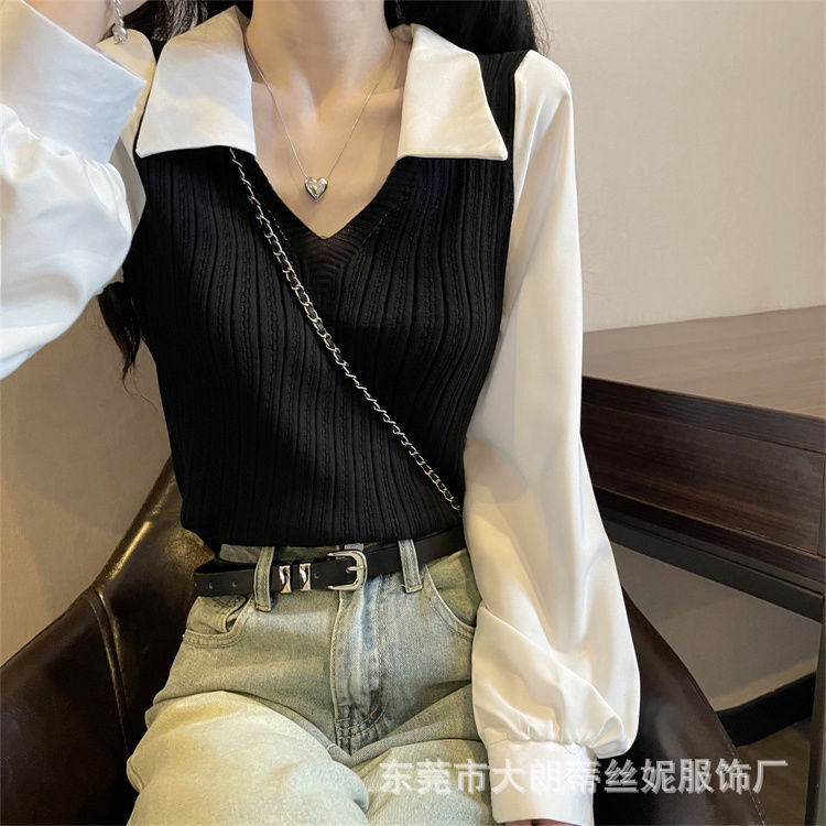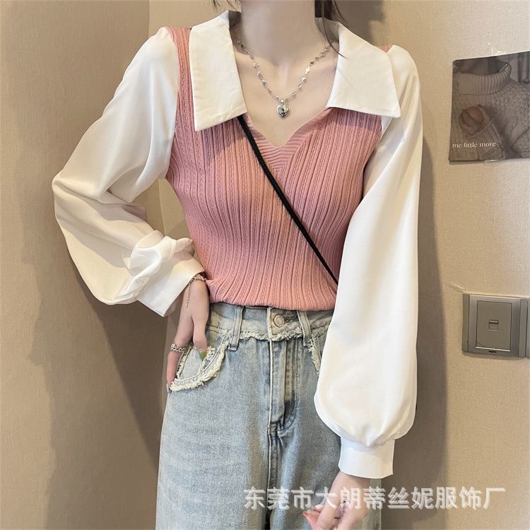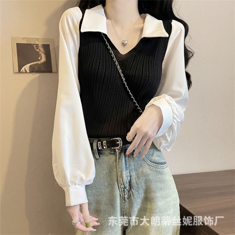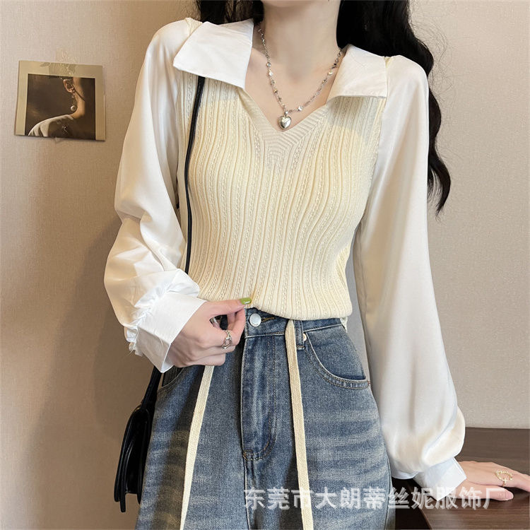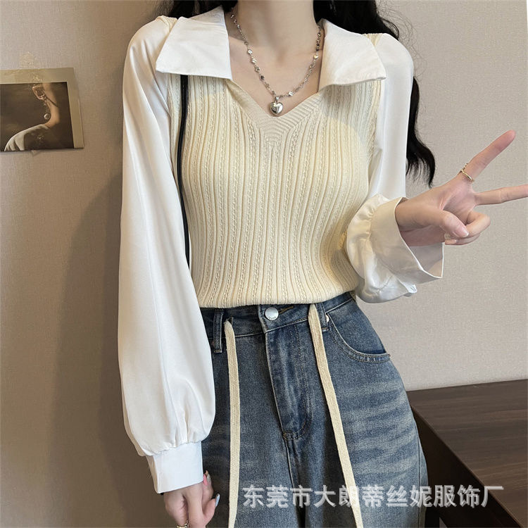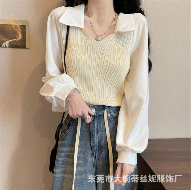 프렌치 틈새 시크 셔츠 여성의 이른 가을 스티치 옷깃 랜턴 슬리브 가짜 투피스 디자인 감각 짧은 니트 탑