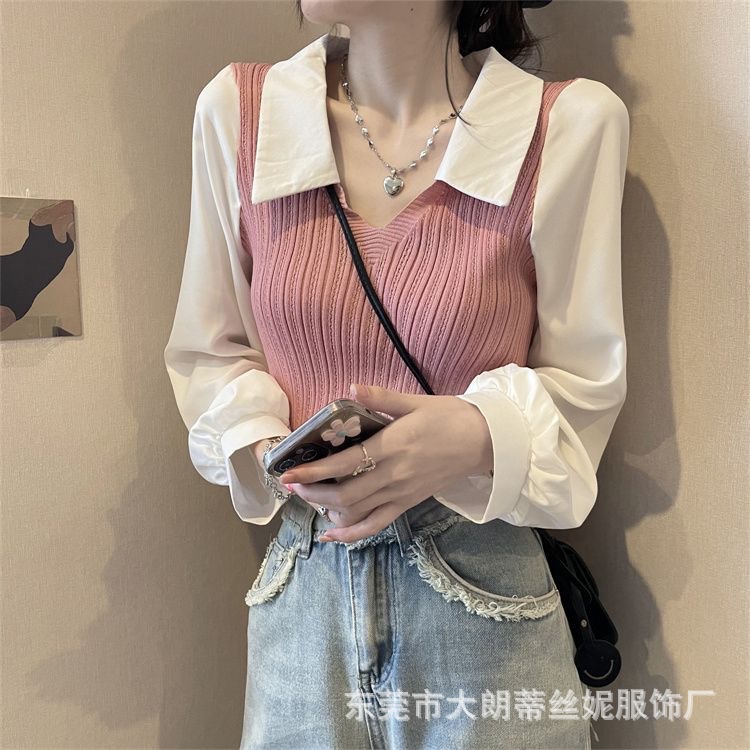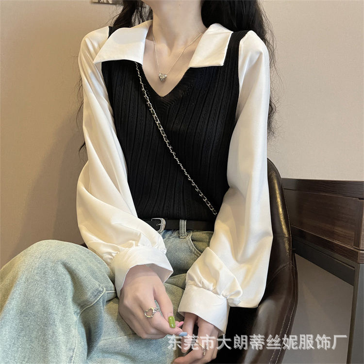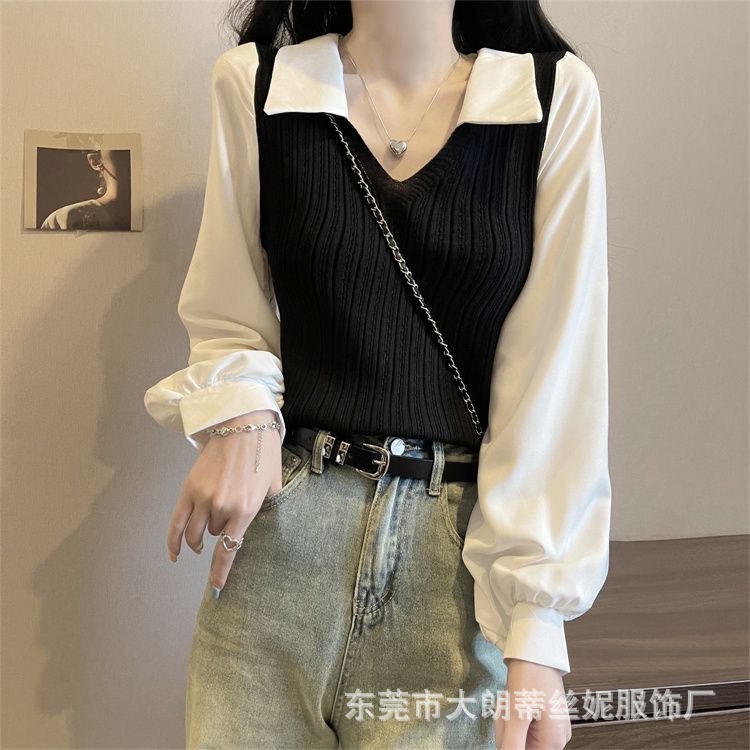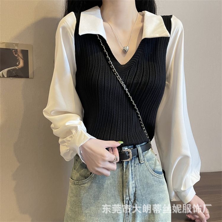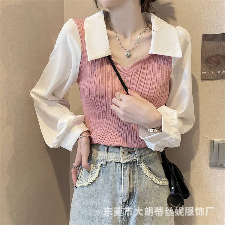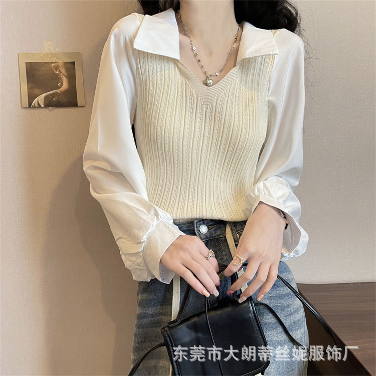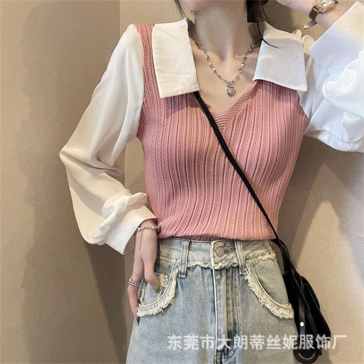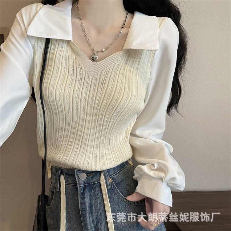 프렌치 틈새 시크 셔츠 여성의 이른 가을 스티치 옷깃 랜턴 슬리브 가짜 투피스 디자인 감각 짧은 니트 탑