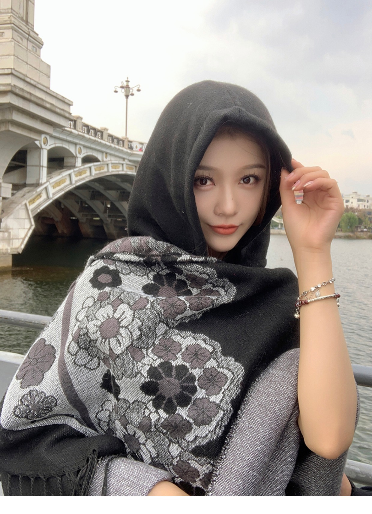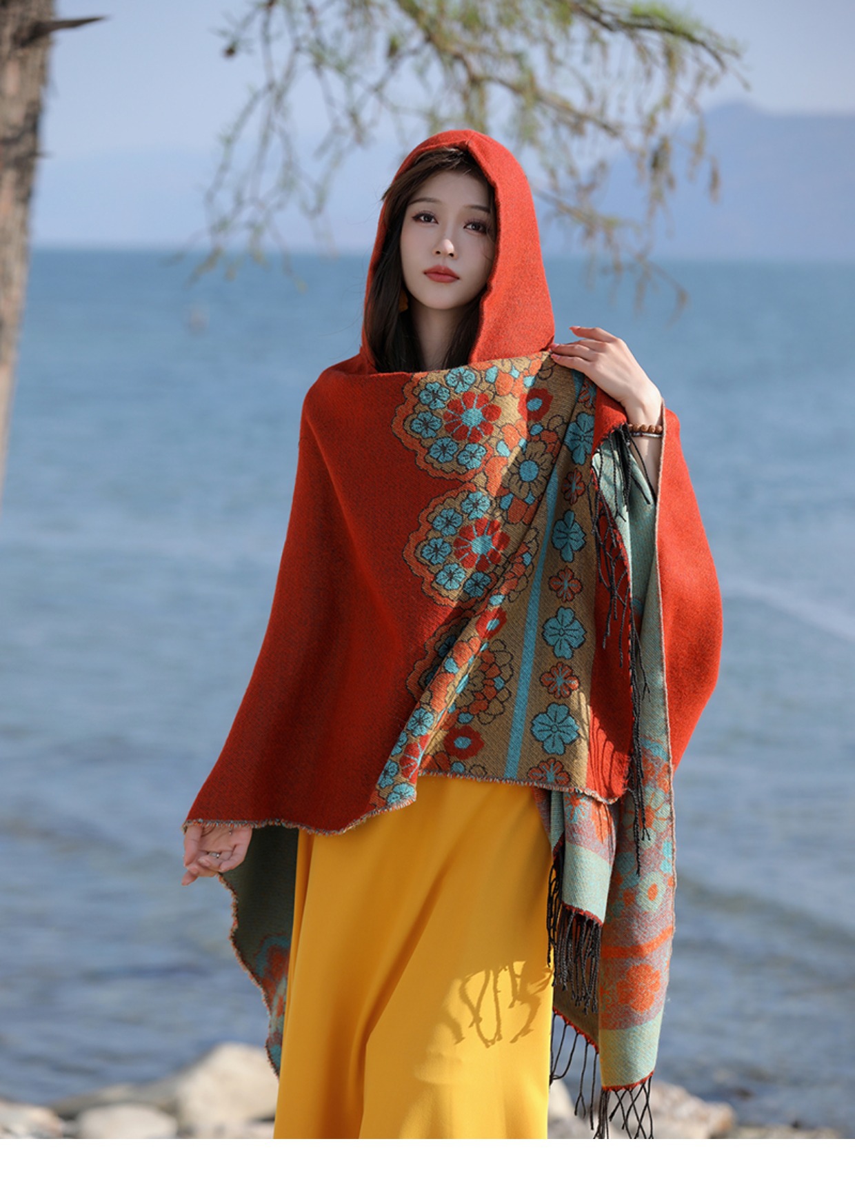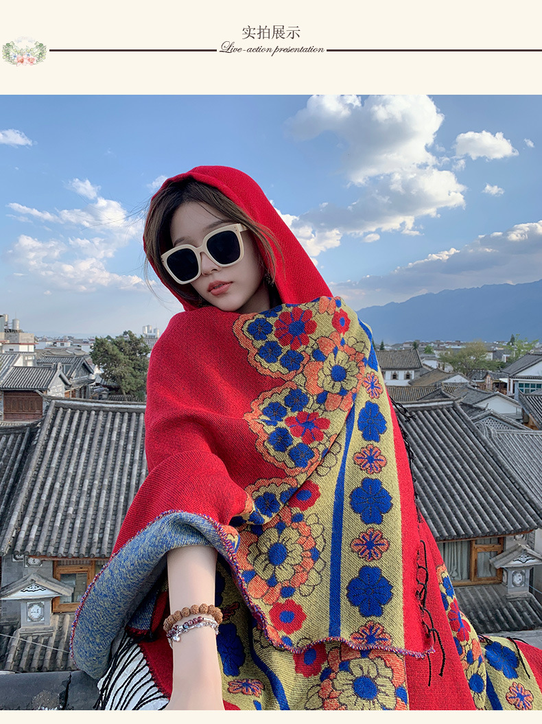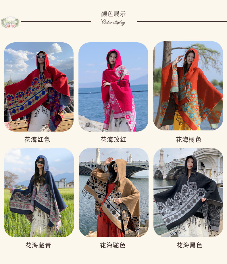 휴가 에스닉 스타일 후드 망토 숄 여성용 여행복 사진 빨간 꽃 망토 두꺼운 따뜻한 겉옷스토어 가기