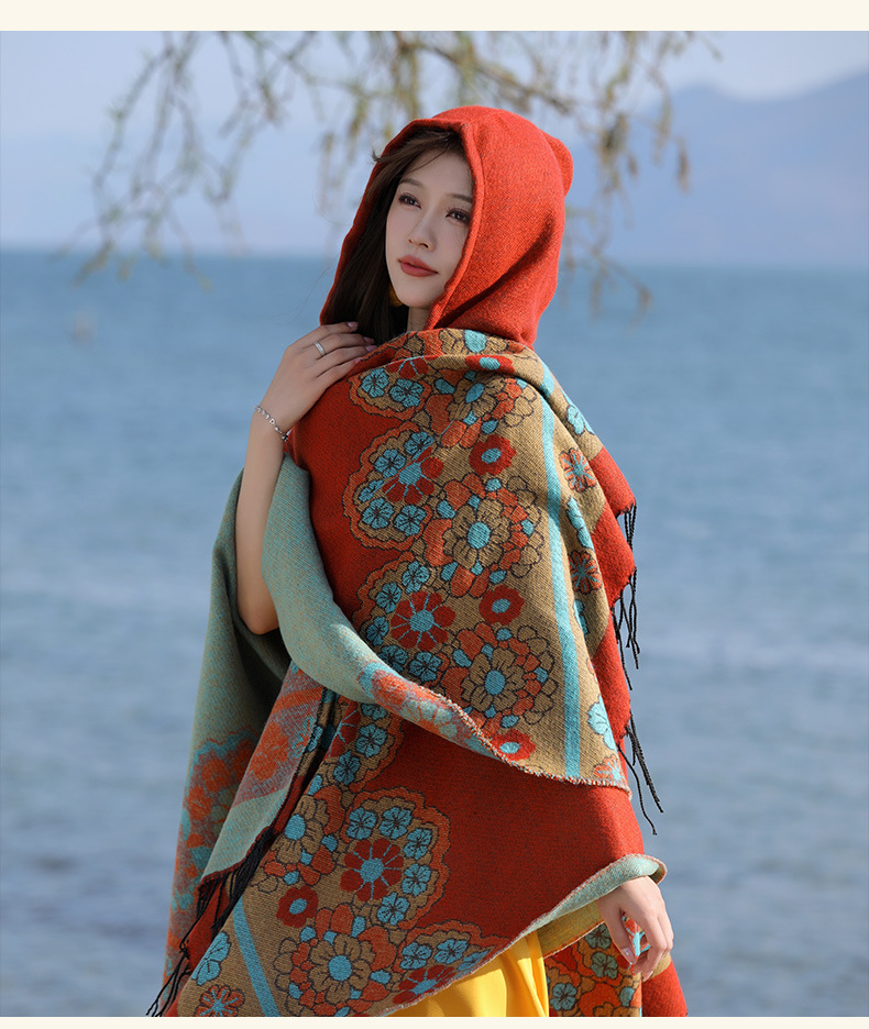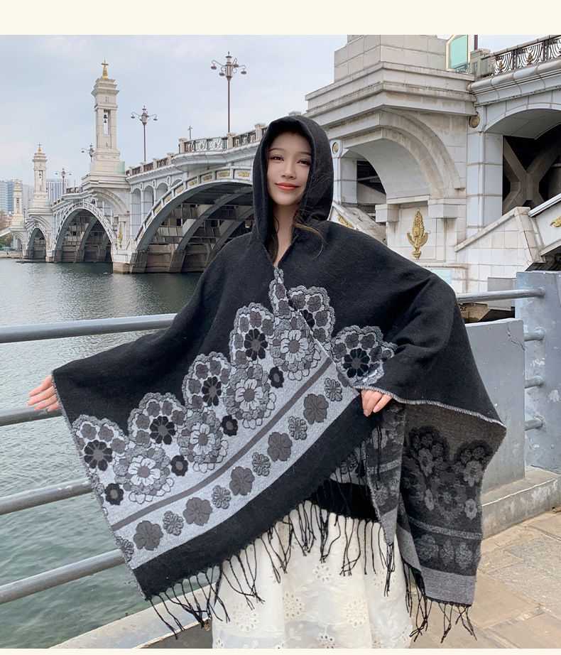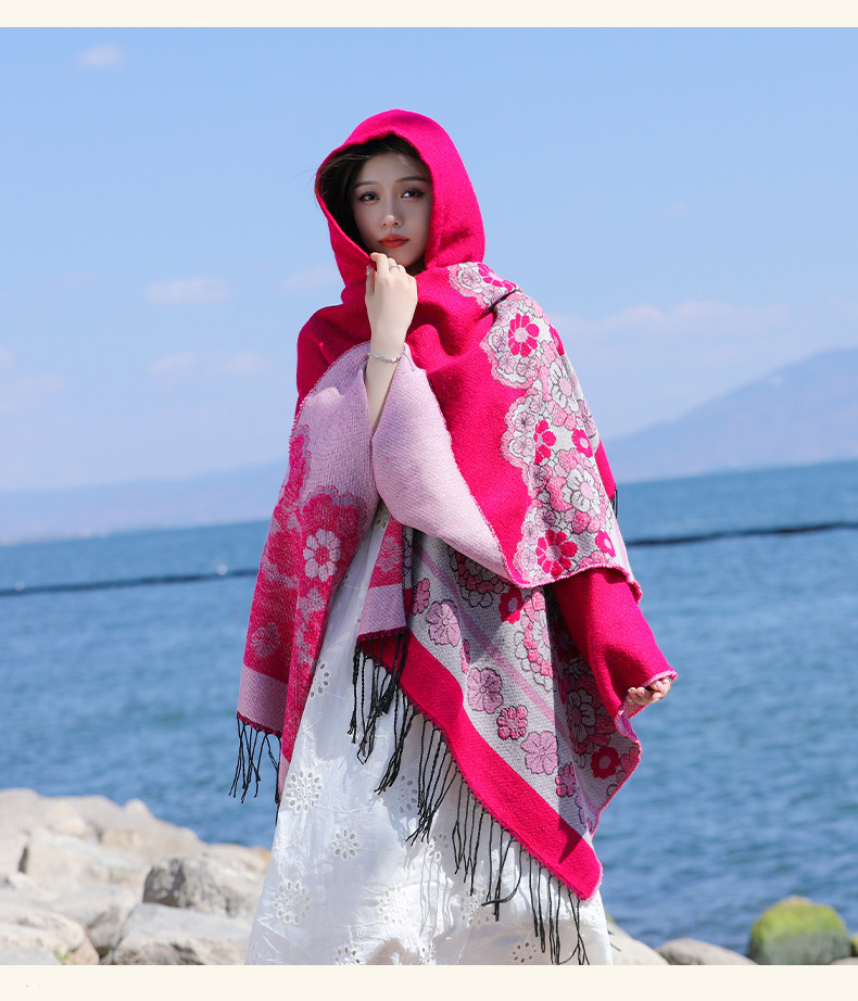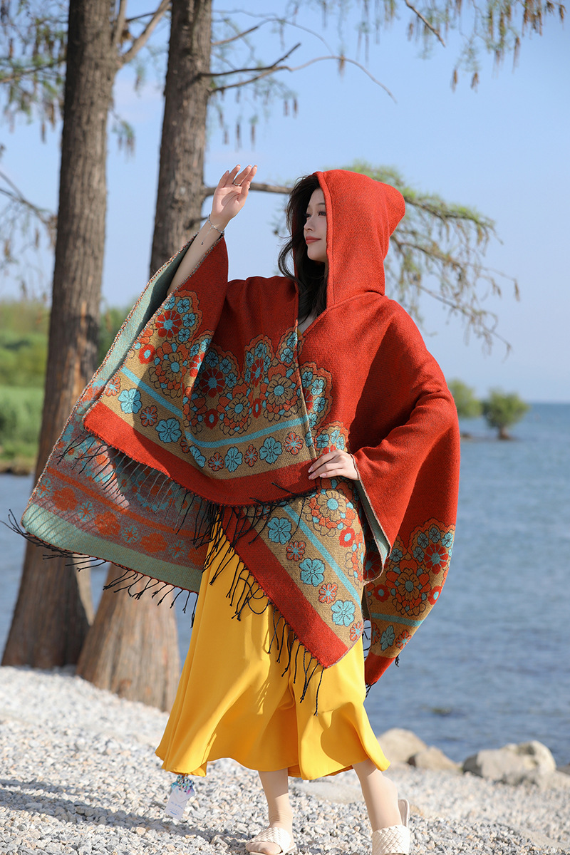 휴가 에스닉 스타일 후드 망토 숄 여성용 여행복 사진 빨간 꽃 망토 두꺼운 따뜻한 겉옷
