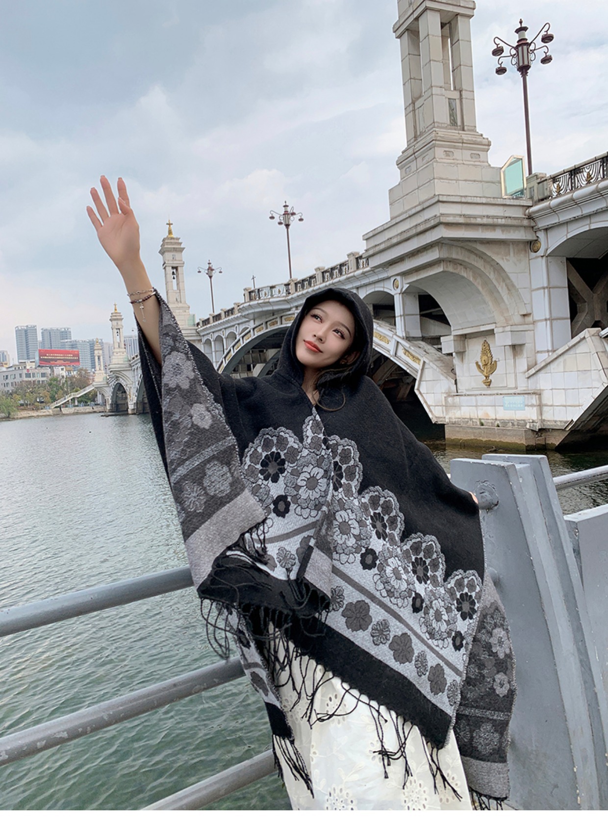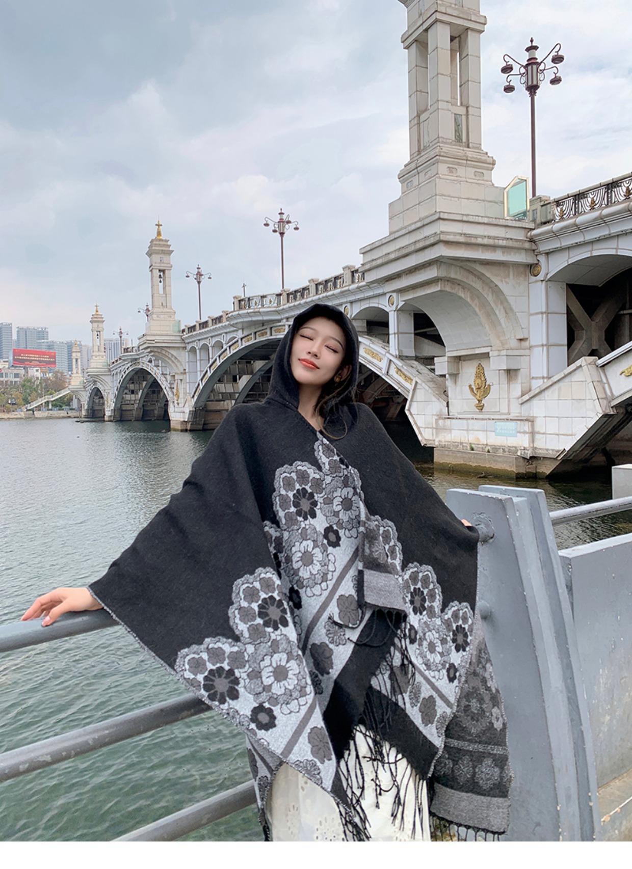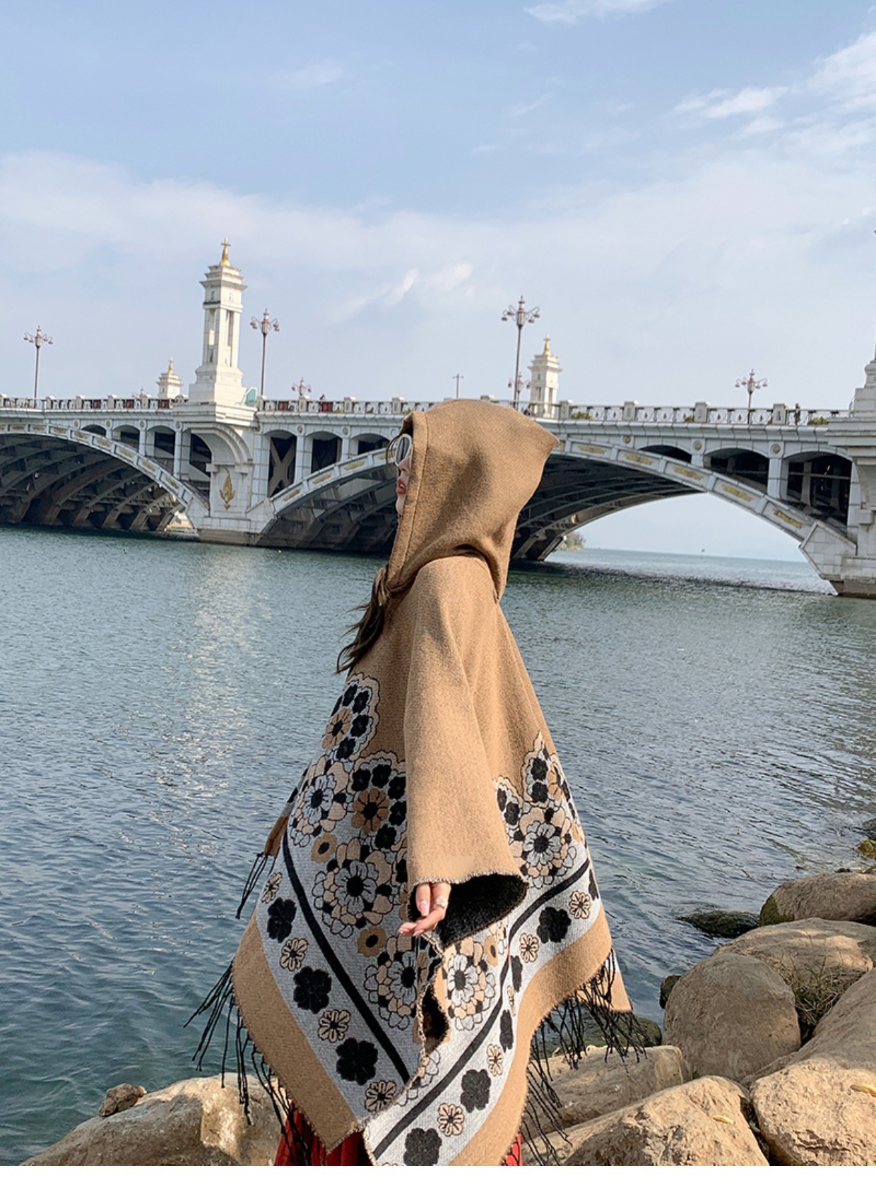 휴가 에스닉 스타일 후드 망토 숄 여성용 여행복 사진 빨간 꽃 망토 두꺼운 따뜻한 겉옷