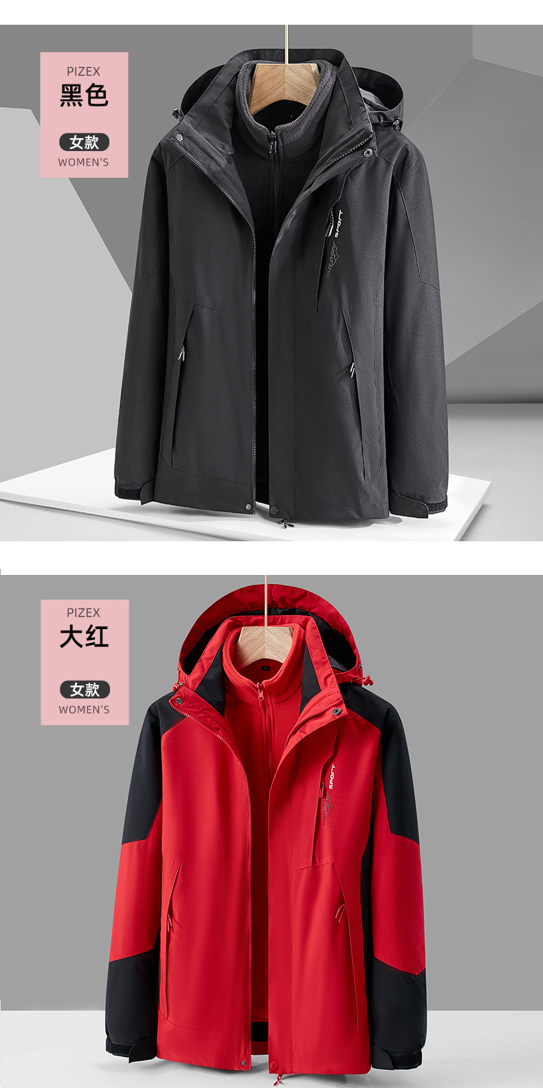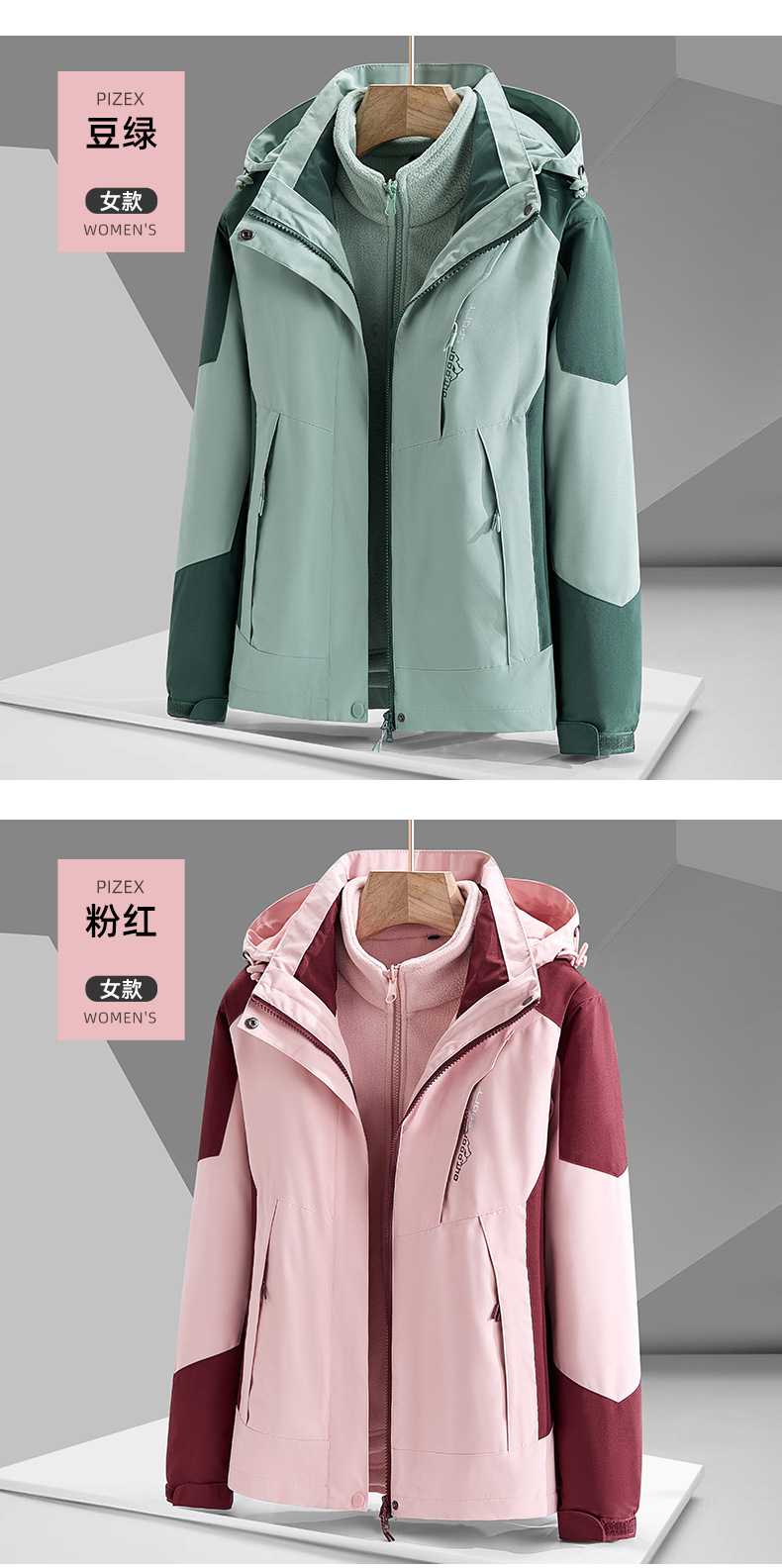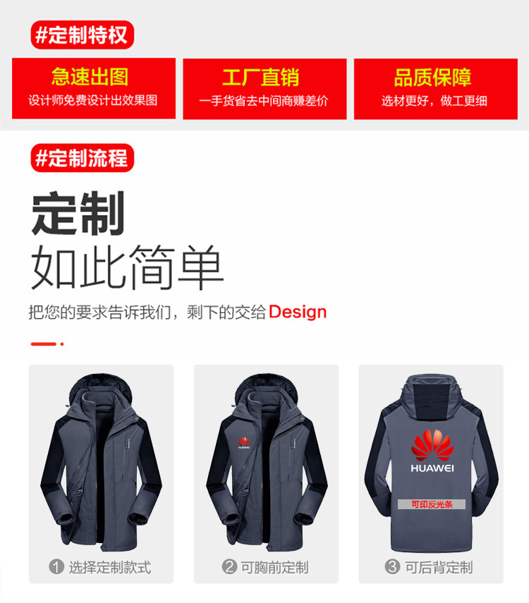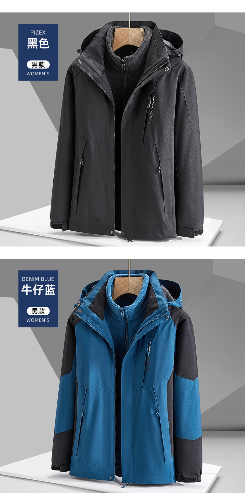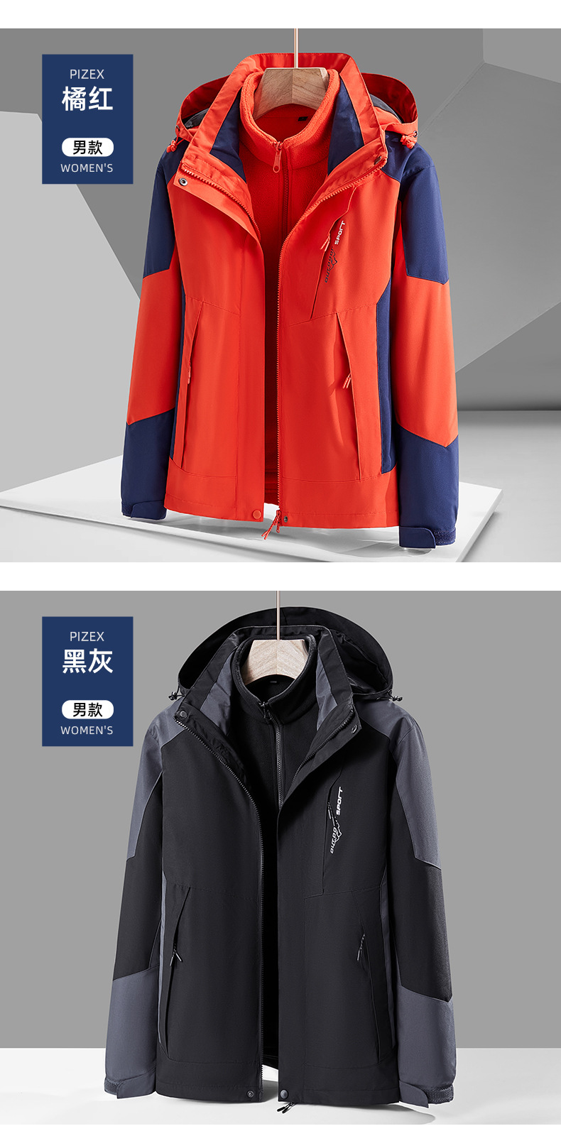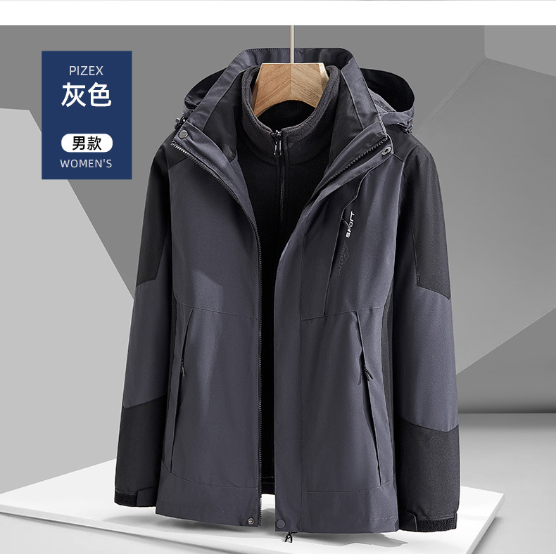 남녀공용 3-in-1 탈부착 가능 투피스 팀복 등산복 로고 인쇄 가능 탈부착 가능한 내피