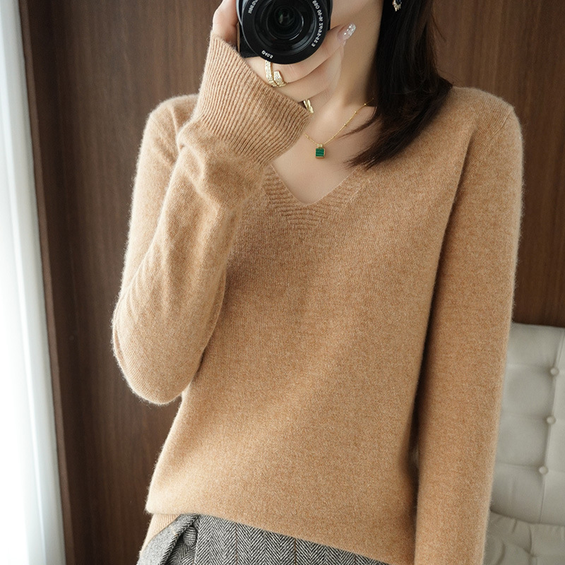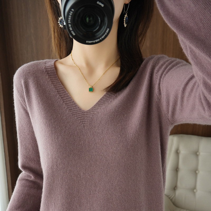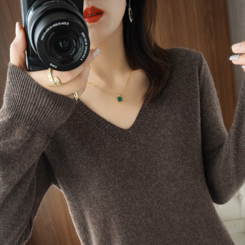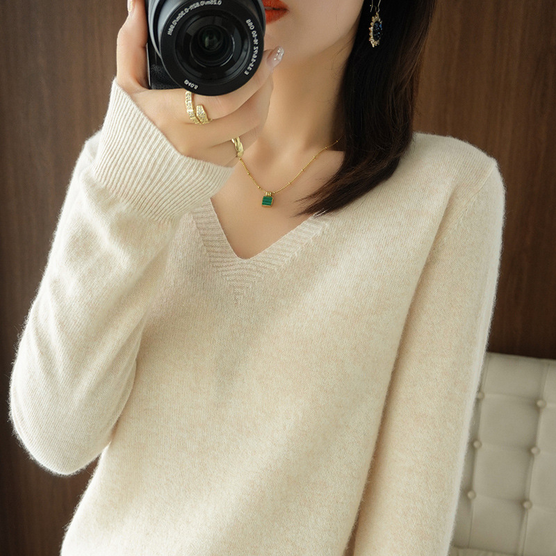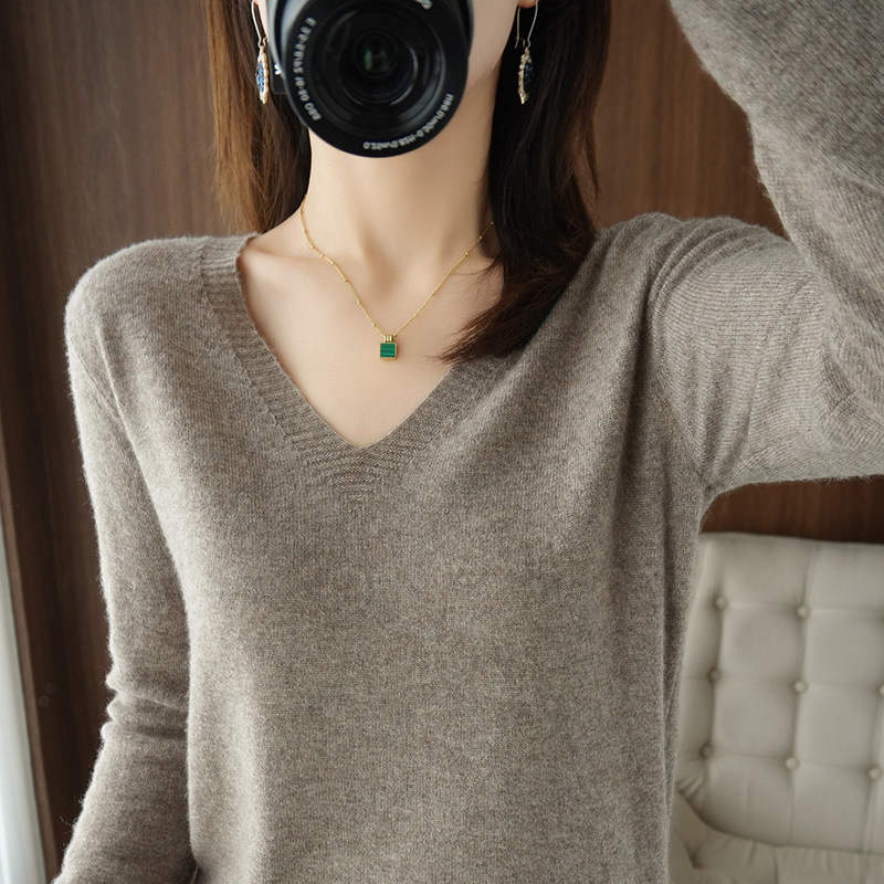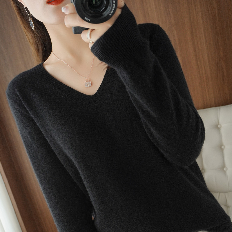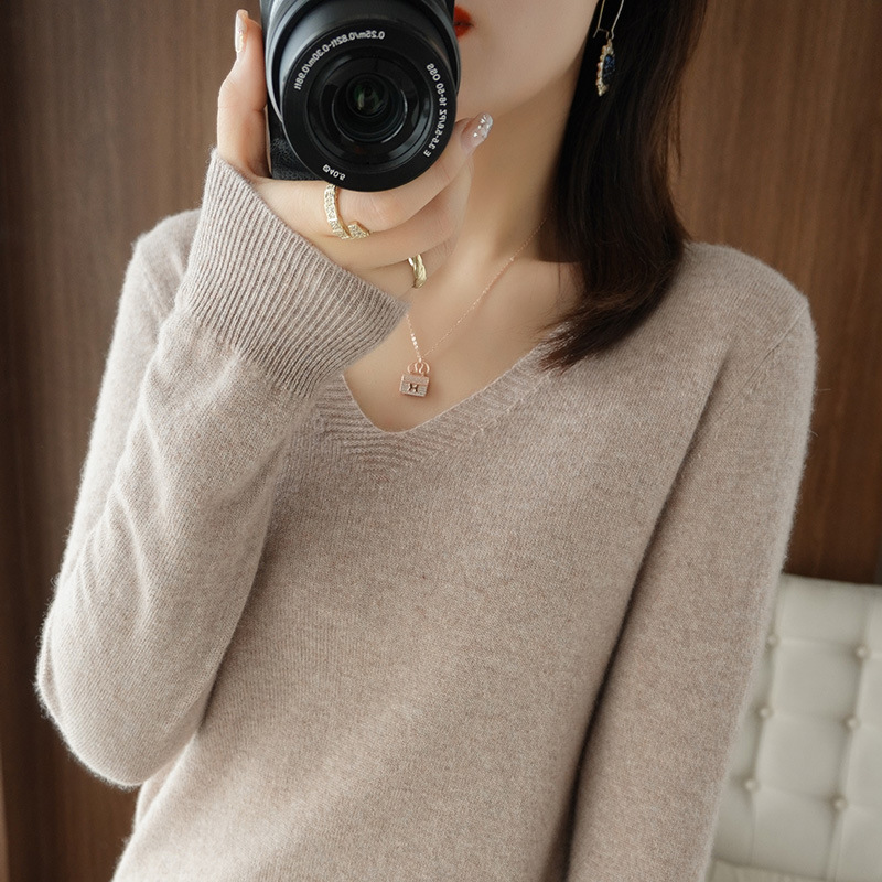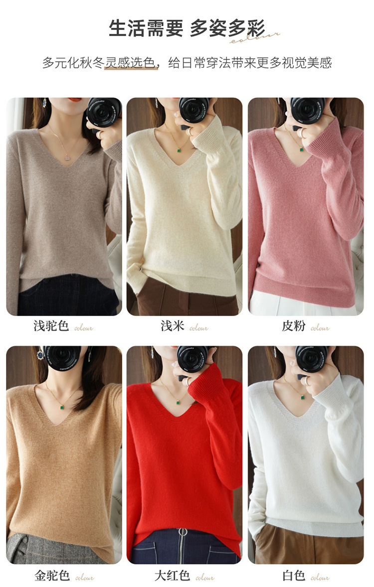 크로스보더 봄, 가을 여성용 브이넥 숏 풀오버 슬림핏 솔리드 컬러 베이스 니트 스웨터, 부드럽고 활용도가 높은 탑스토어 가기