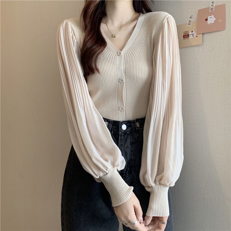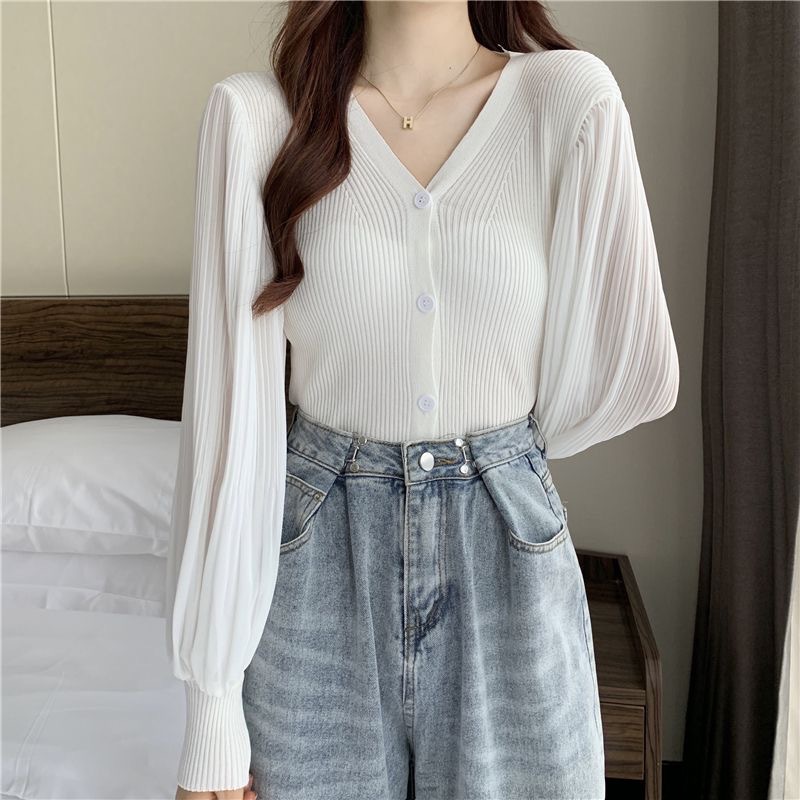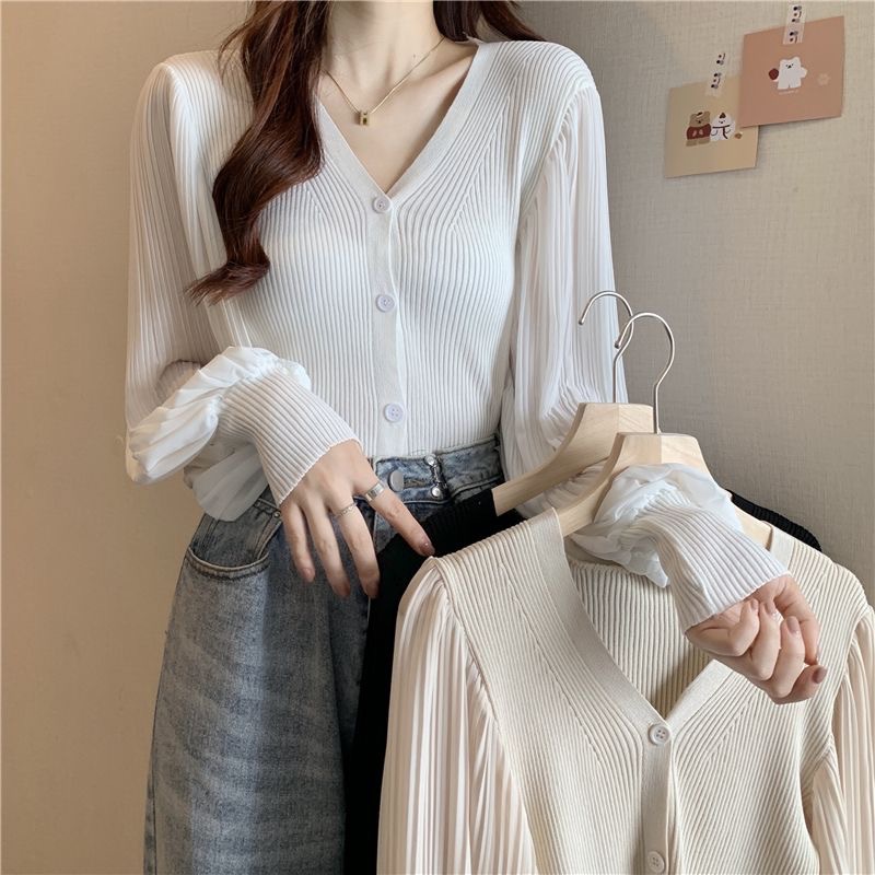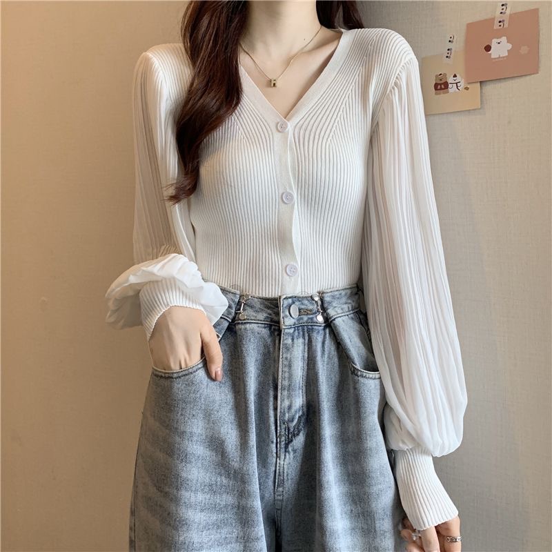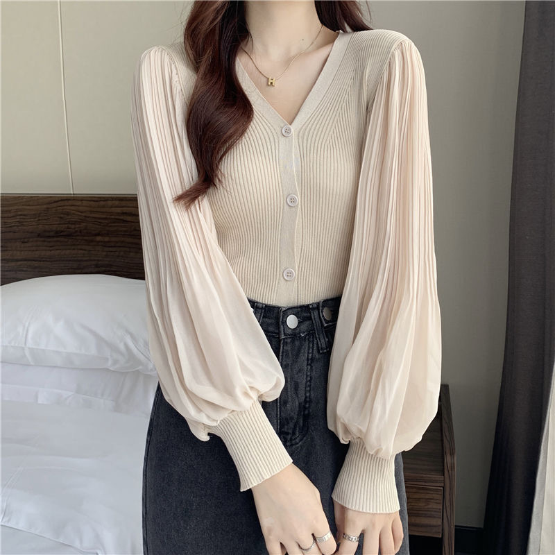 브이넥 랜턴 슬리브 쉬폰 스티칭 우아한 여성 여름 2023 싱글 브레스트 한국식 슬림 니트 가디건 탑