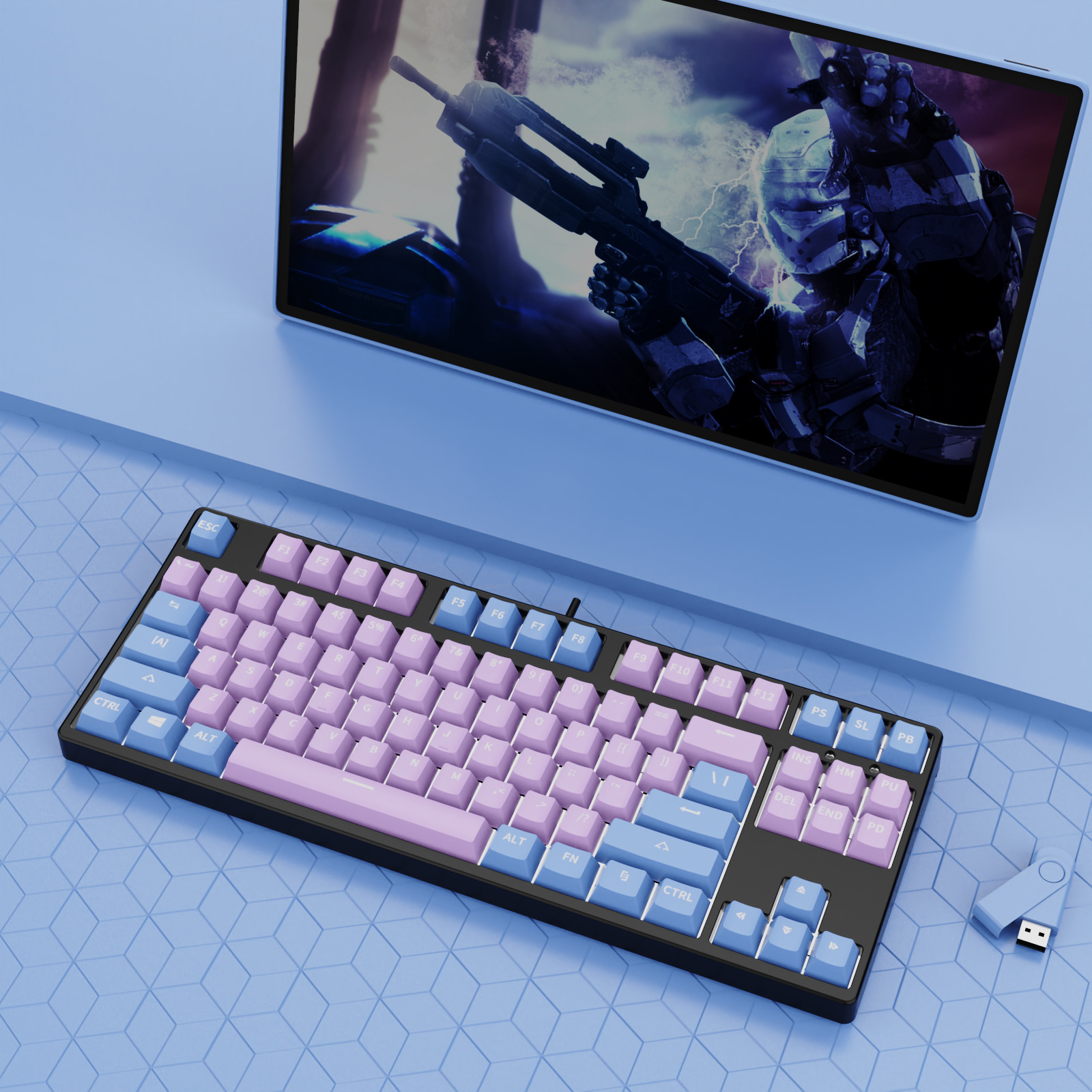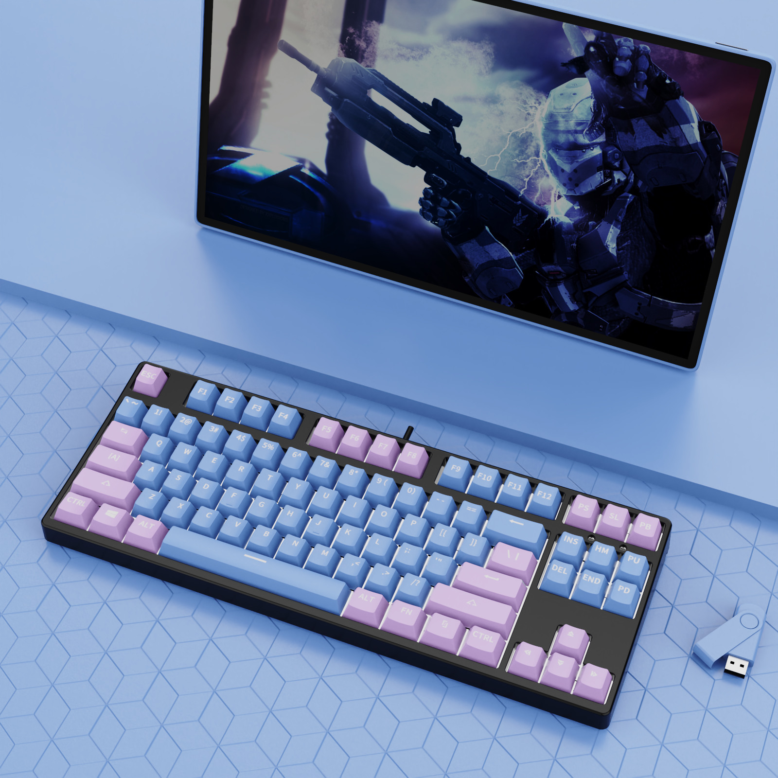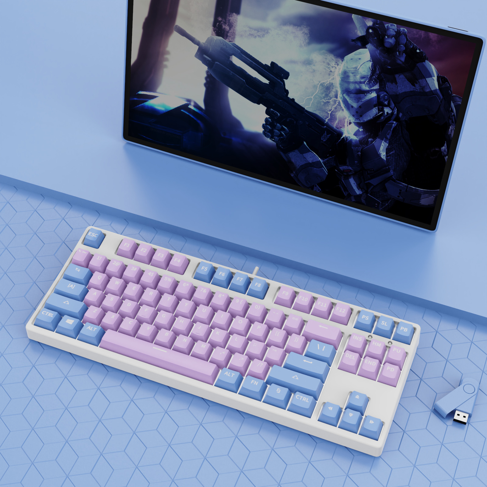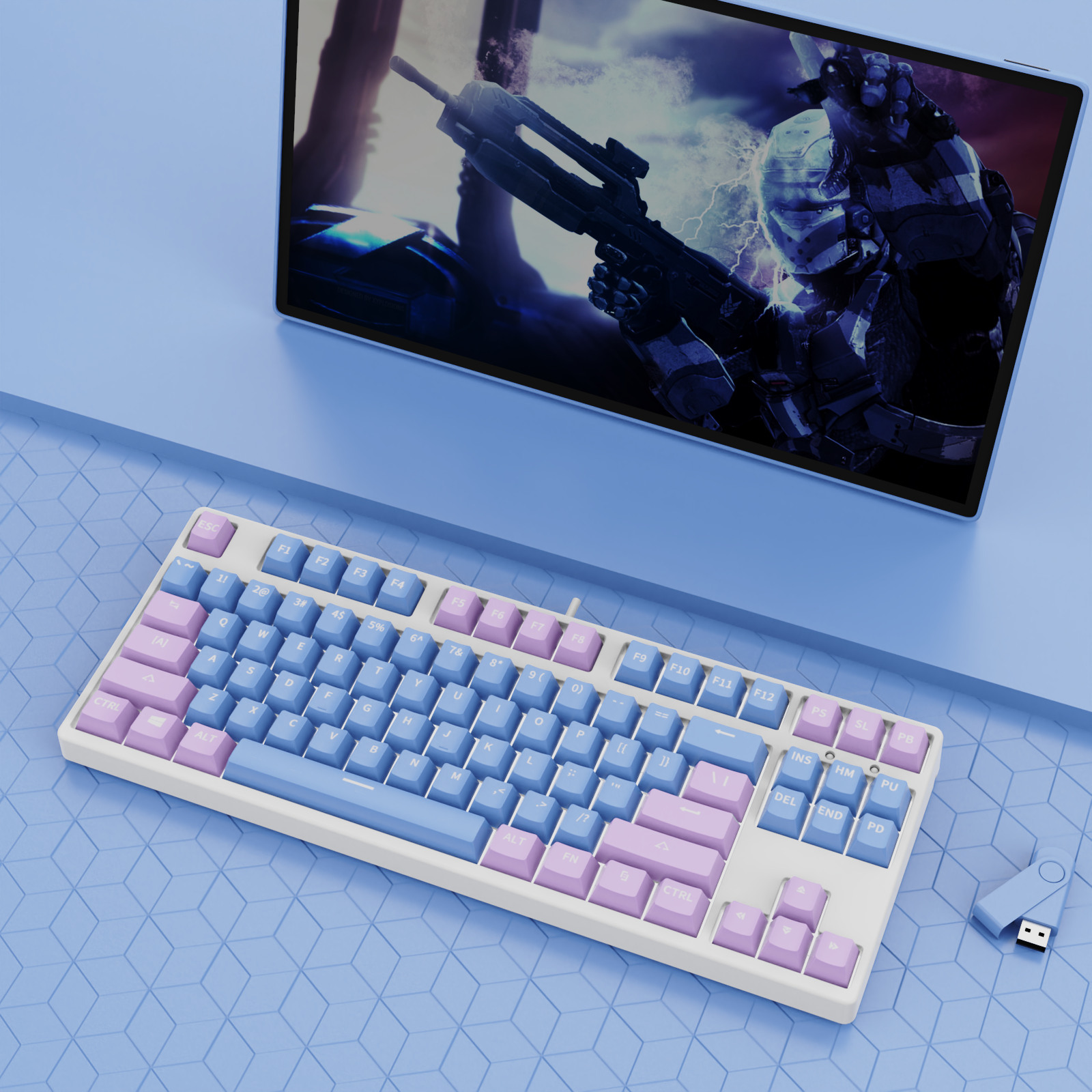 • 87 키 블루투스 3 모드-흰색 배경-내부 파우더 외부 파란색-RGB 조명