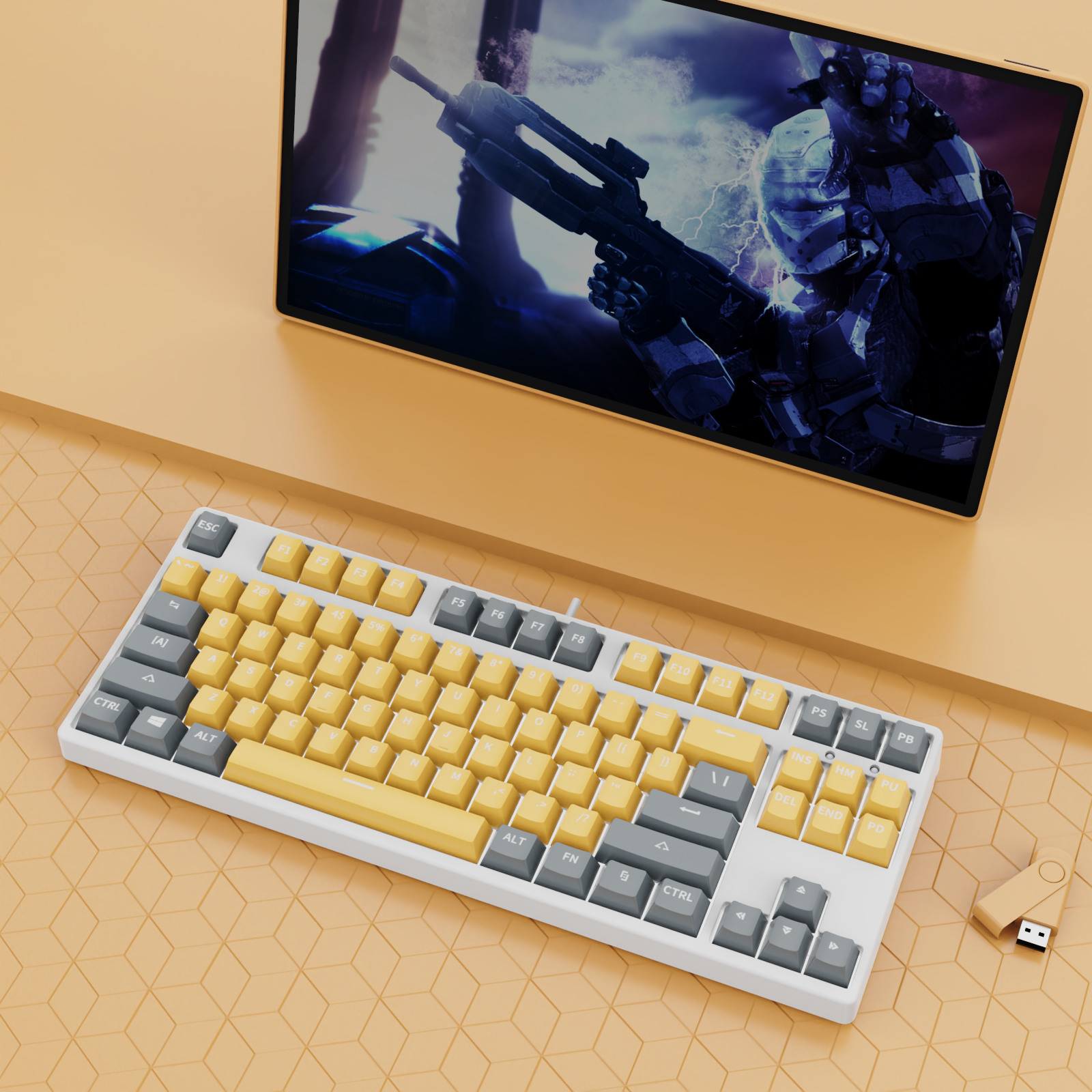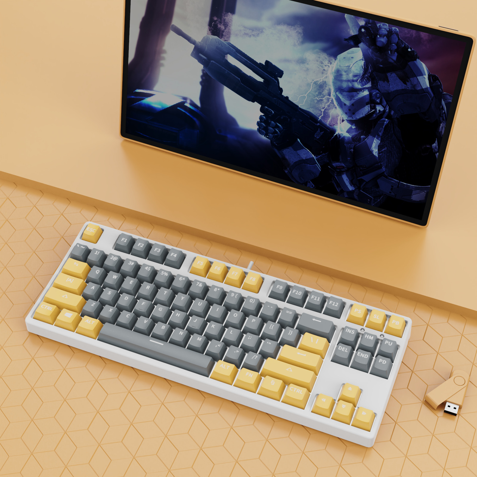 • 87 키 블루투스 3 모드-흰색 배경-내부 노란색 및 외부 회색-RGB 조명