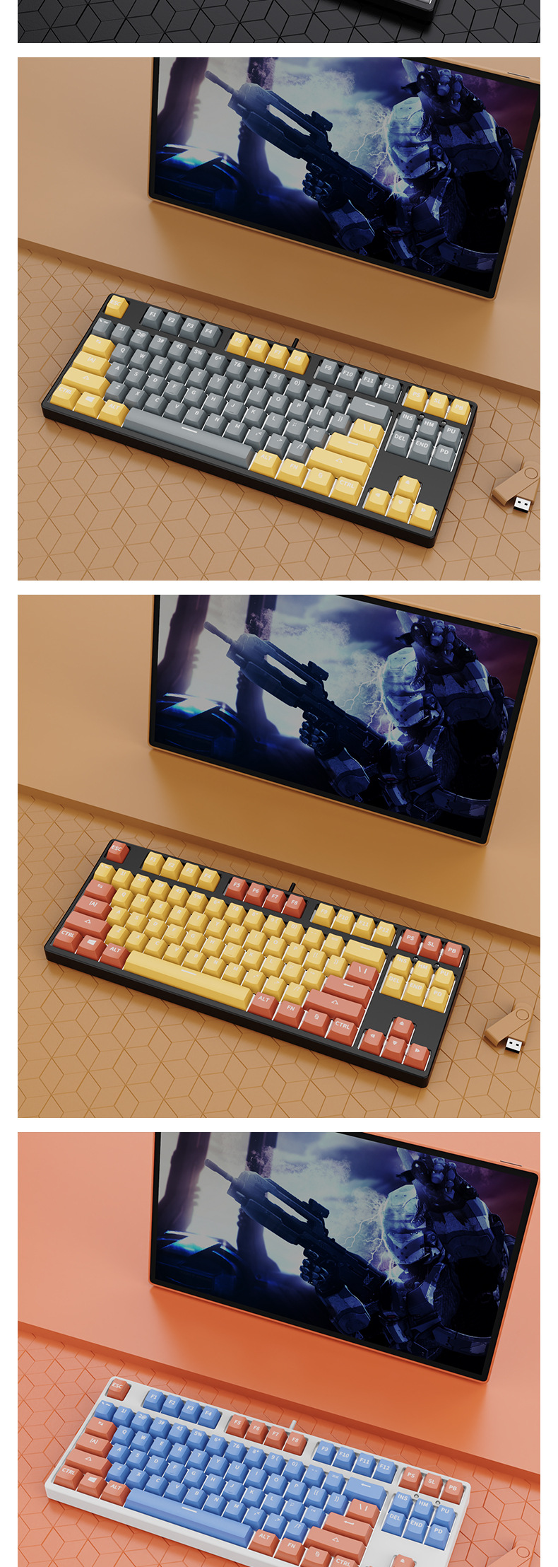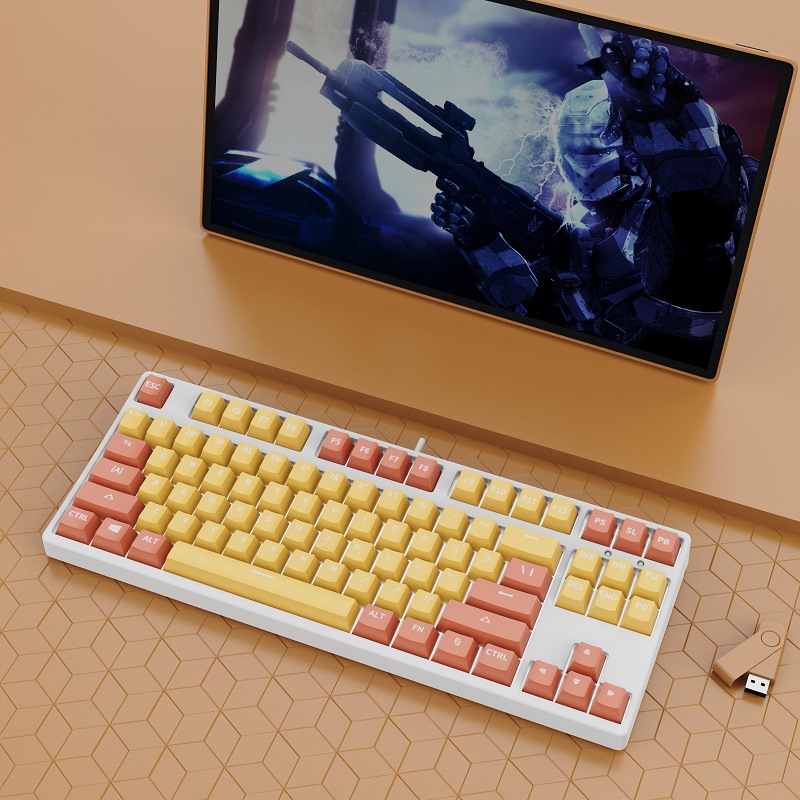 • 87 키 블루투스 3 모드-흰색 배경-내부 주황색 및 외부 노란색-RGB 조명