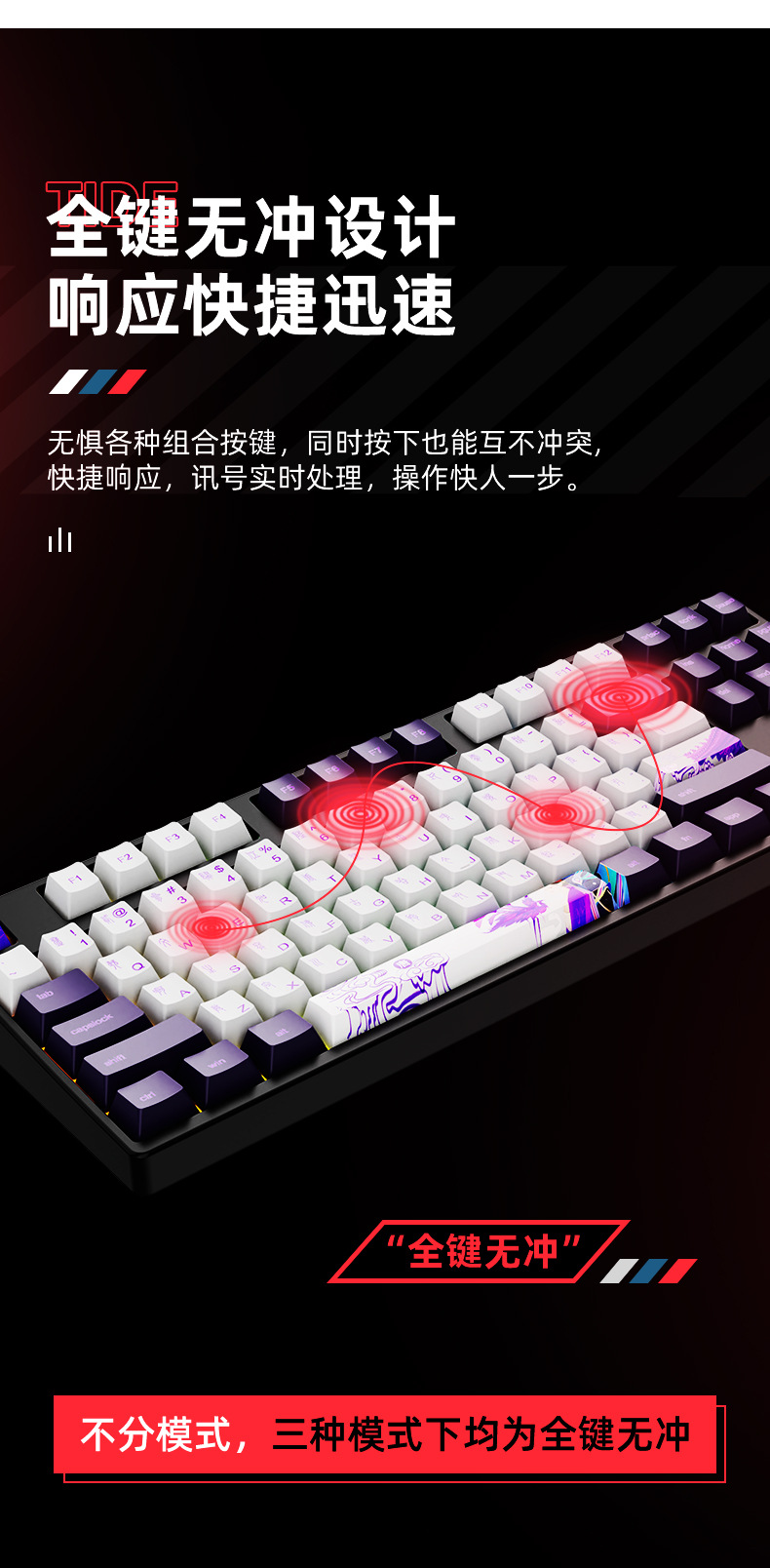 • 87 키 블루투스 3 모드-검정색 배경-내부 흰색 및 외부 보라색-RGB 조명
