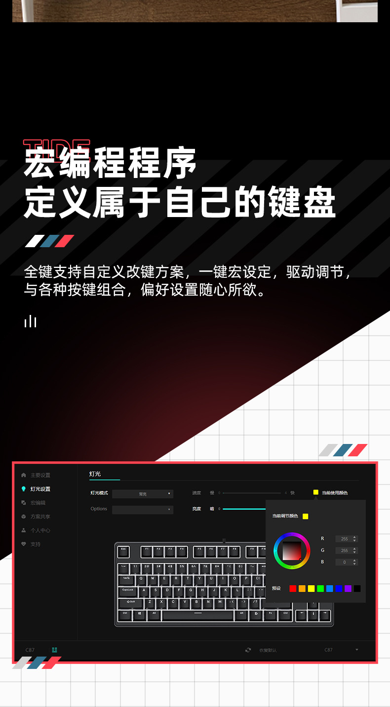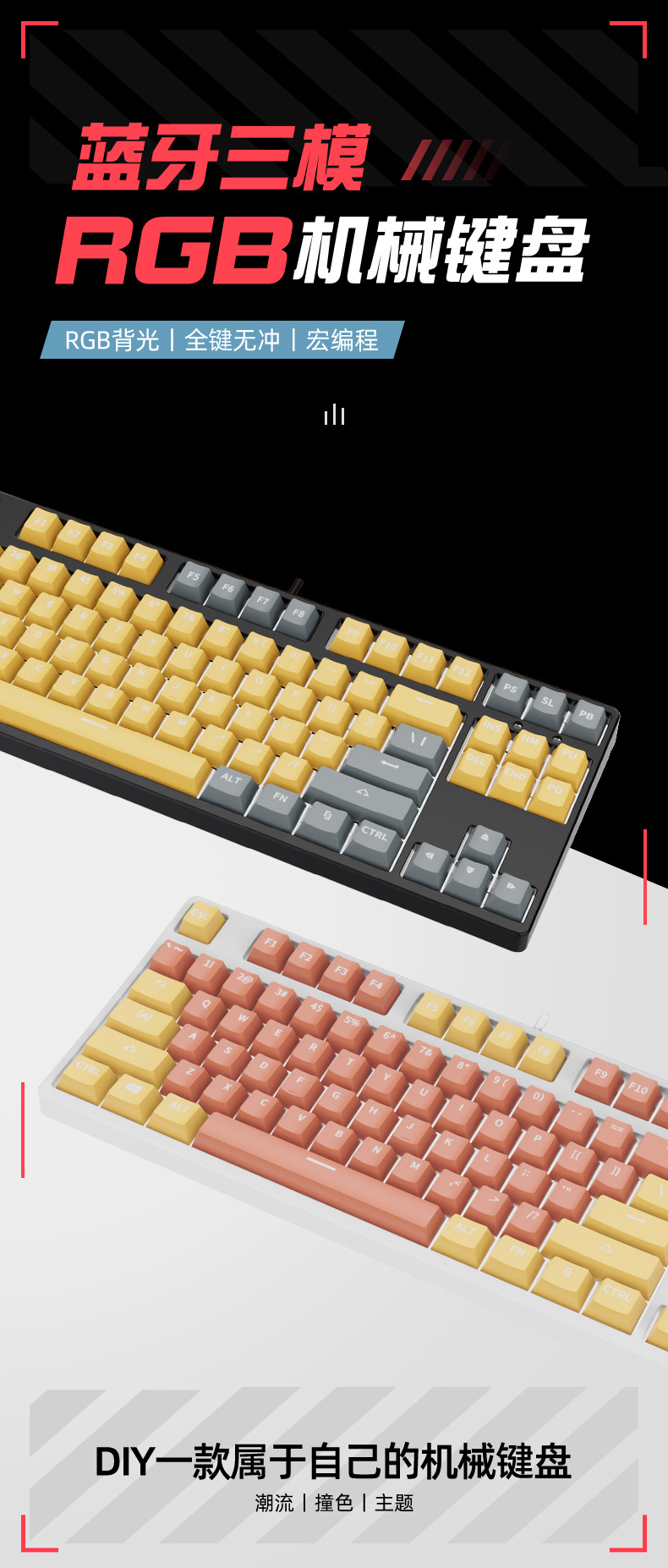 • 87 키 블루투스 3 모드-검정색 배경-내부 노란색 및 외부 회색-RGB 조명