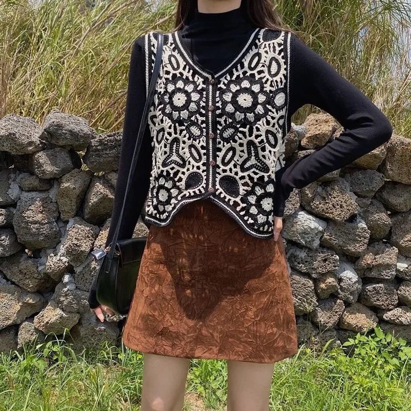 에스닉 자수 조끼 가디건 V 넥 중공 민소매 짧은 조끼 여성 탑