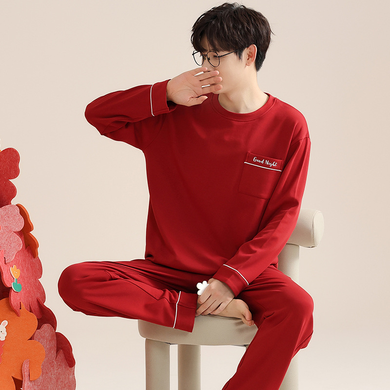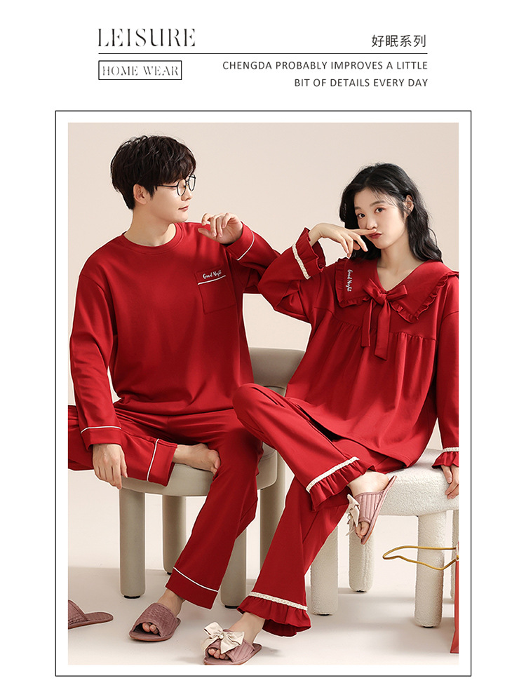 빨간 커플 잠옷 여자의 봄과 가을 새로운 면 긴 소매 남자의 새해 결혼식 플러스 사이즈 가정 옷 세트